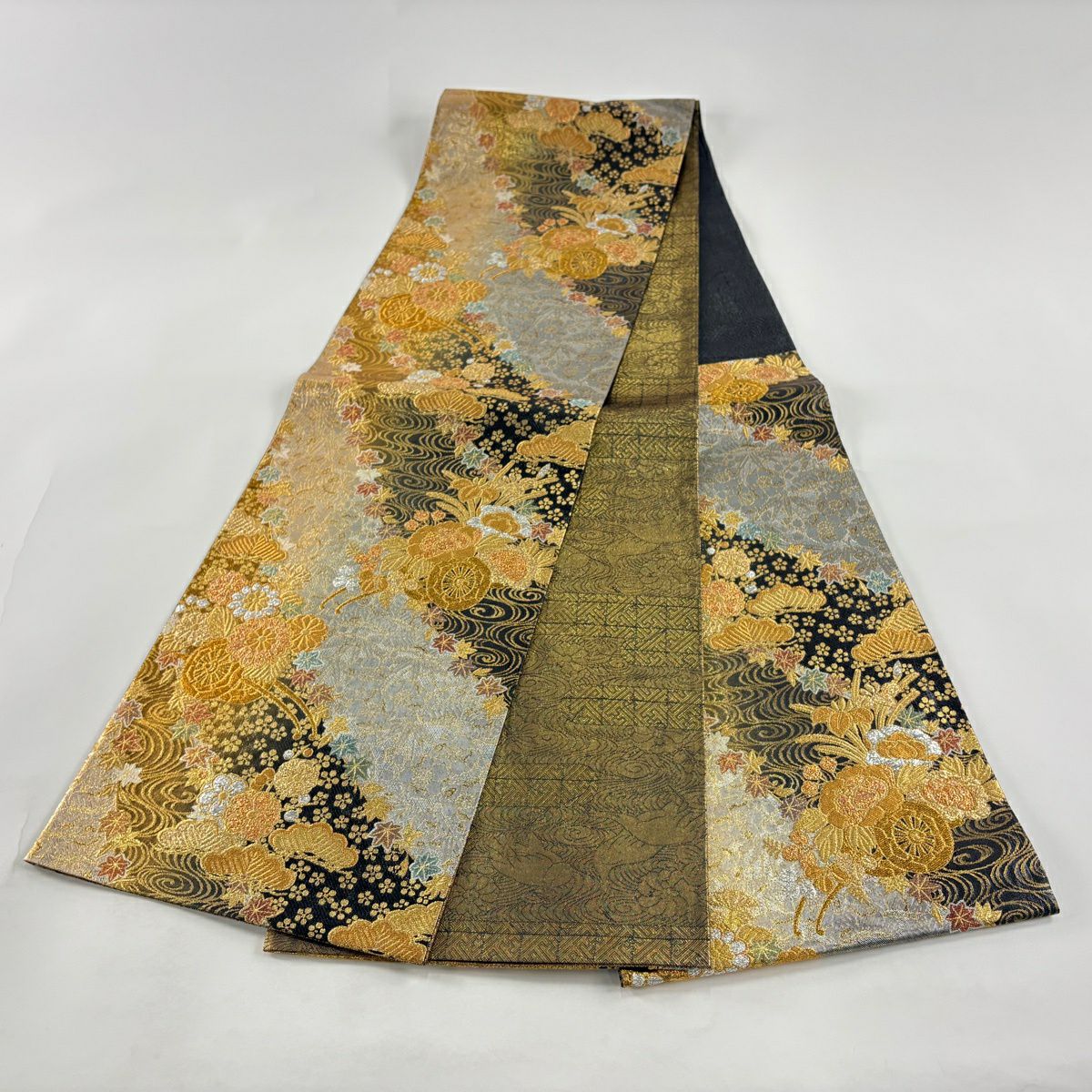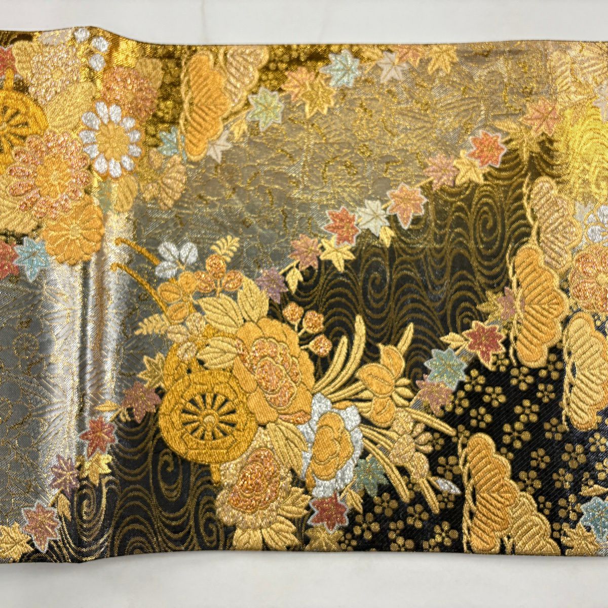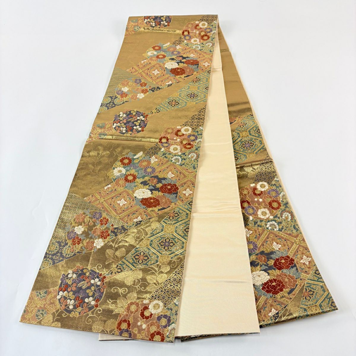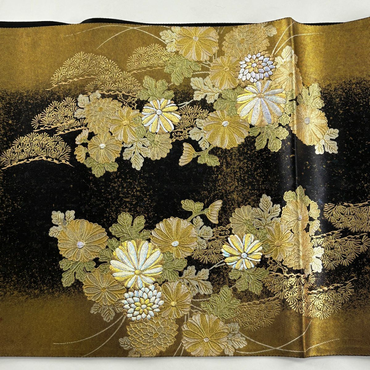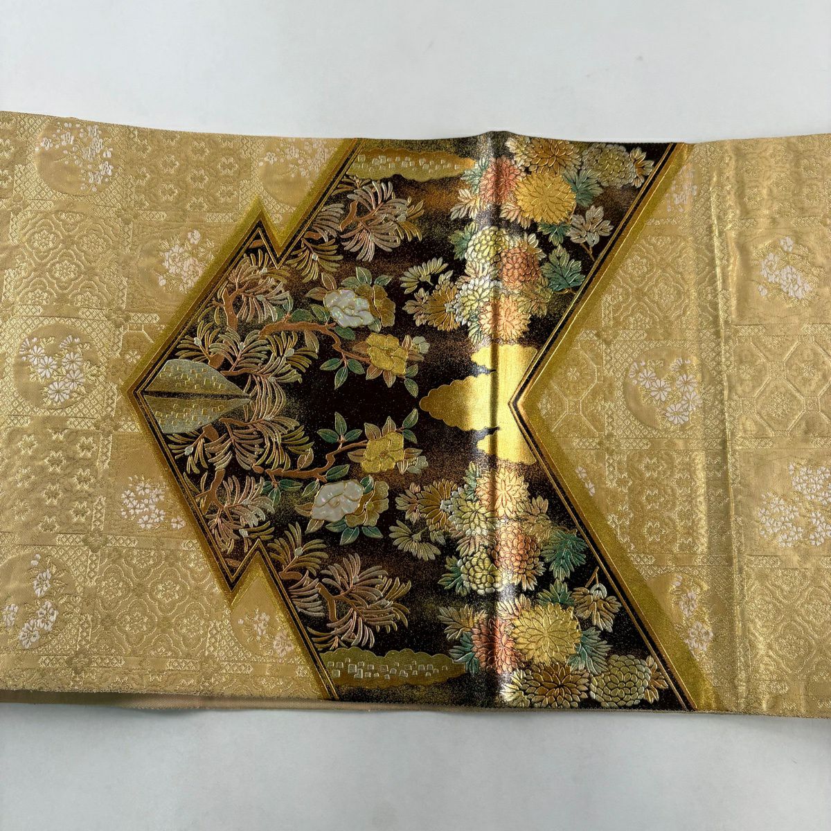 【美品】 袋帯 秀品 華文 菊 金銀彩 箔 金色 お太鼓柄 正絹
