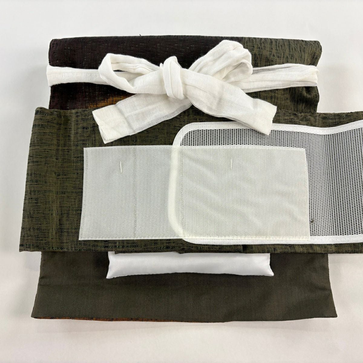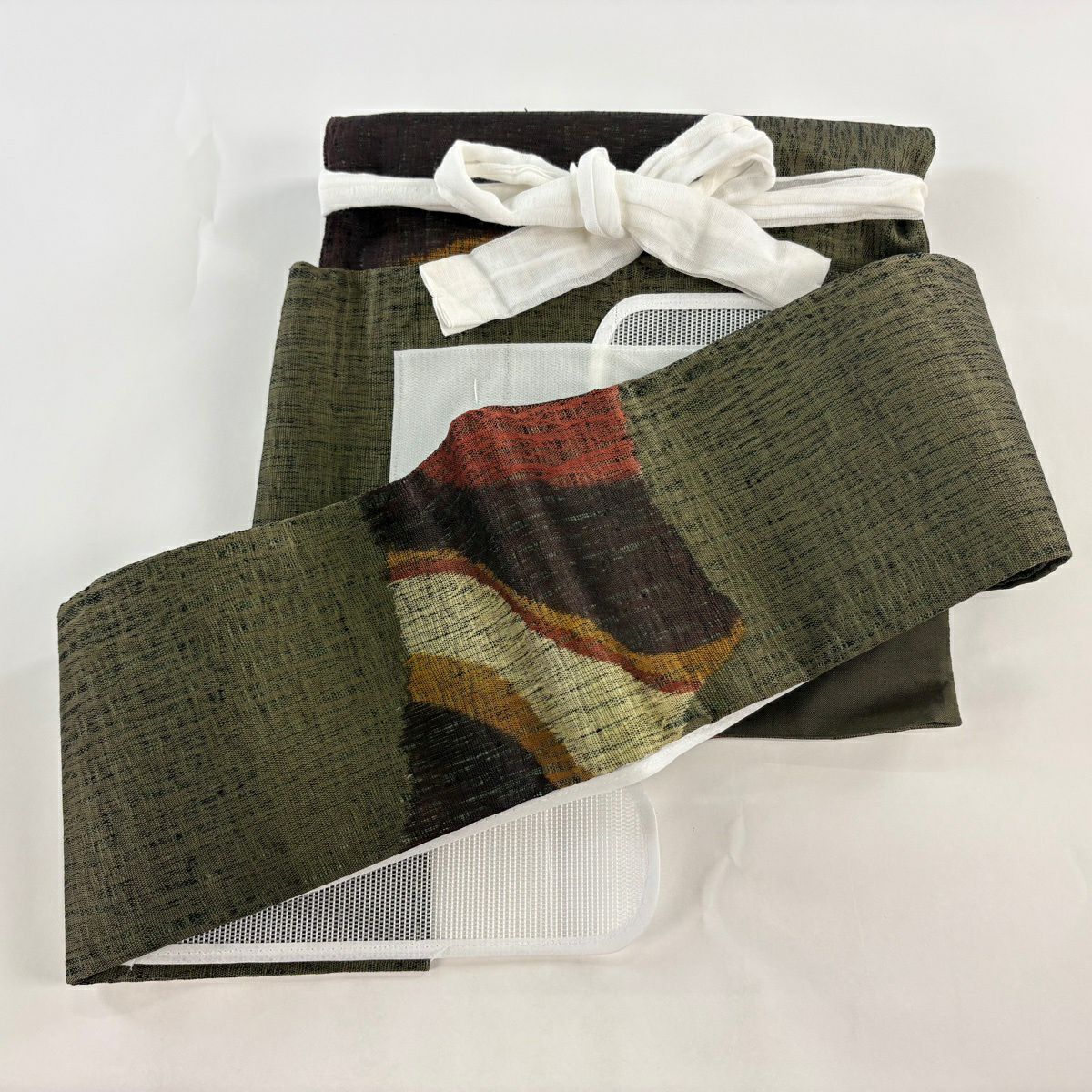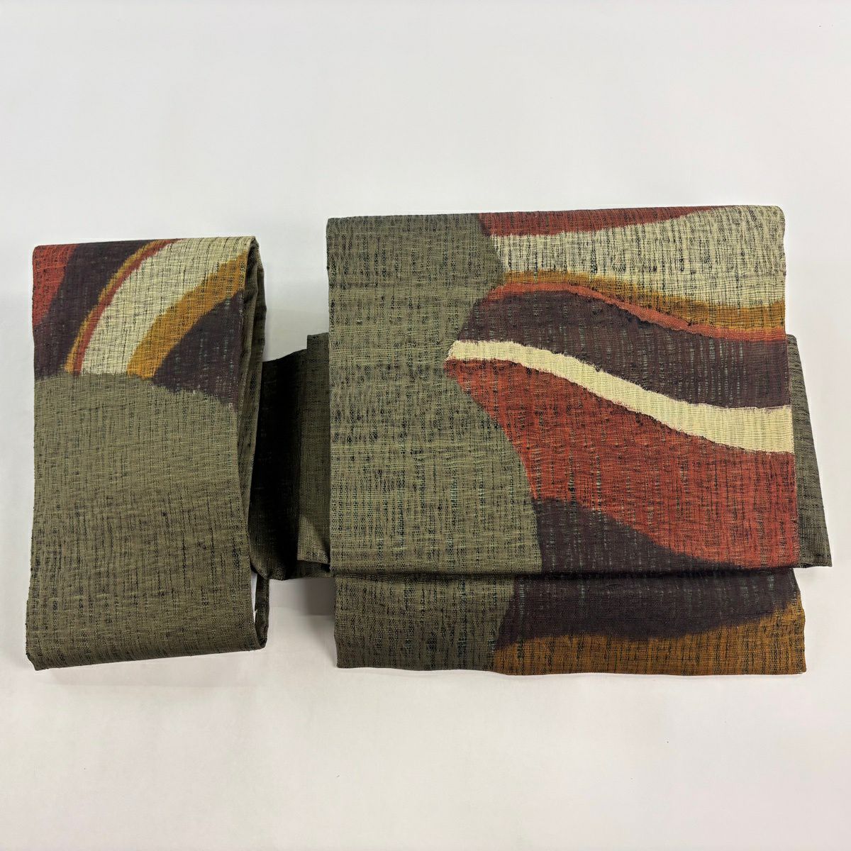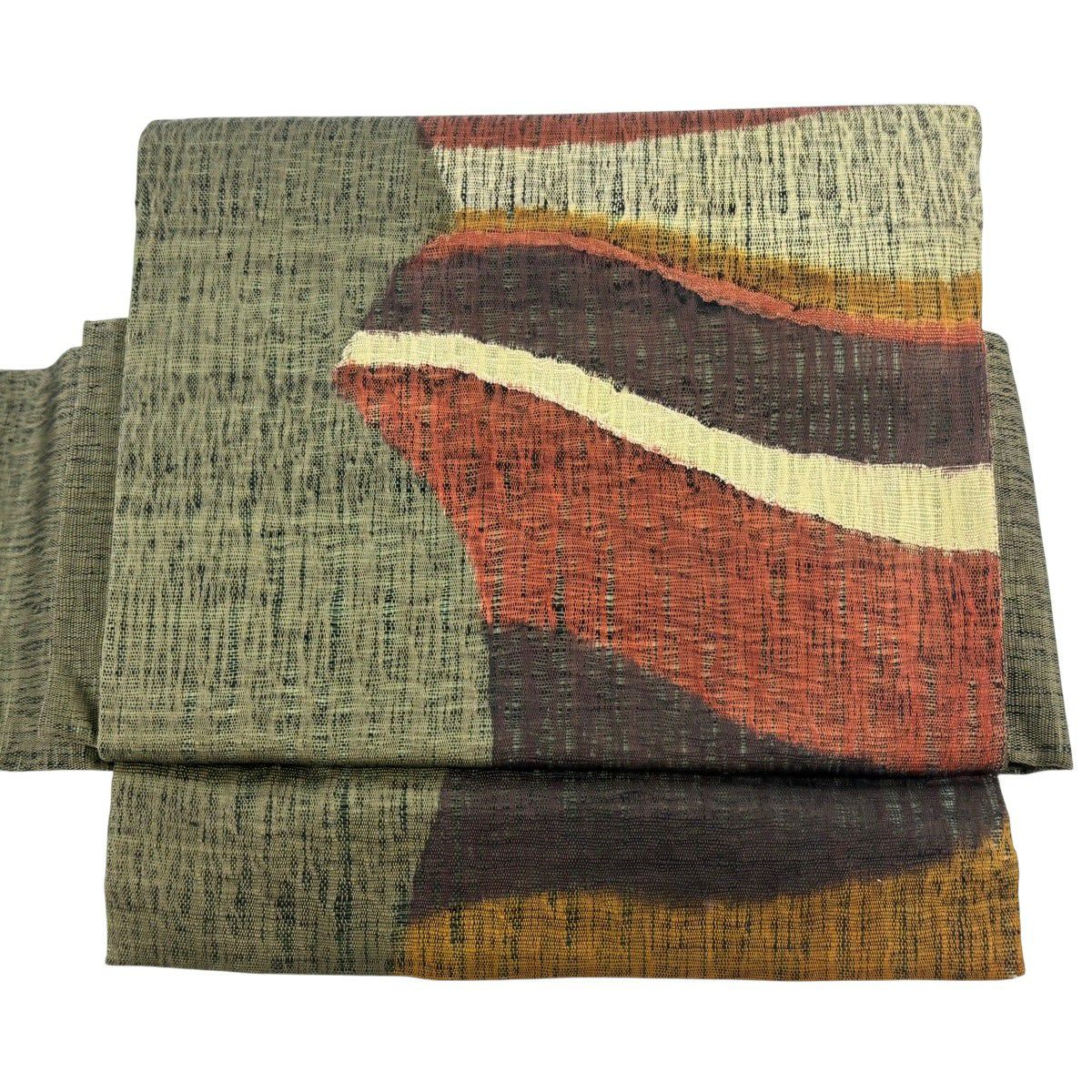 【美品】付け帯 秀品 作り帯 やまと 幾何学模様 茶緑色 正絹
