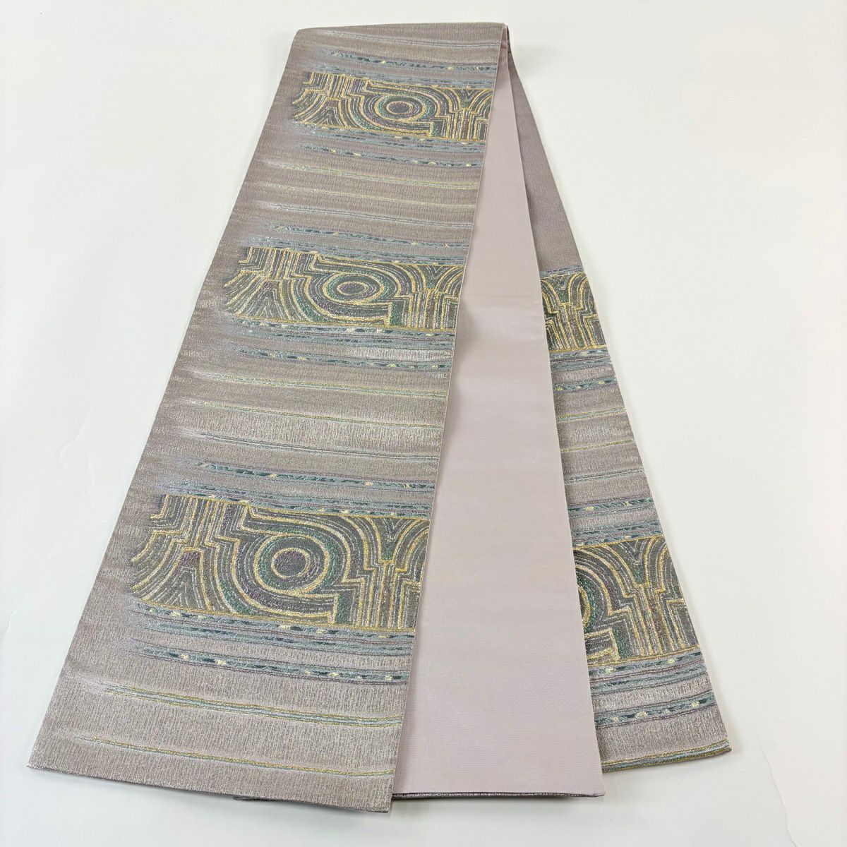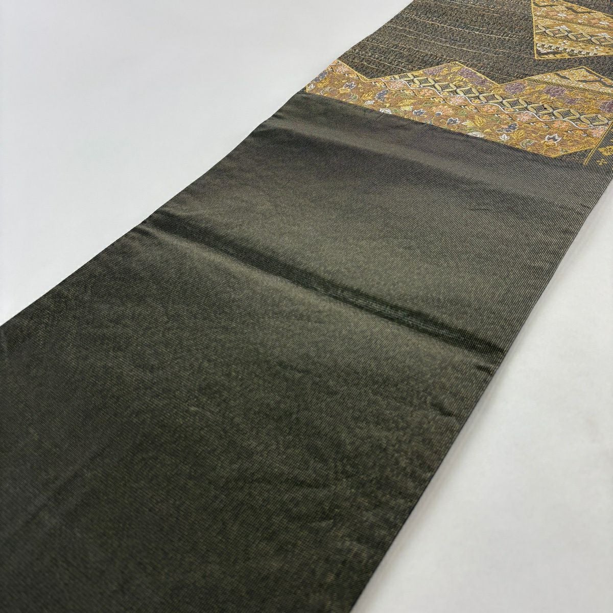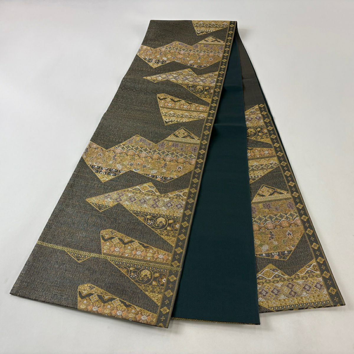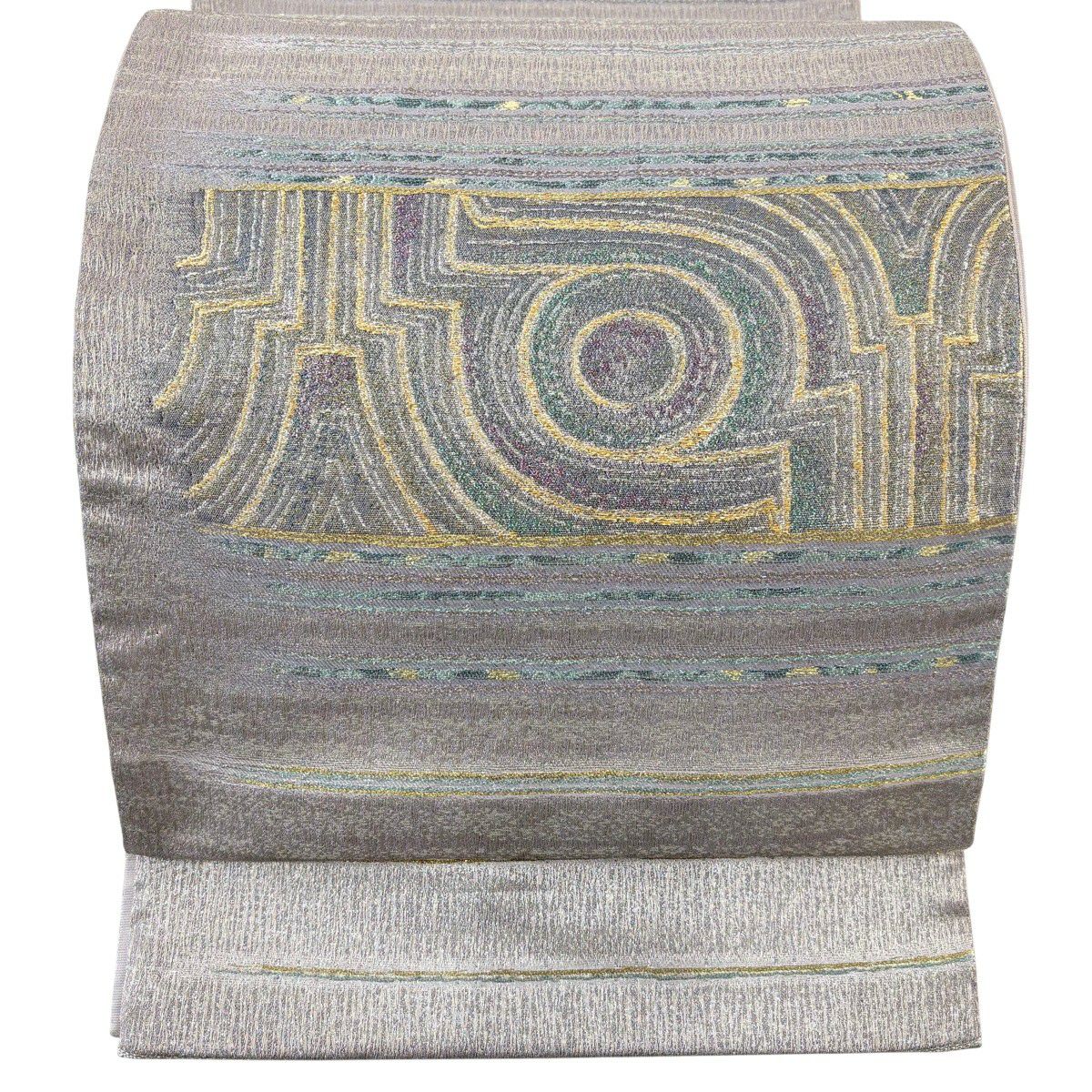 【美品】 袋帯 秀品 証紙あり 幾何学 金糸 灰緑 六通 正絹