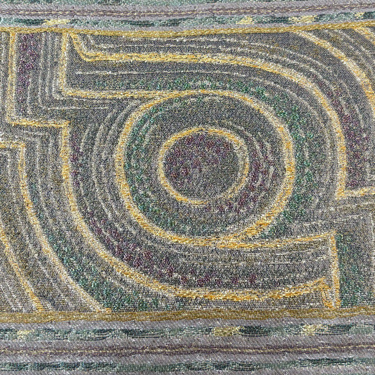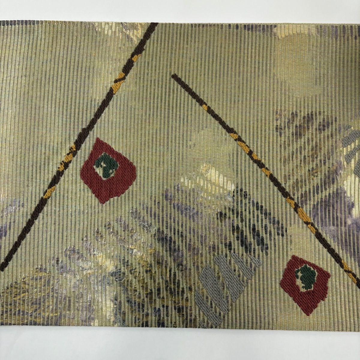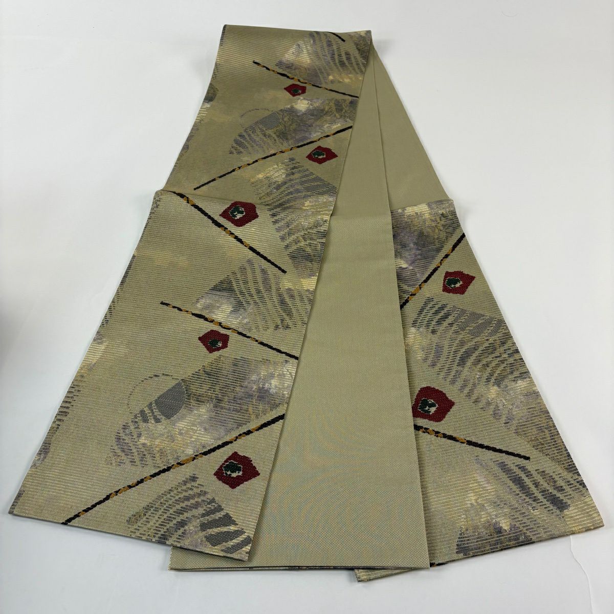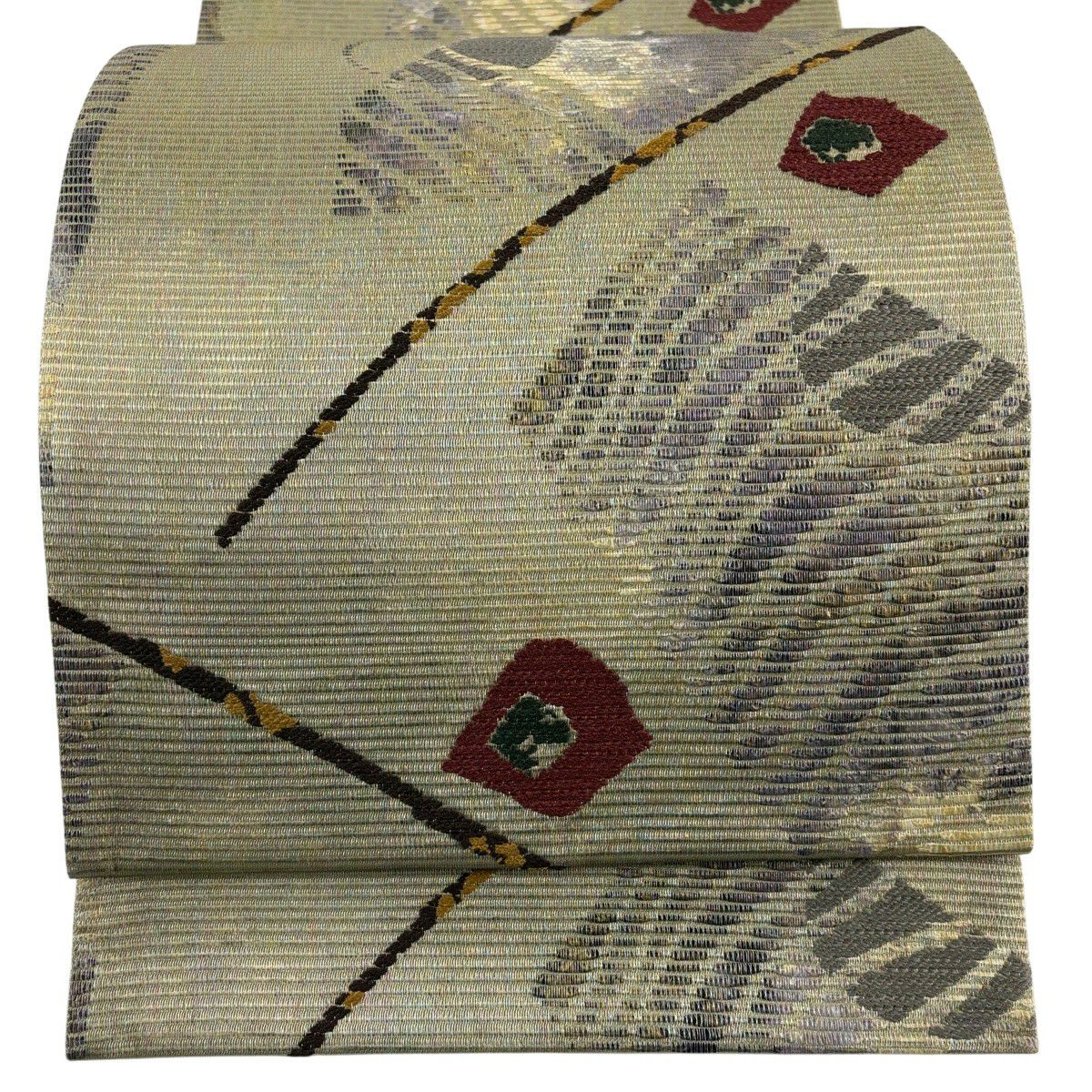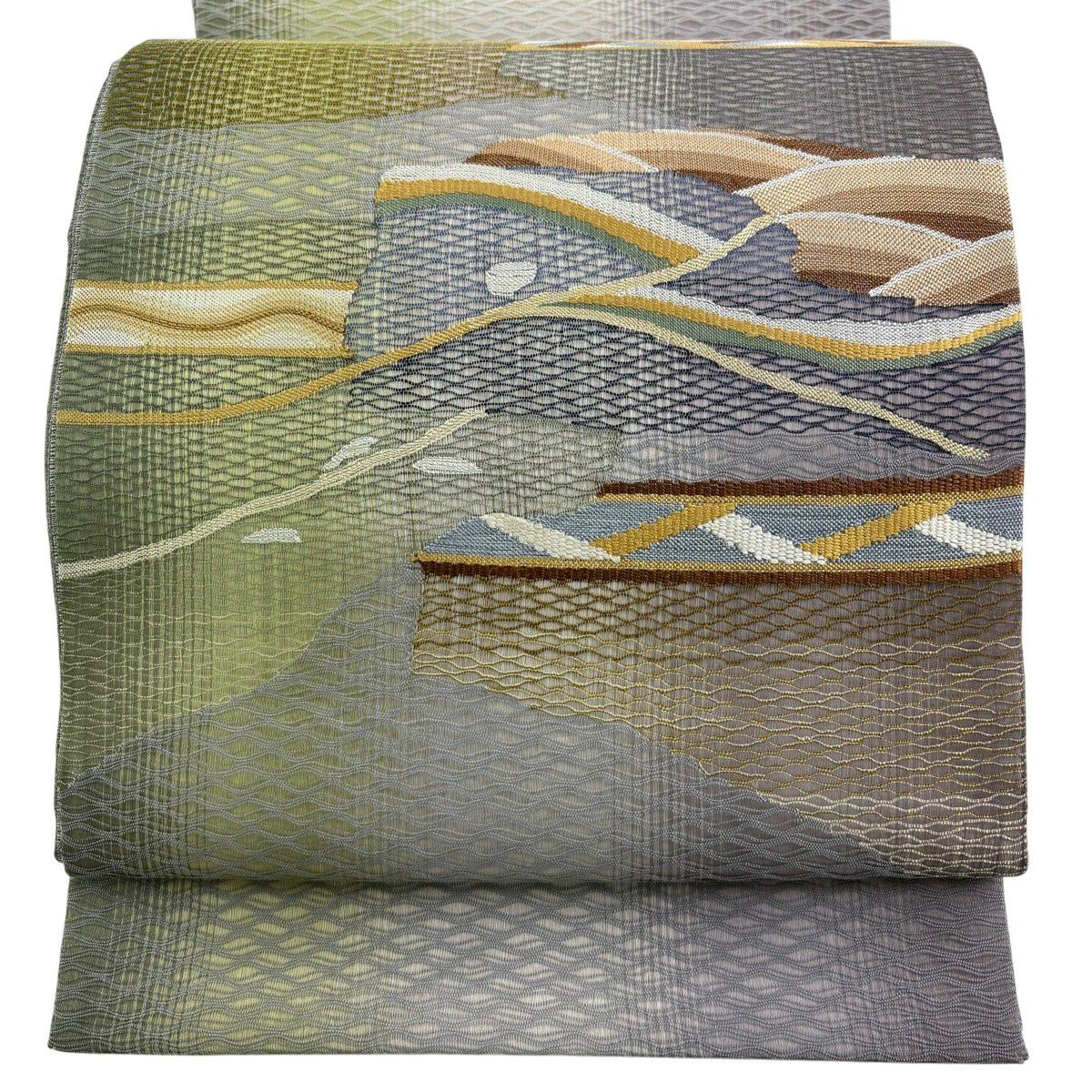 【美品】 袋帯 秀品 証紙あり 幾何学 金糸 灰緑 六通 正絹