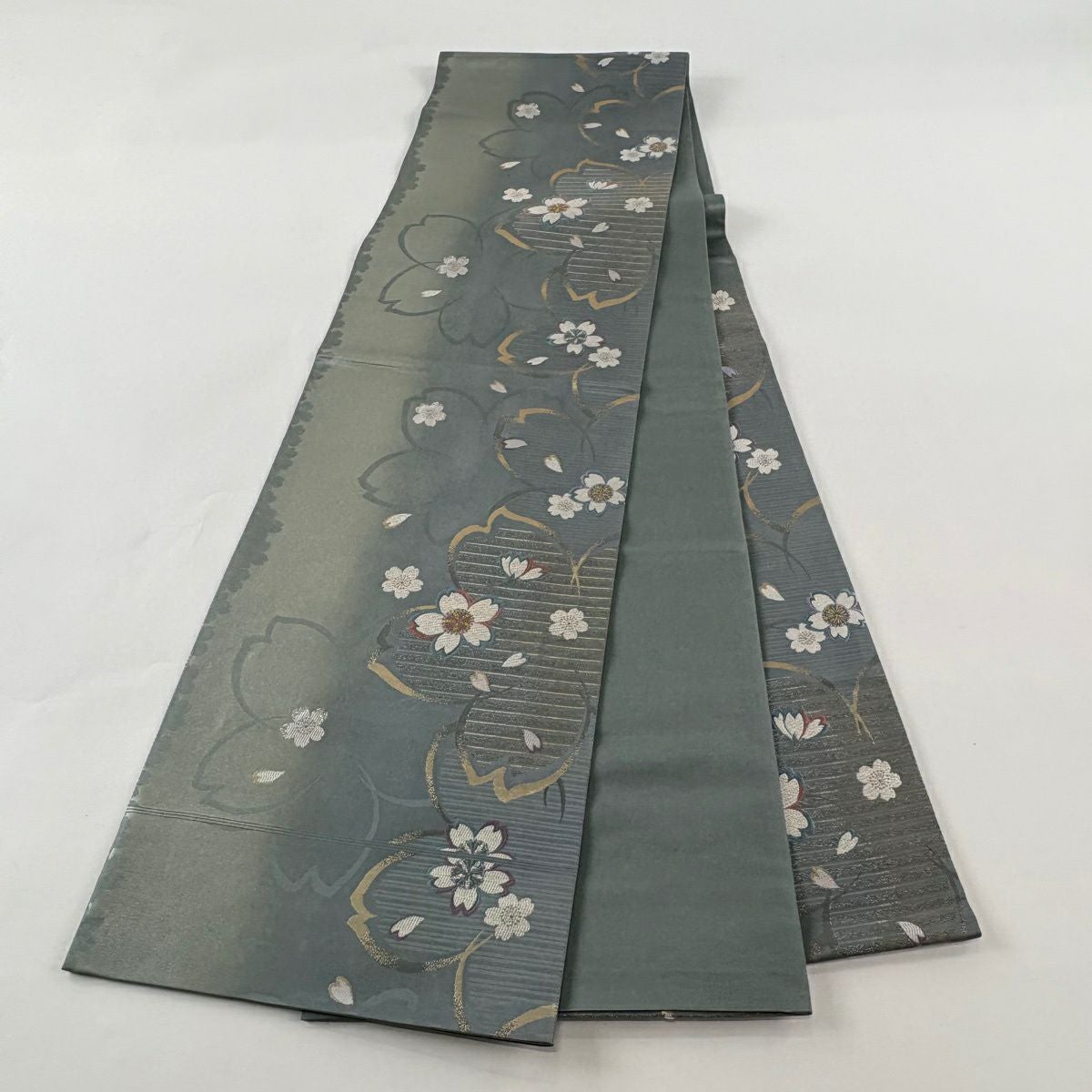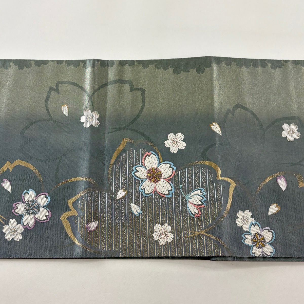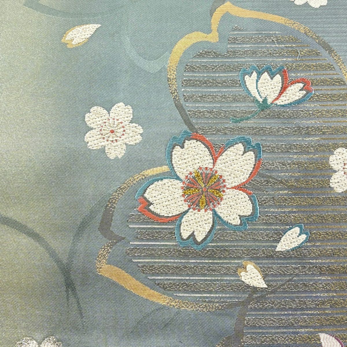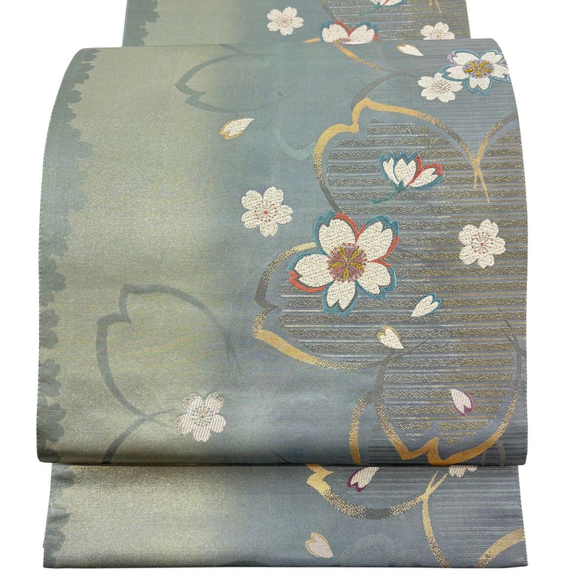 袋帯 秀品 やまと 桜 花びら 金銀糸 箔 青灰色 六通 正絹