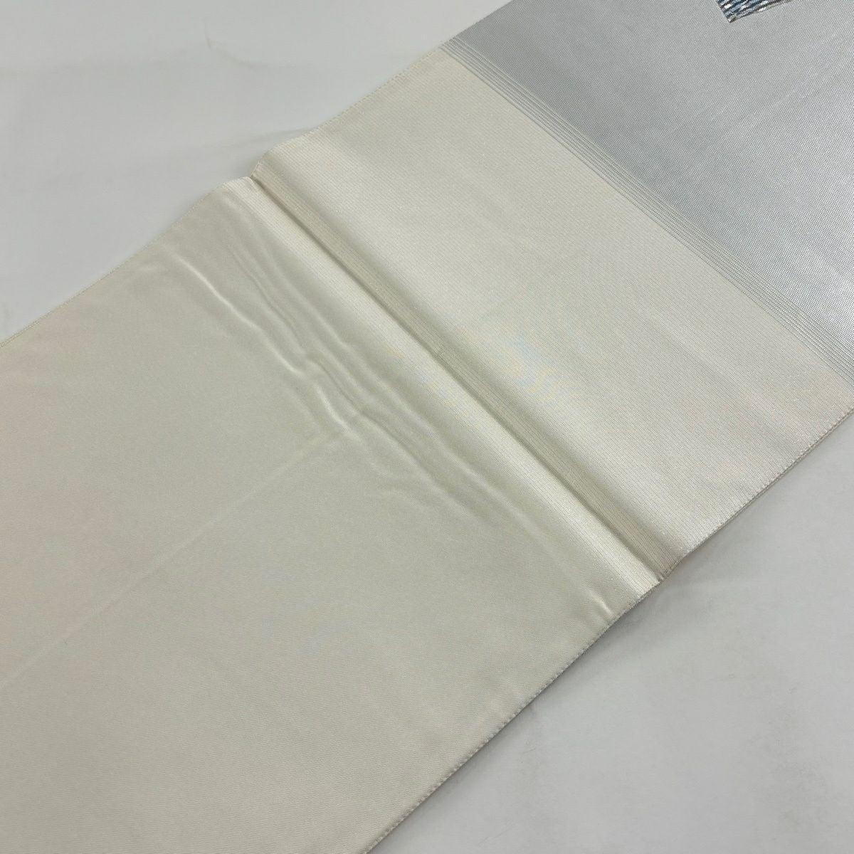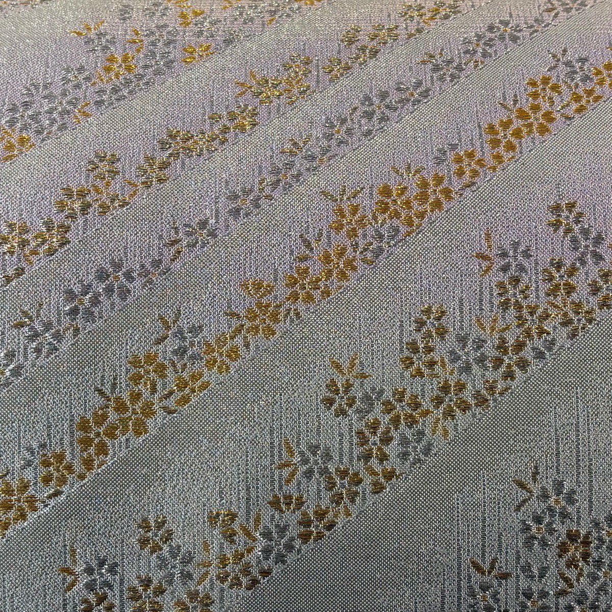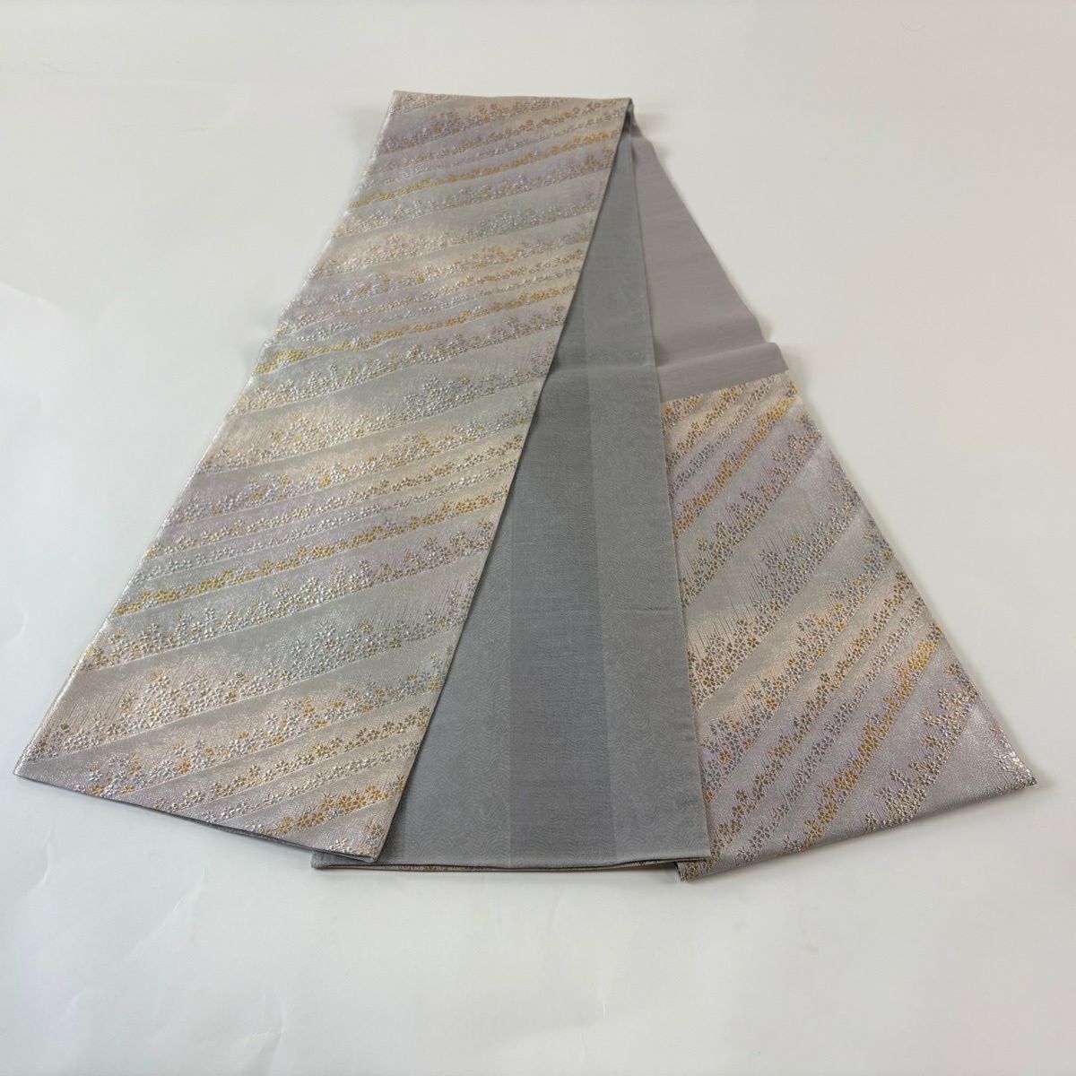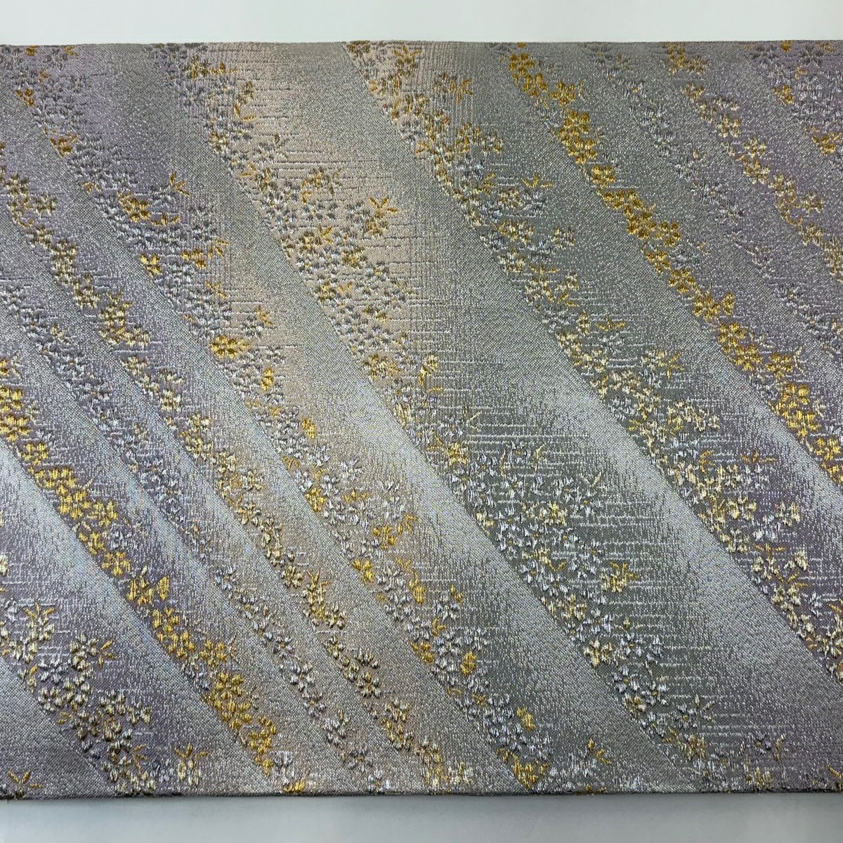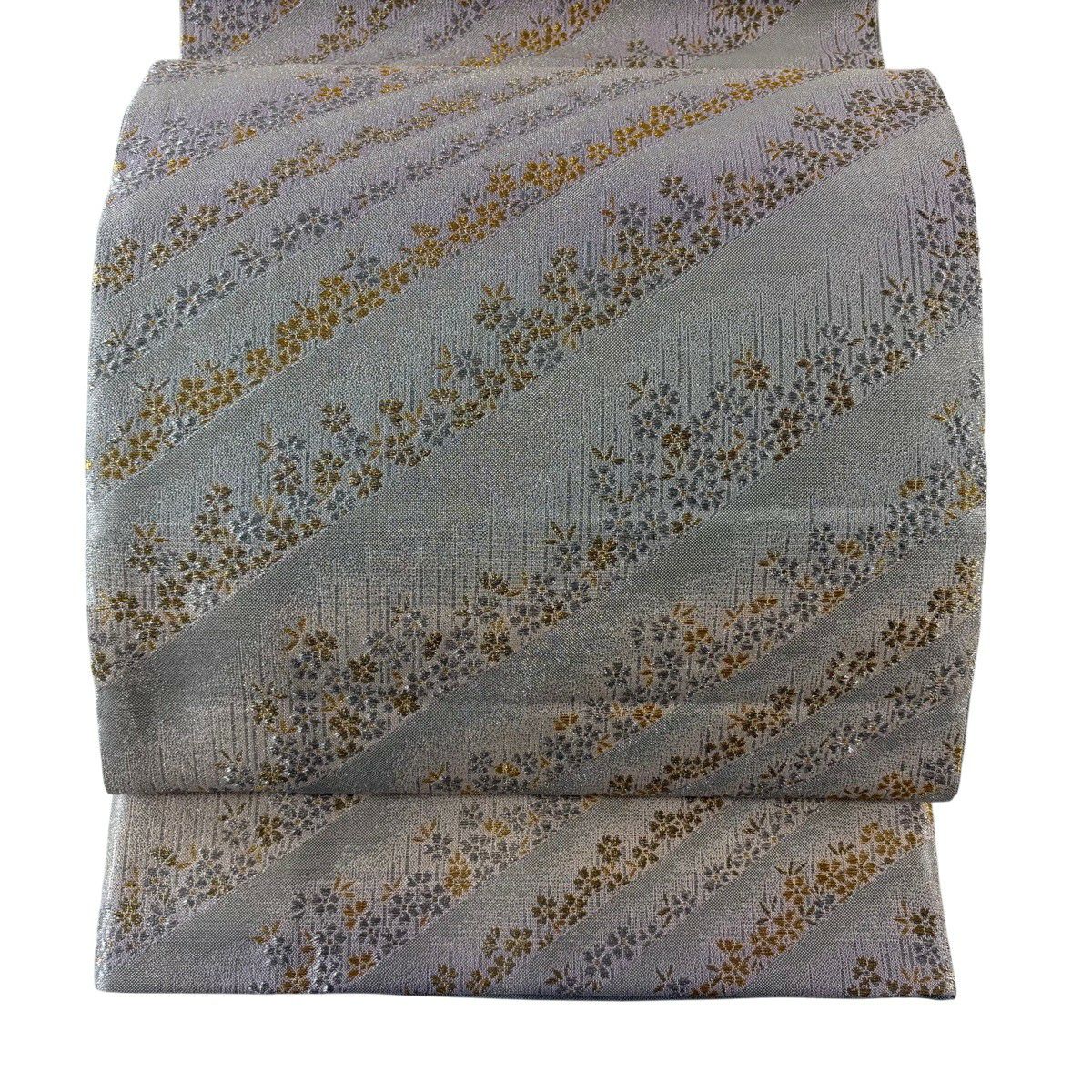 【美品】 袋帯 秀品 斜縞 小花 金銀糸 箔 銀色 六通 正絹
