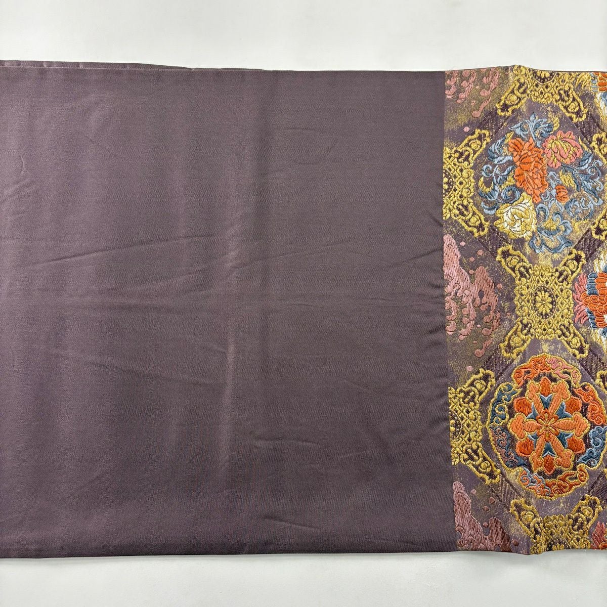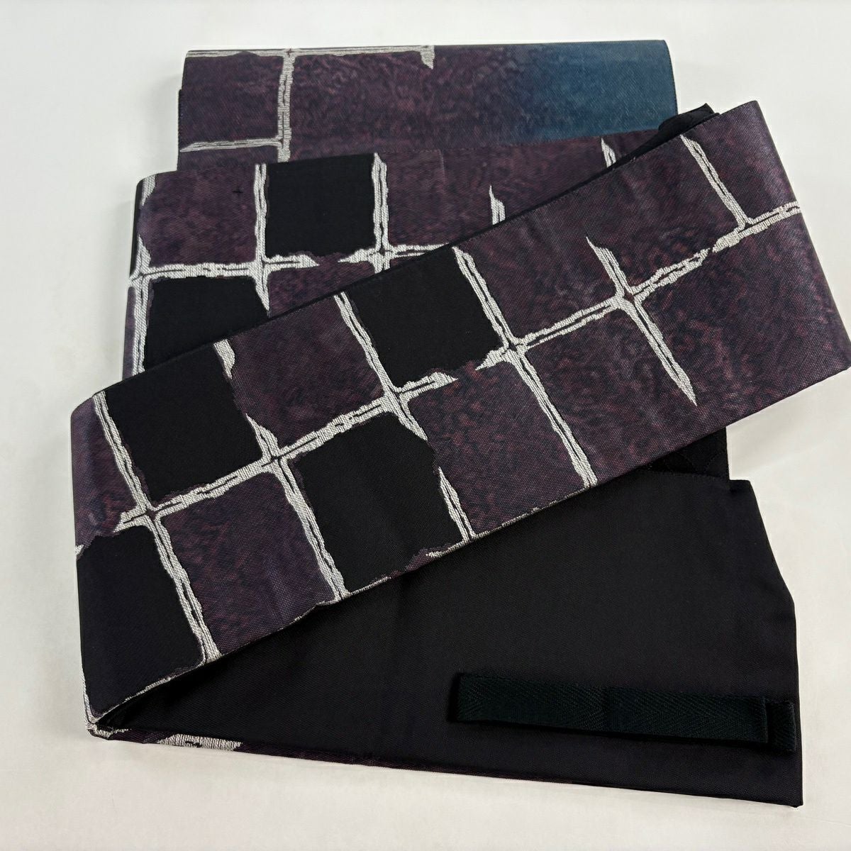 【美品】付け帯 秀品 作り帯 縮々織 格子 銀糸 箔 紫 正絹