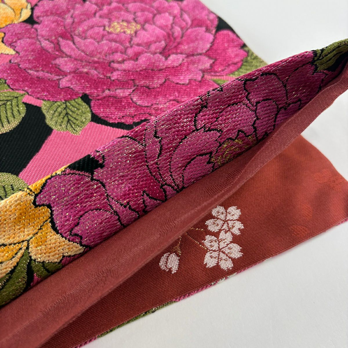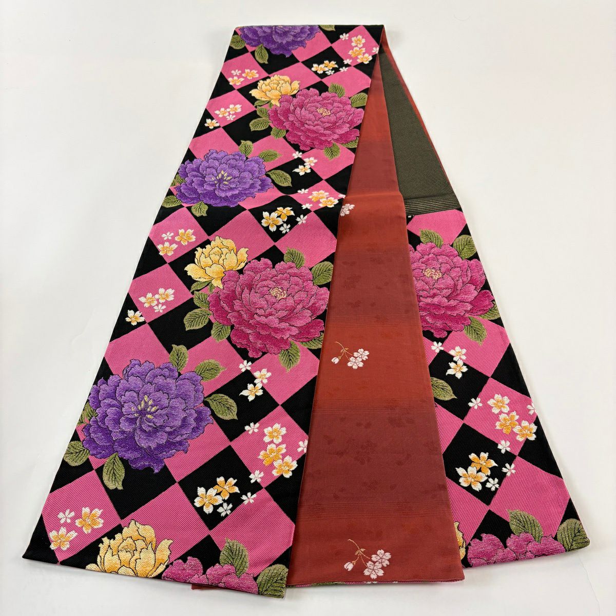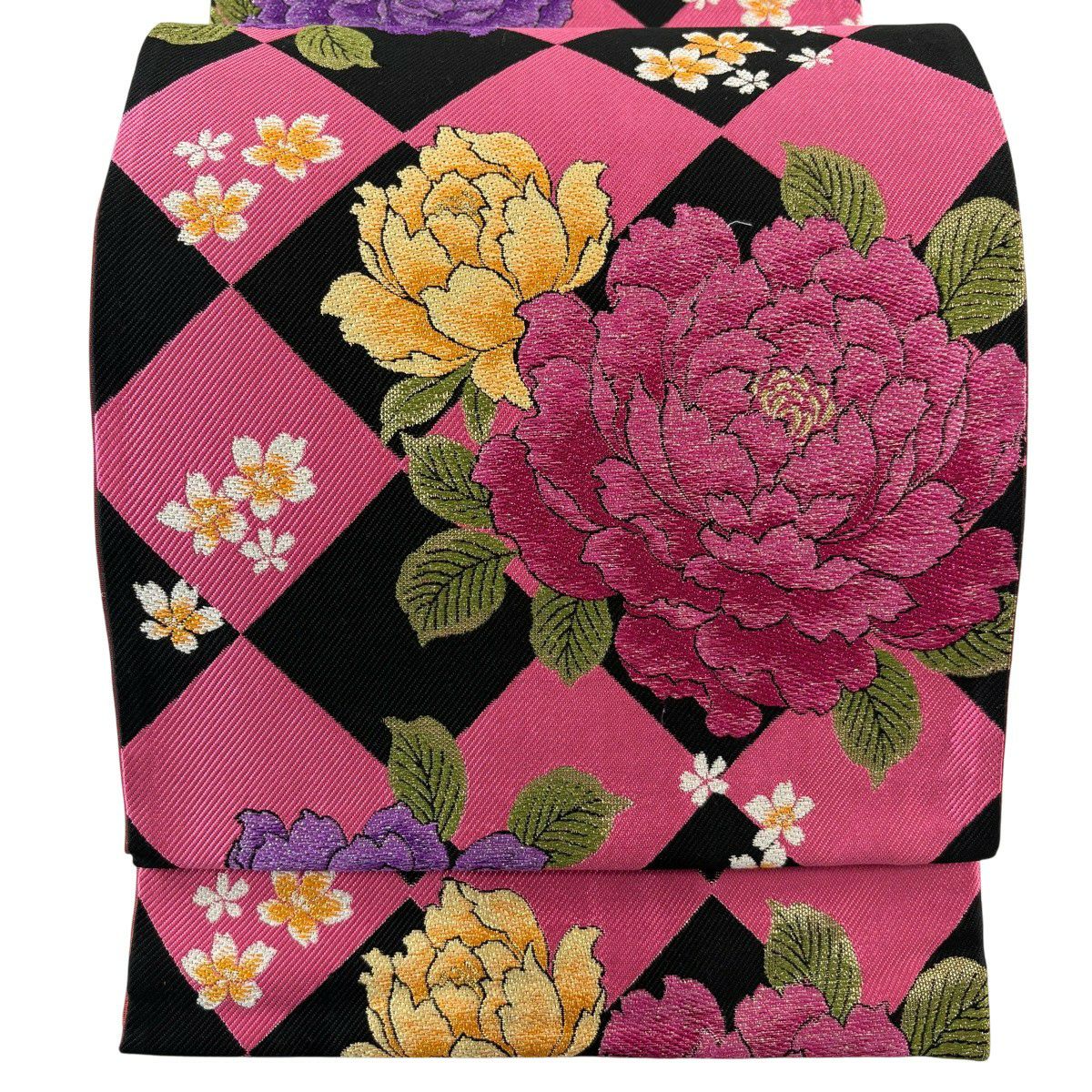 【美品】 袋帯 秀品 牡丹 桜 金糸 箔 ピンク 六通 正絹