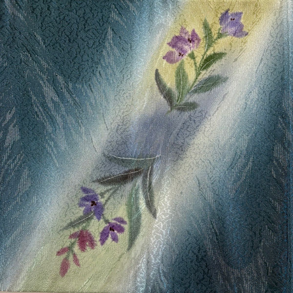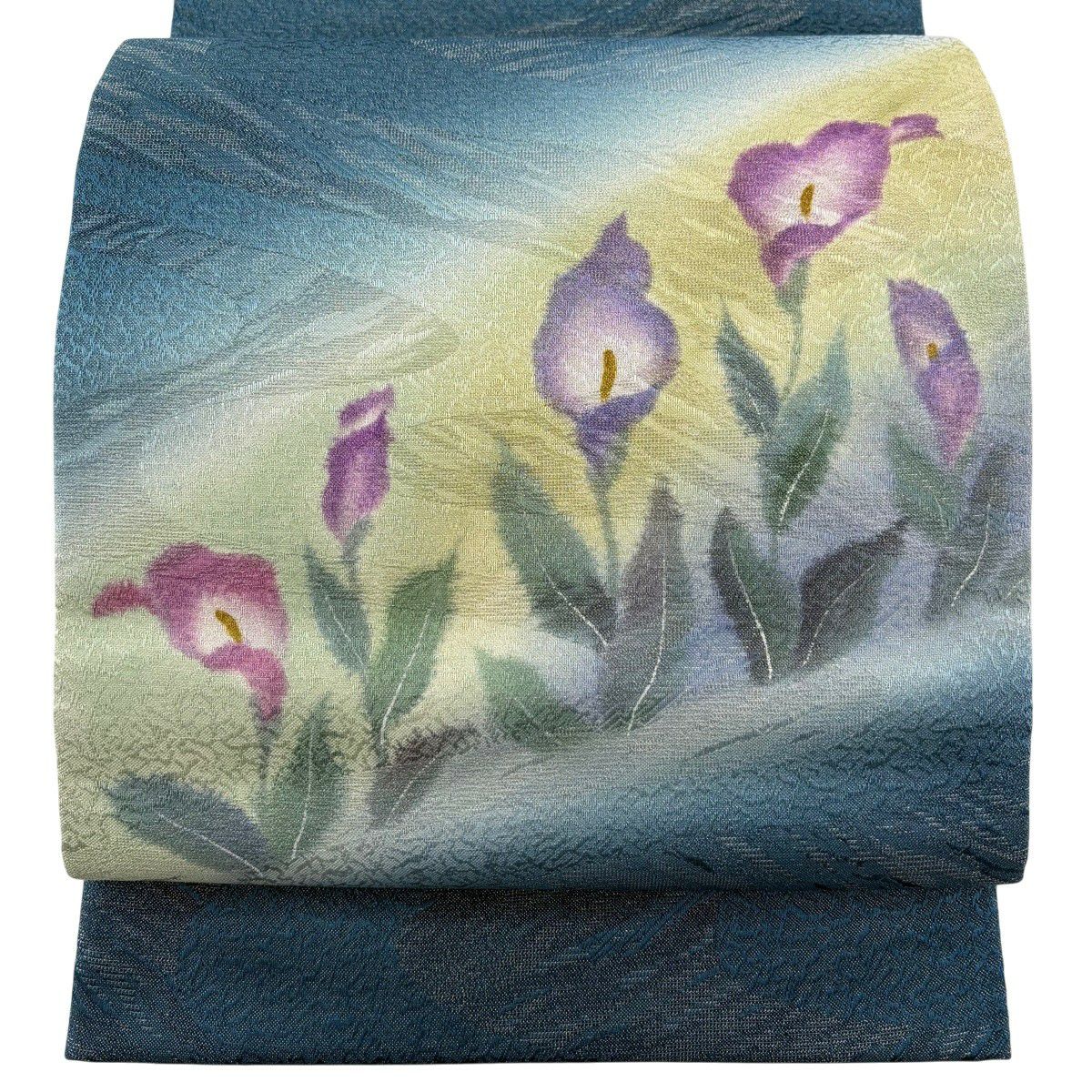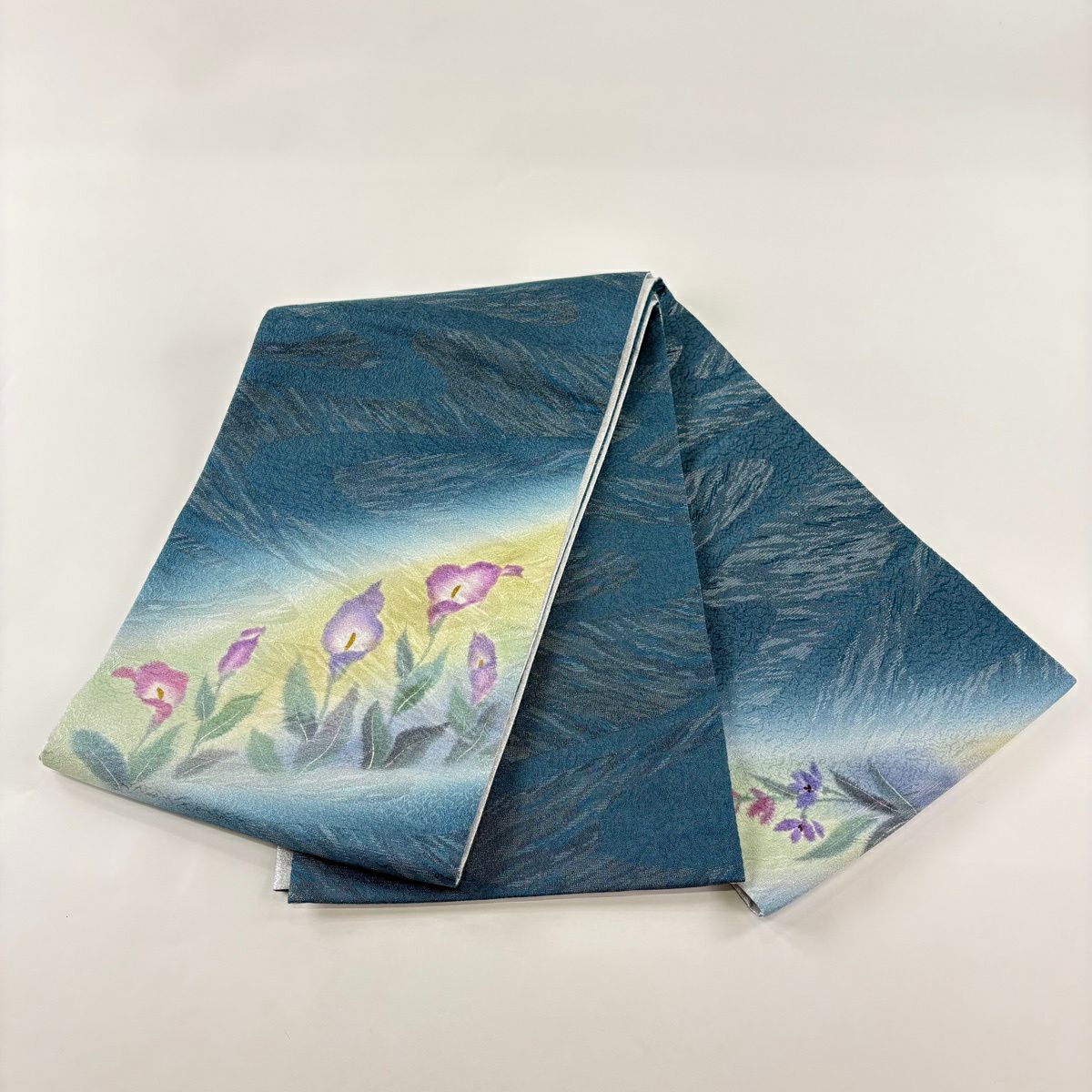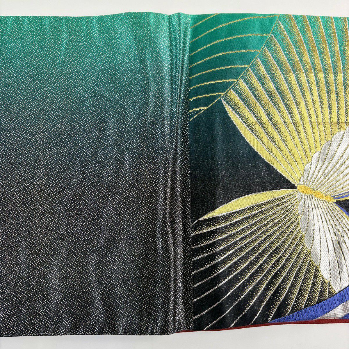 【美品】 袋帯 秀品 草花 銀糸 ぼかし 青緑 お太鼓柄 正絹