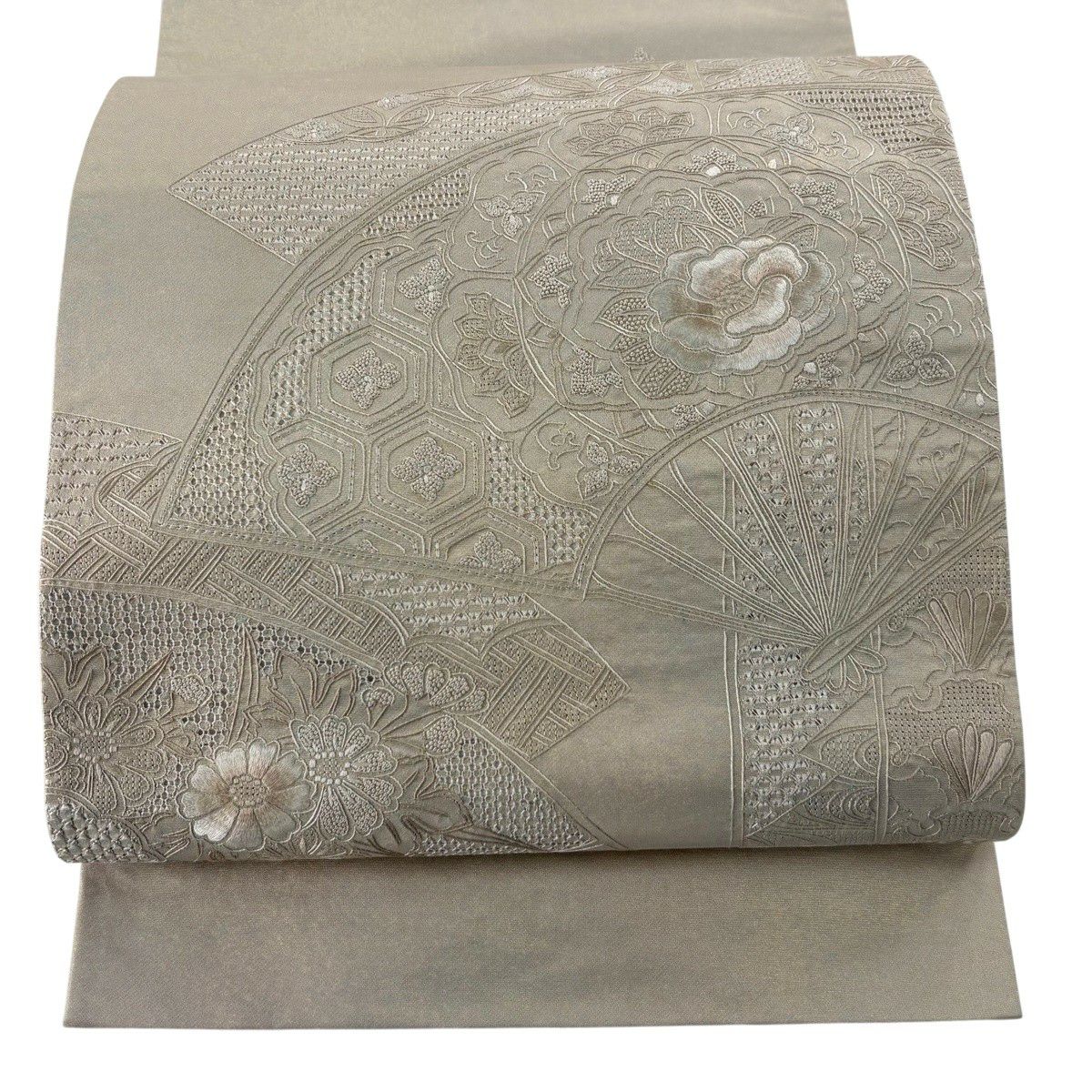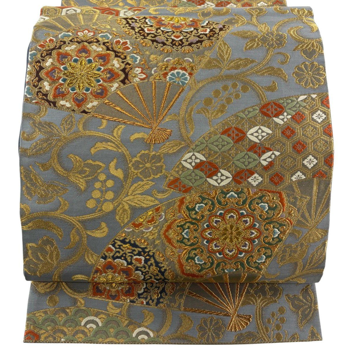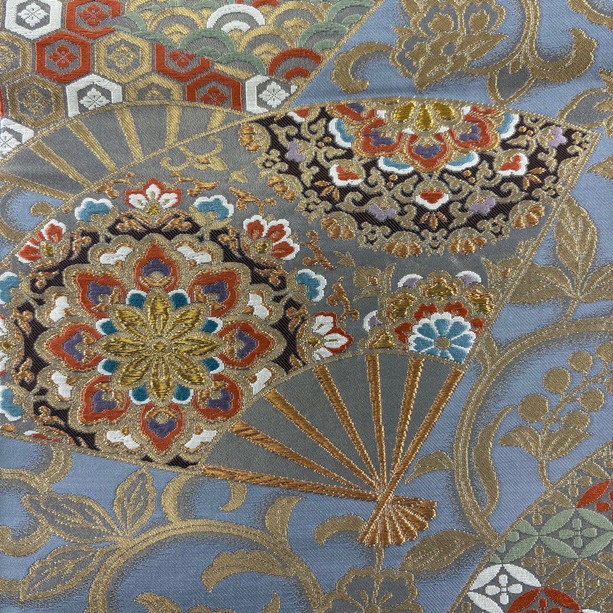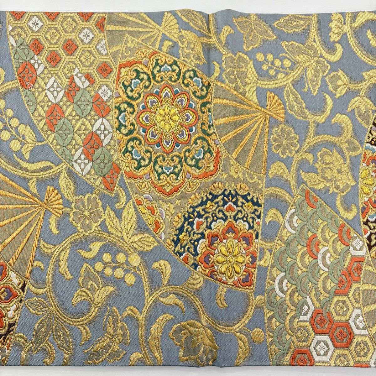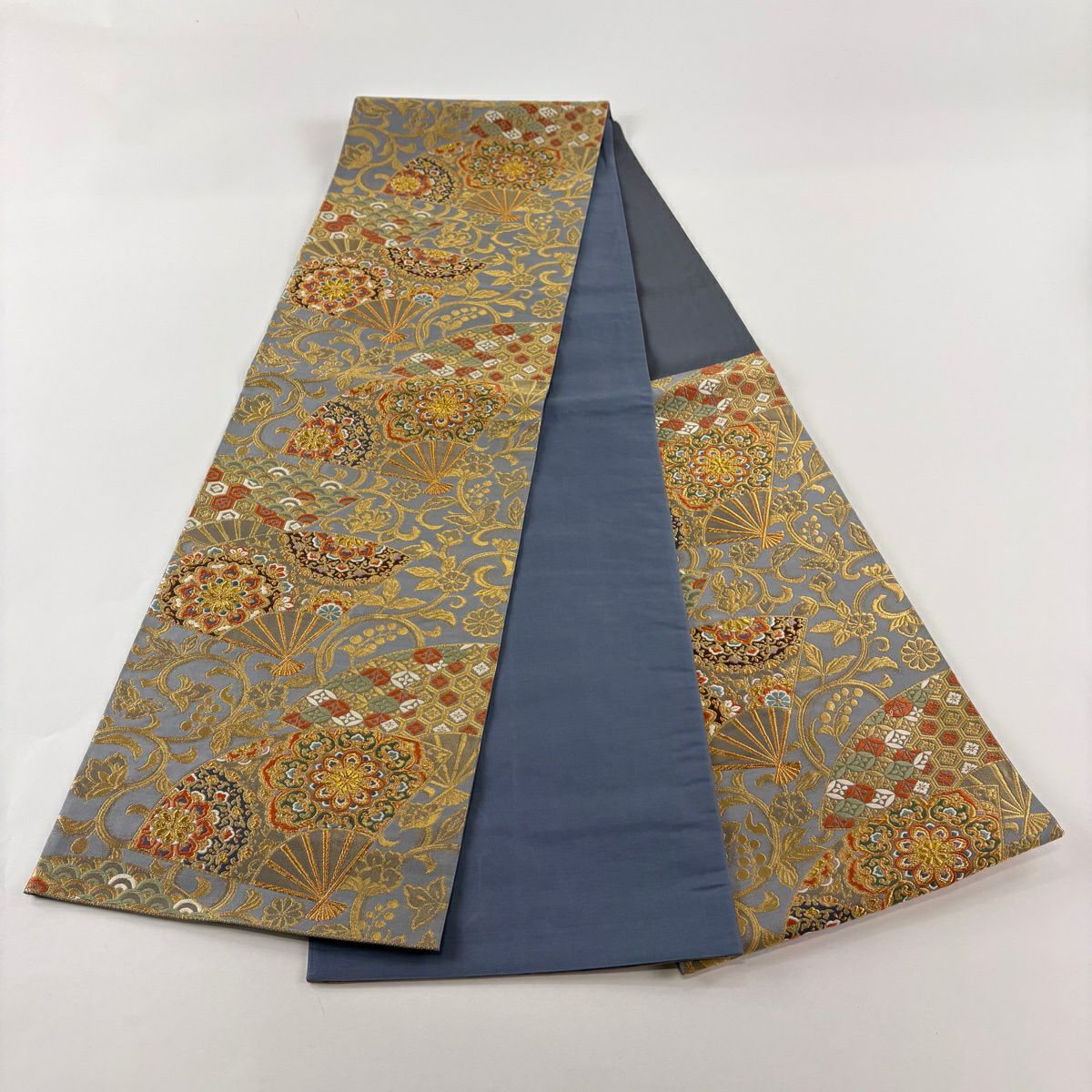【美品】 袋帯 秀品 扇 華文 刺繍 金糸 青灰色 六通 正絹