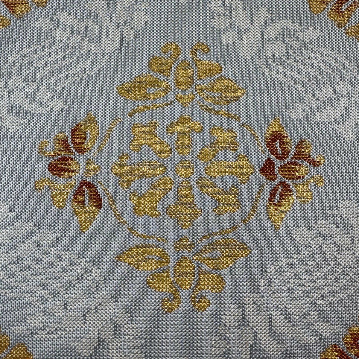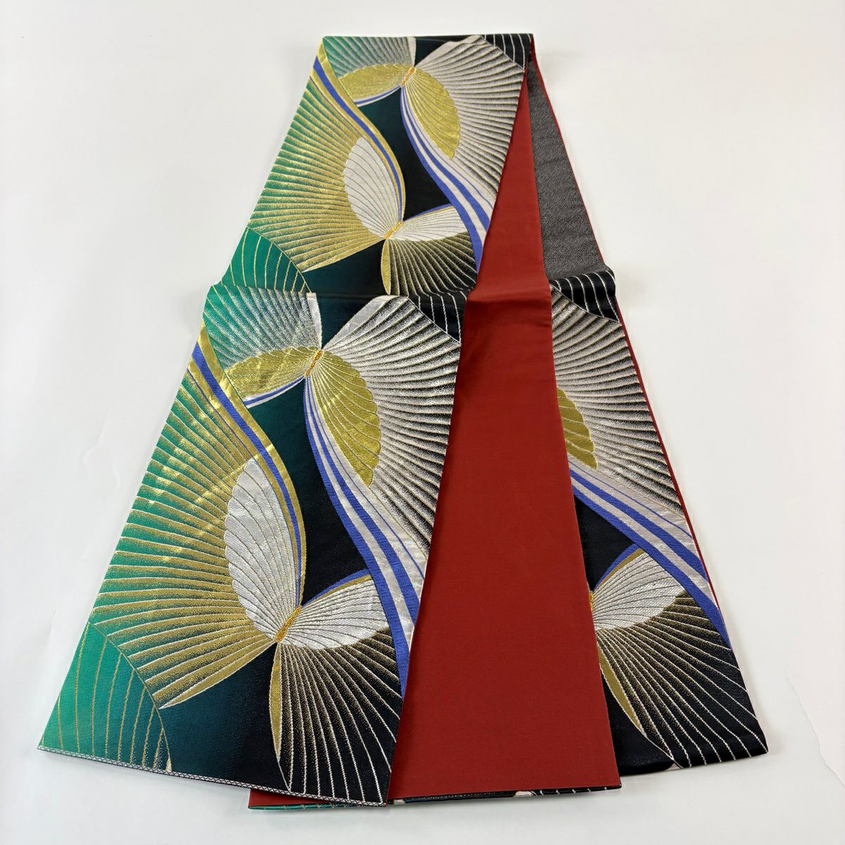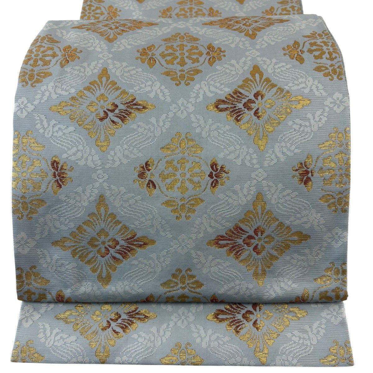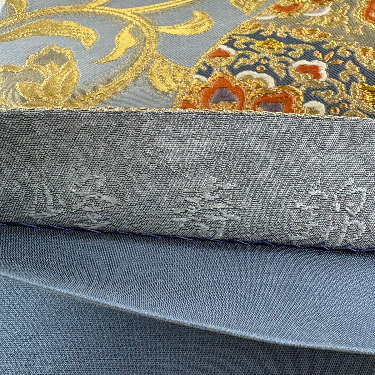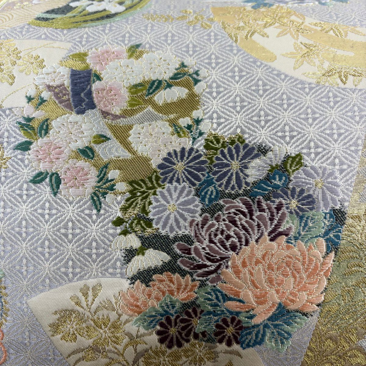 【美品】 袋帯 秀品 扇 華文 刺繍 金糸 青灰色 六通 正絹