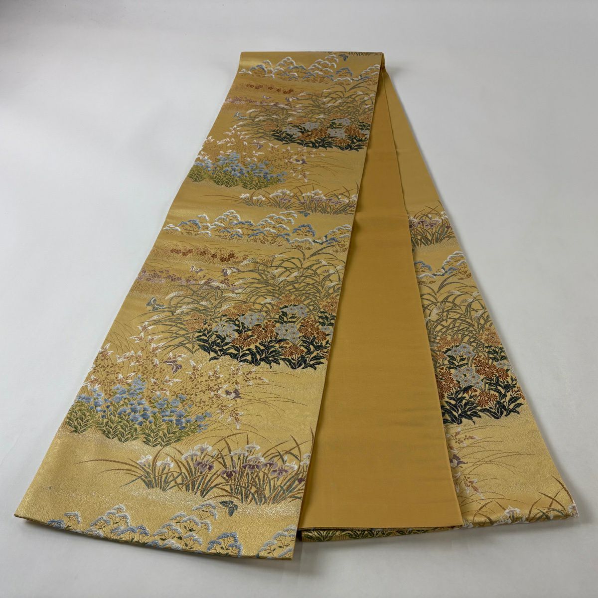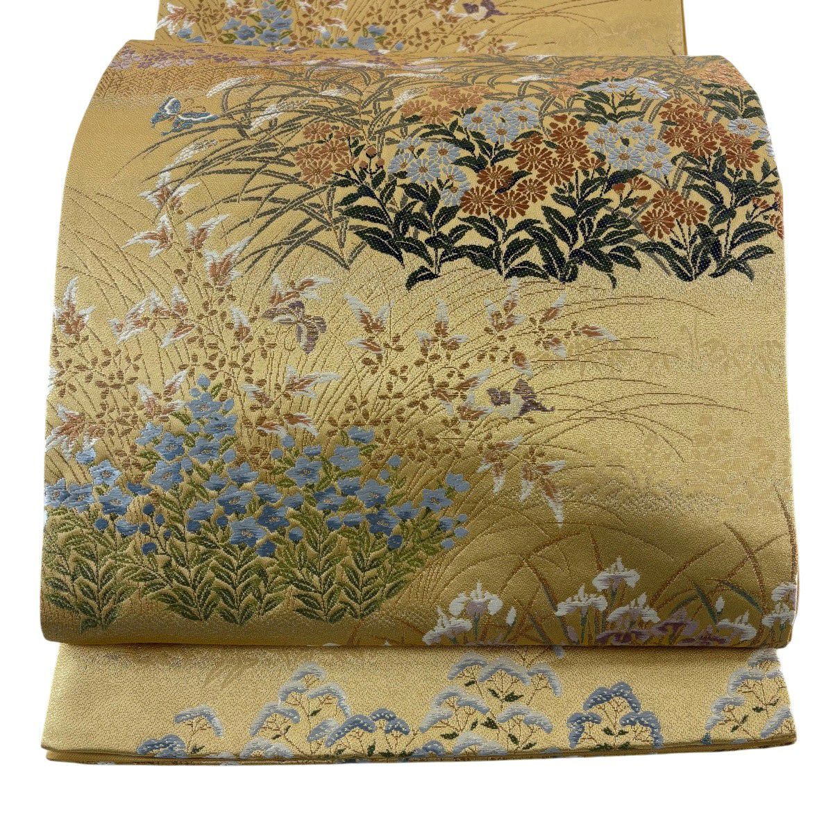 【美品】 袋帯 秀品 秋草 蝶 金銀糸 箔 黄土色 六通 正絹