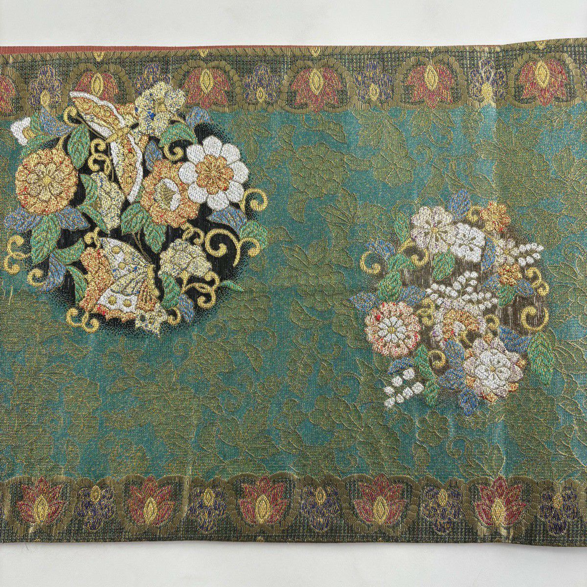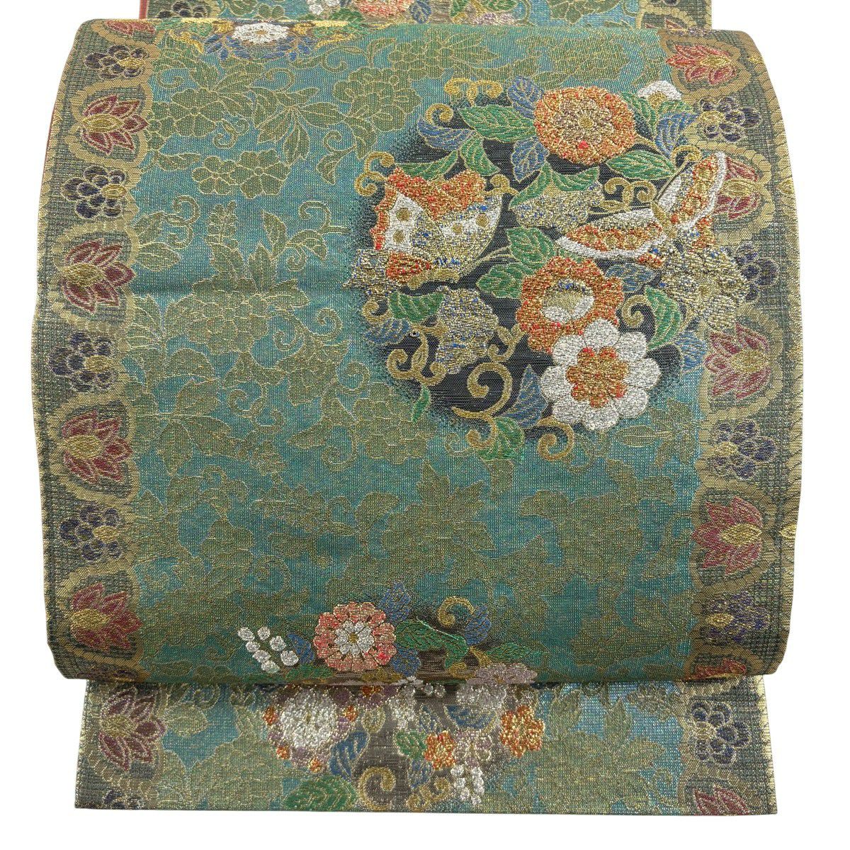【美品】 袋帯 秀品 花丸文 蝶 箔 金糸 薄青緑 六通 正絹