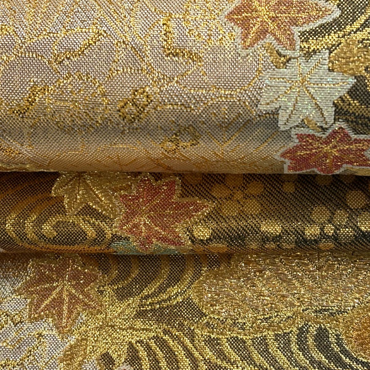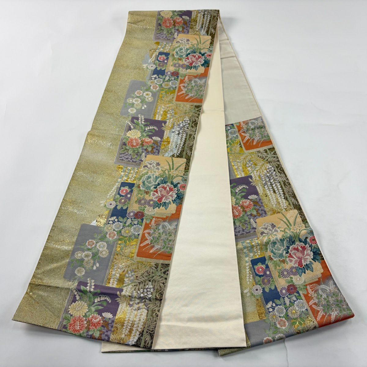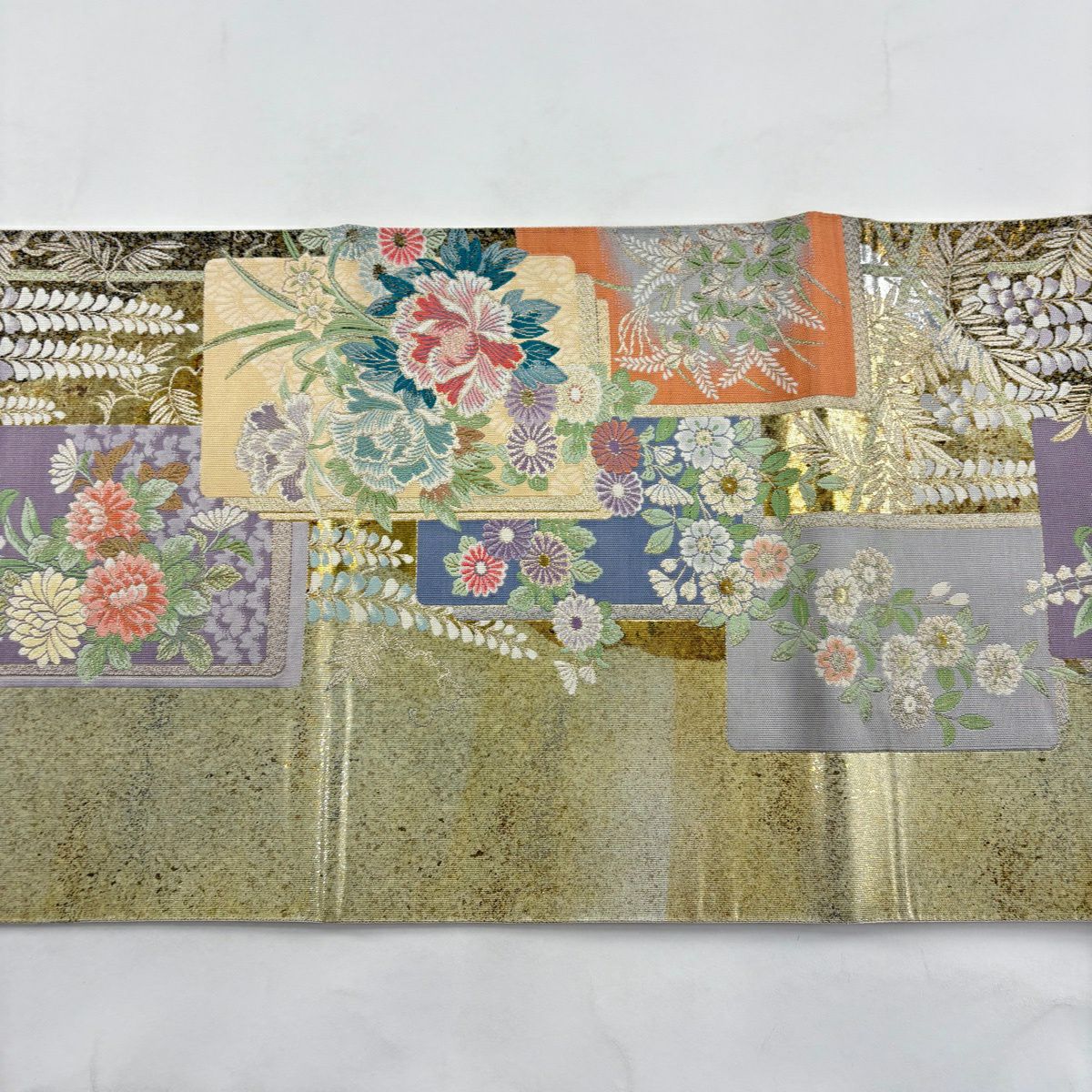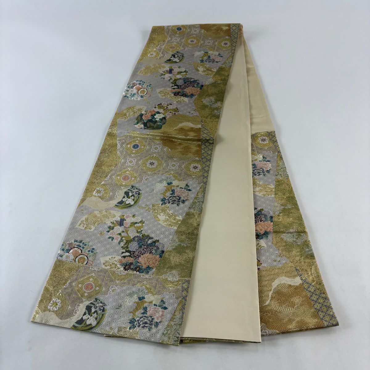 【美品】 袋帯 秀品 扇 草花 刺繍 箔 金色 お太鼓柄 正絹