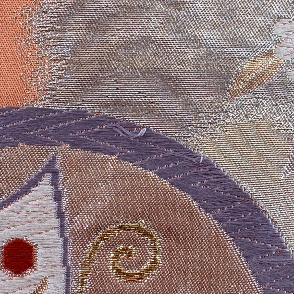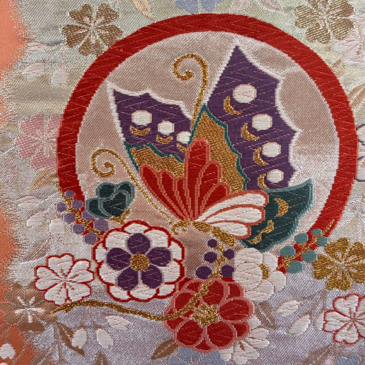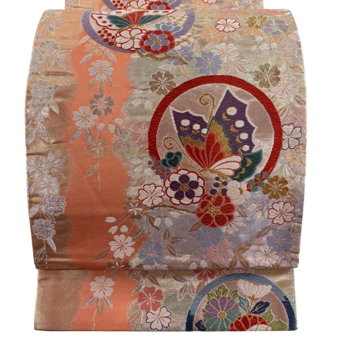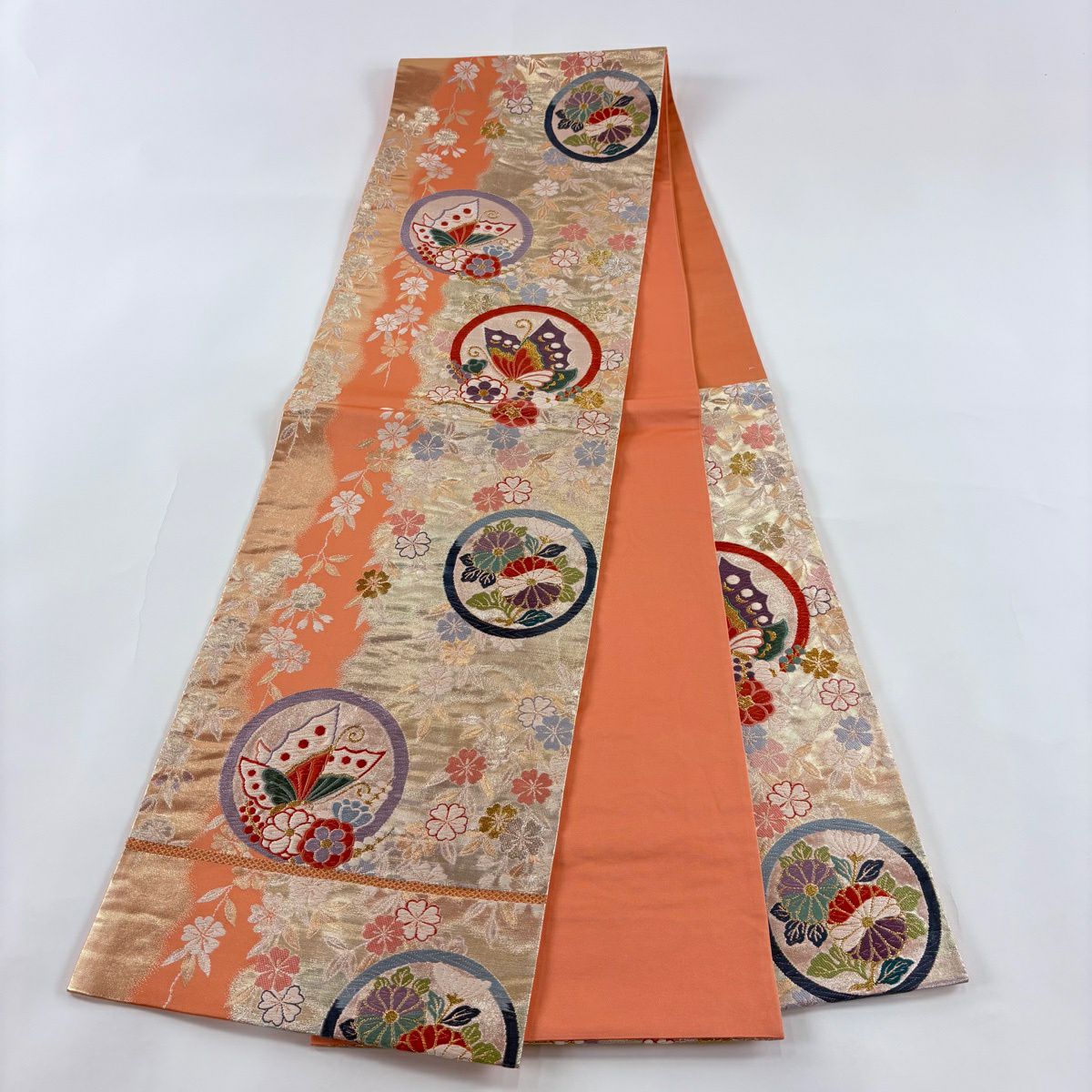 袋帯 秀品 蝶 桜 金銀糸 唐織 サーモンピンク 六通 正絹