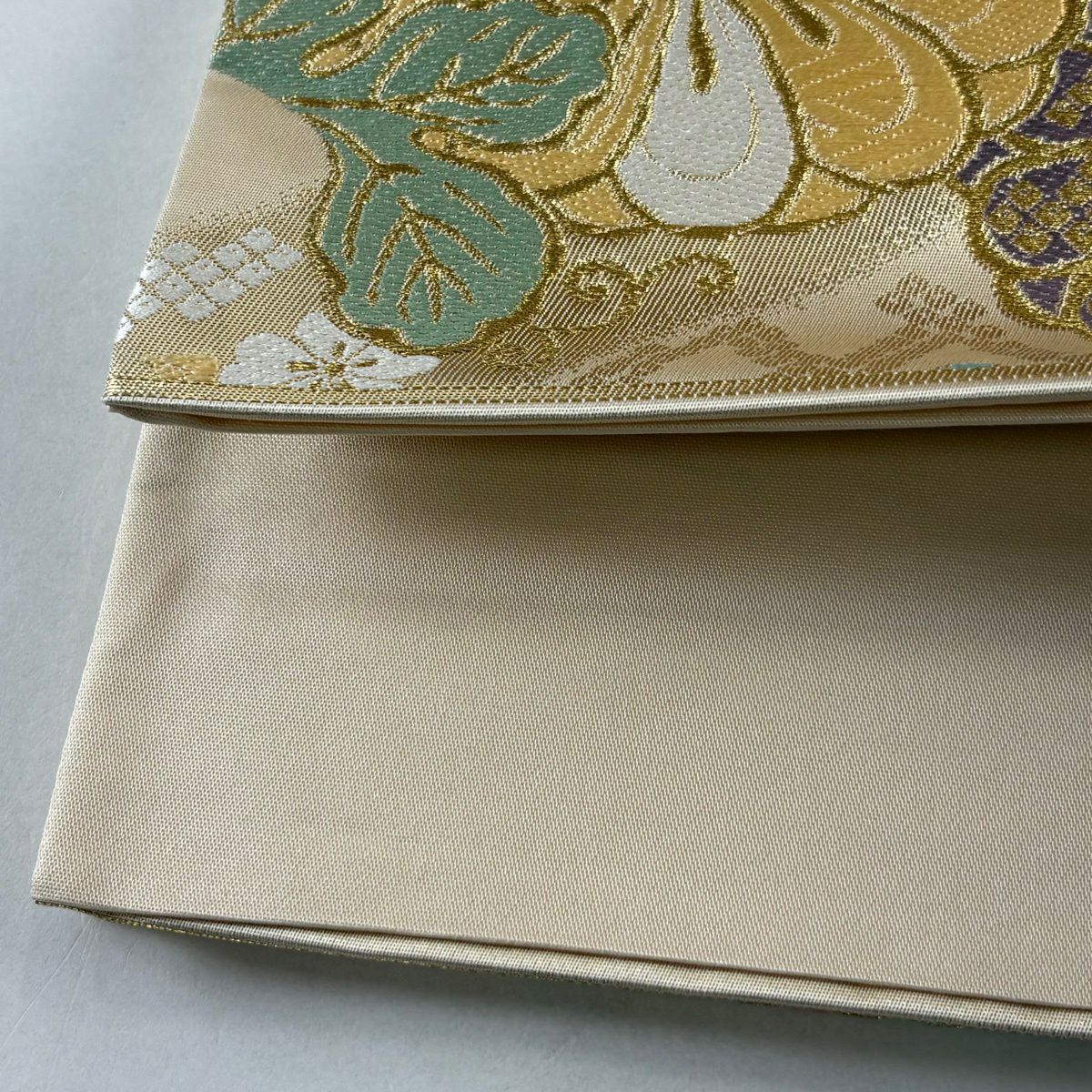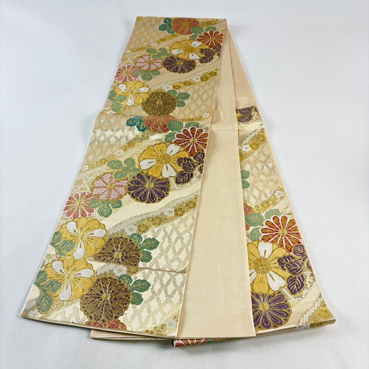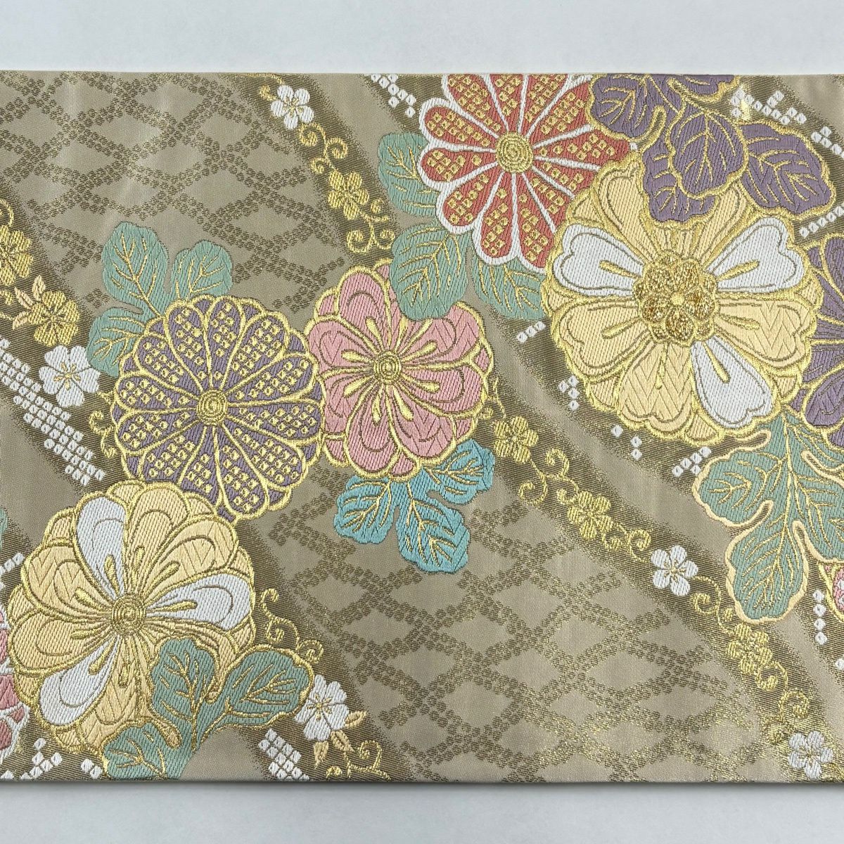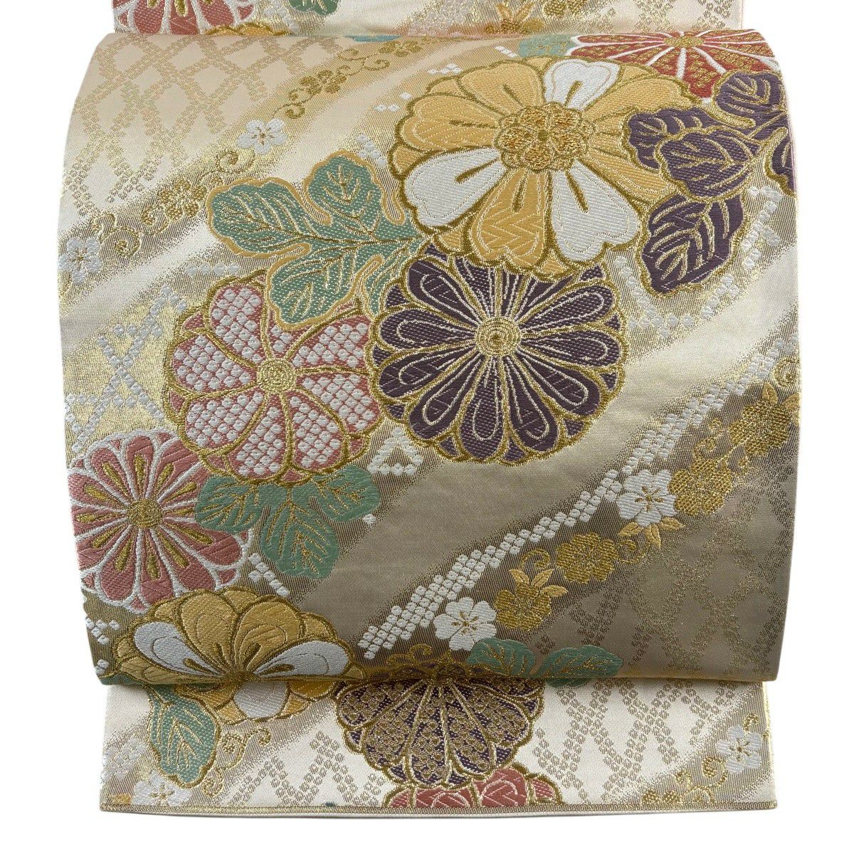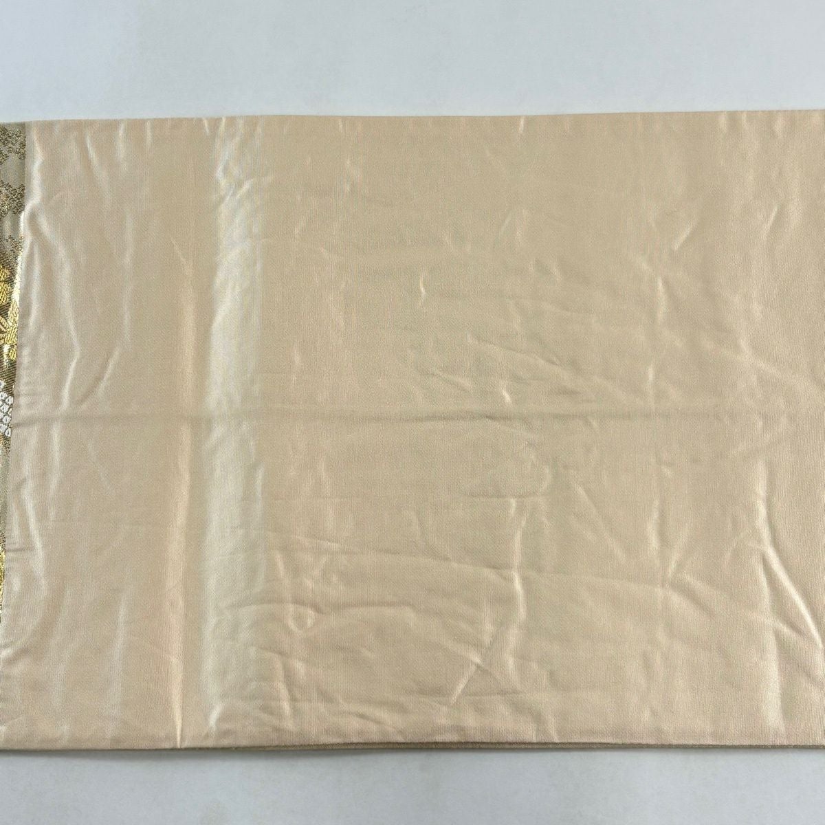 袋帯 秀品 花 幾何学模様 金糸 箔 ベージュ 六通 正絹