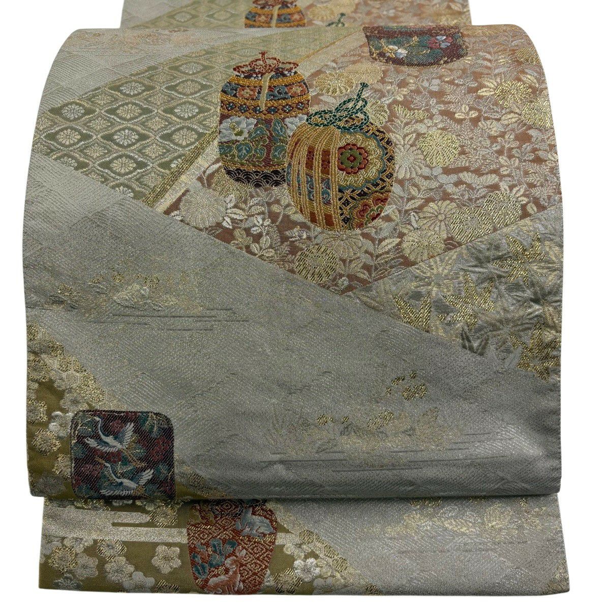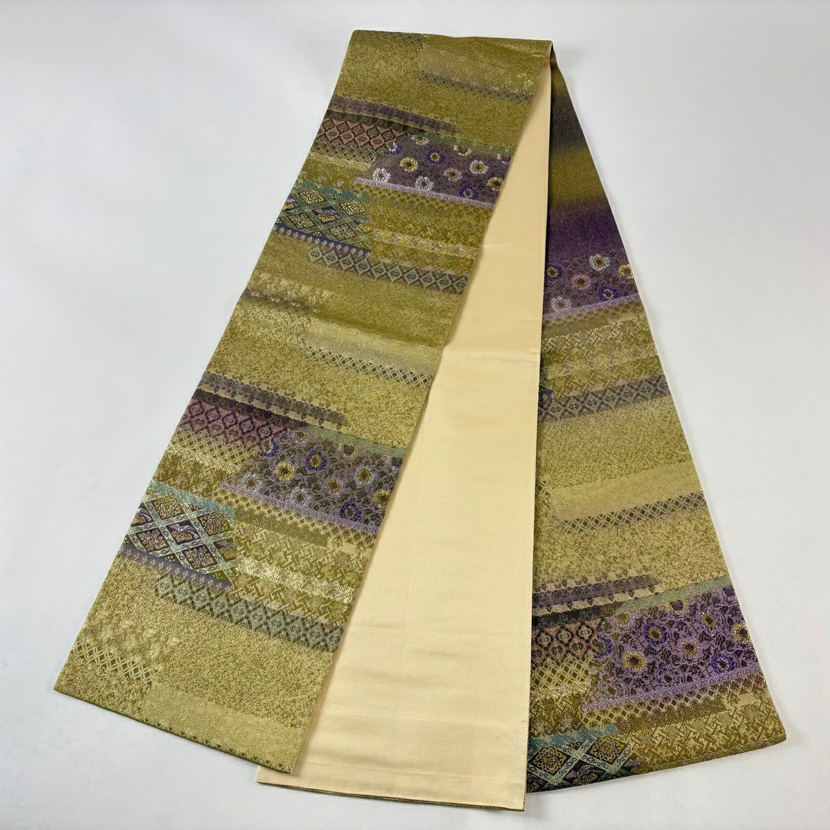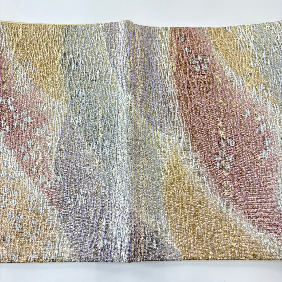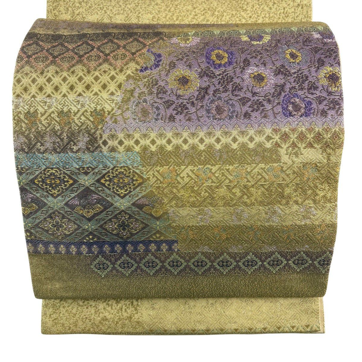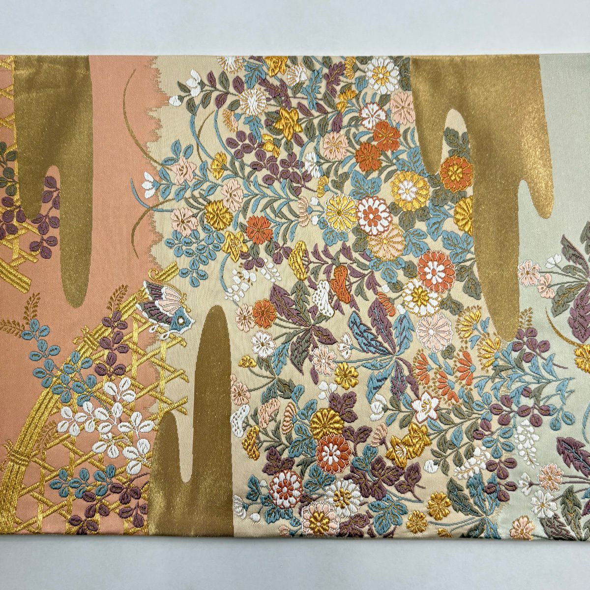 袋帯 秀品 花 幾何学模様 金糸 箔 ベージュ 六通 正絹