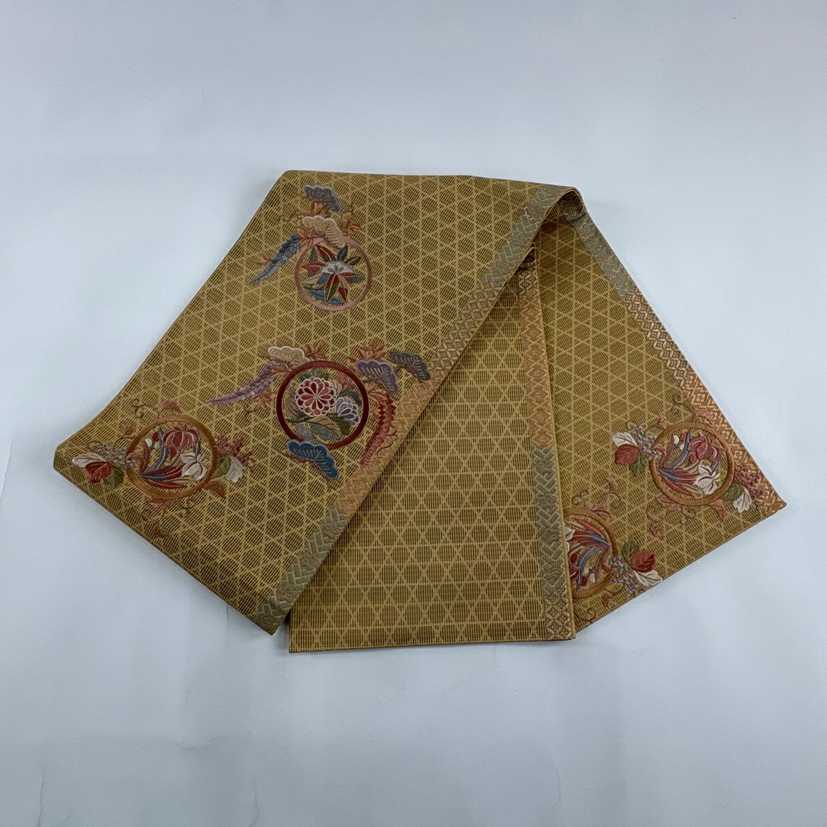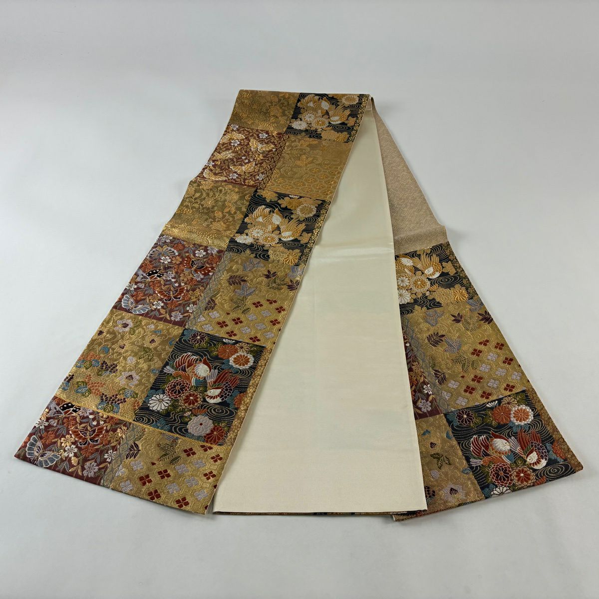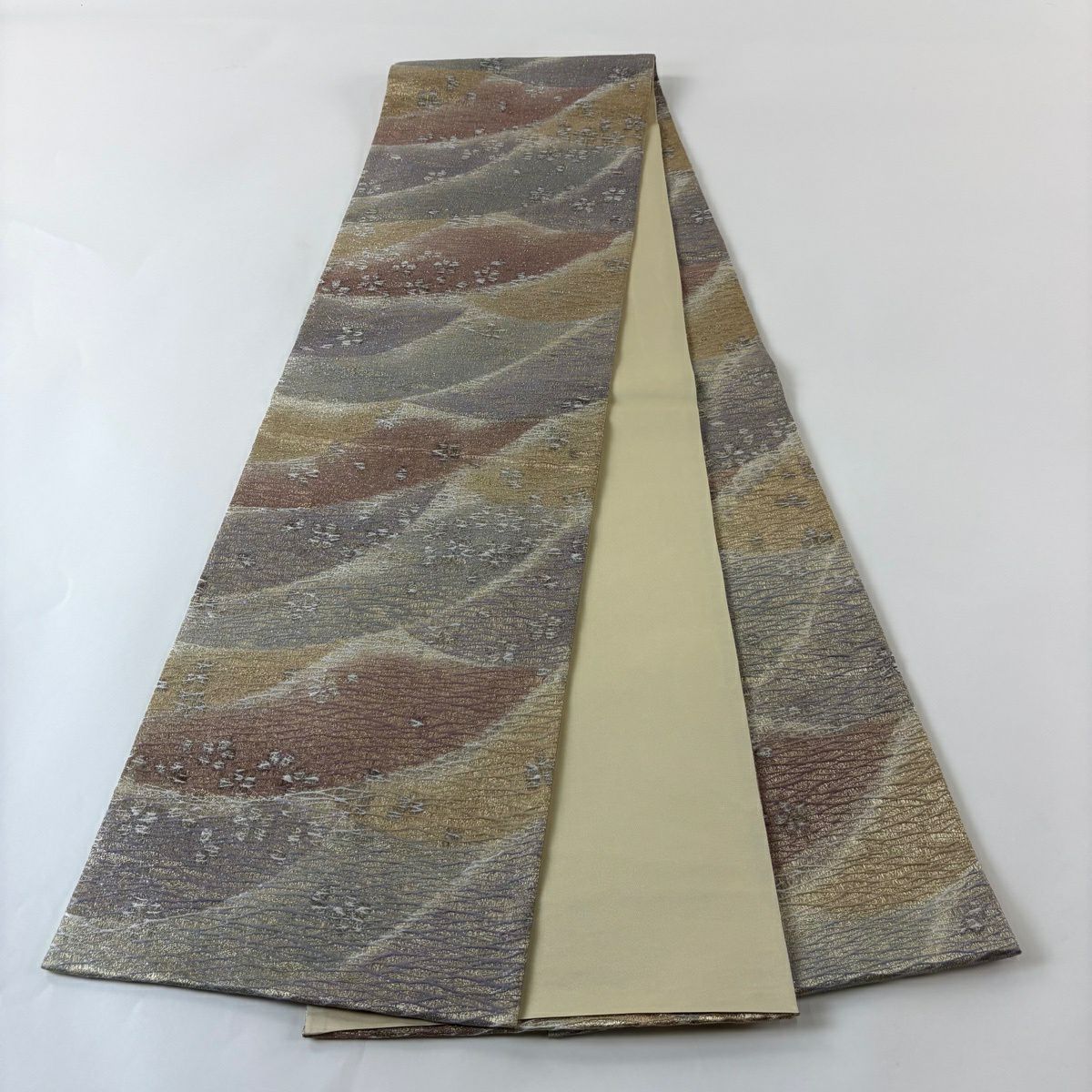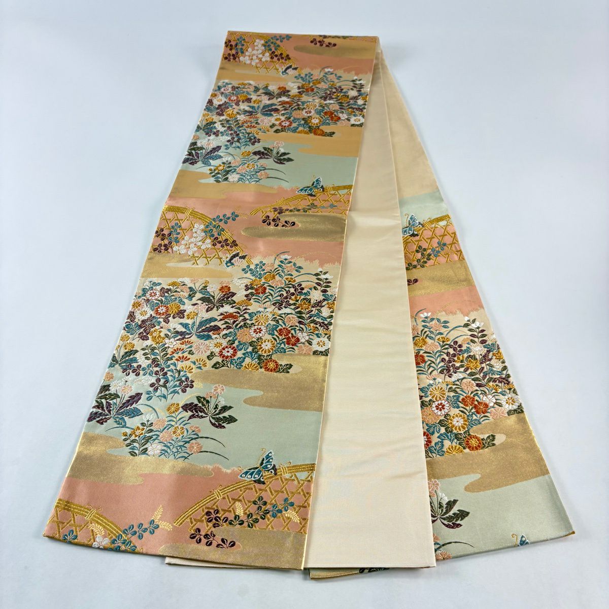袋帯 秀品 花 幾何学模様 金糸 箔 ベージュ 六通 正絹