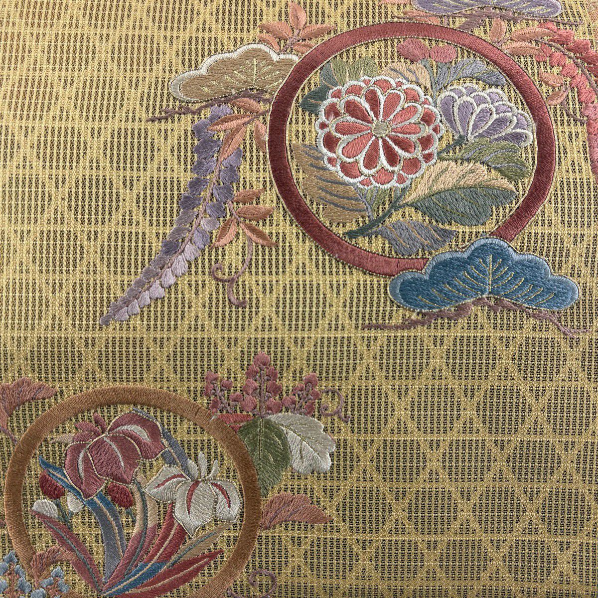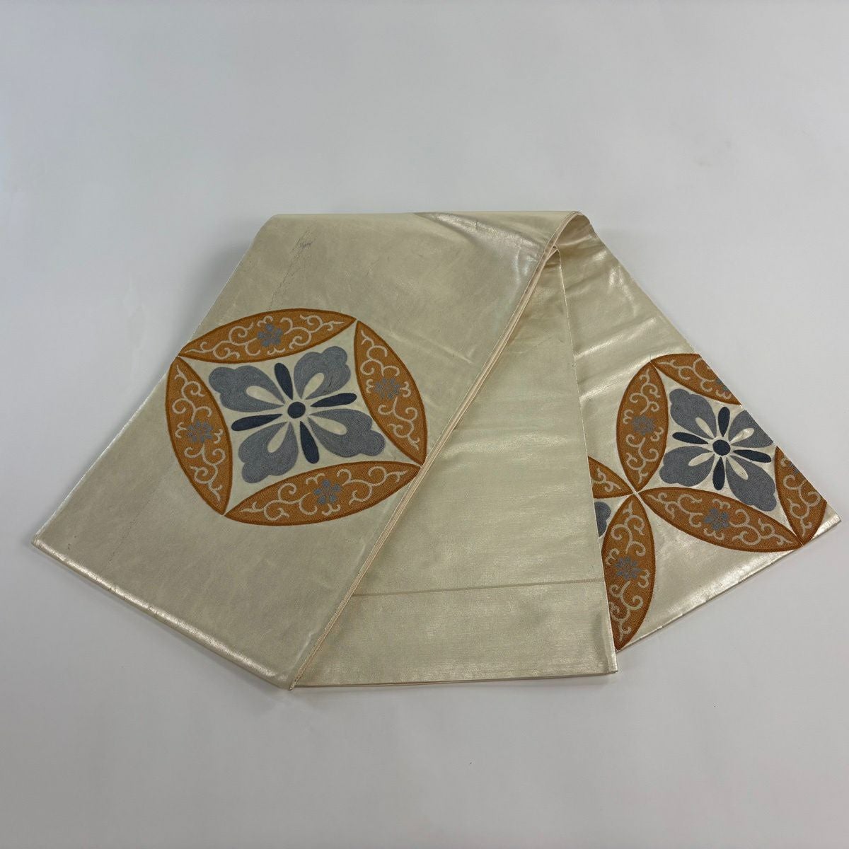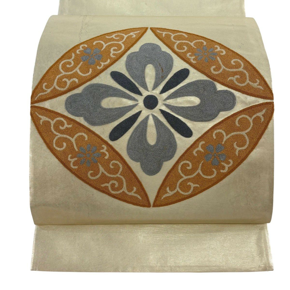 袋帯 秀品 七宝 花菱 相良刺繍 箔 クリーム お太鼓柄 正絹
