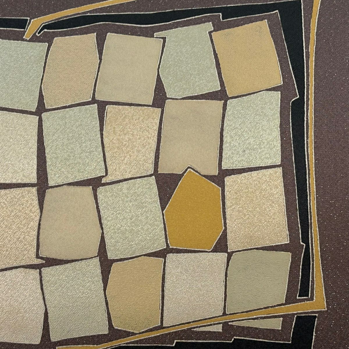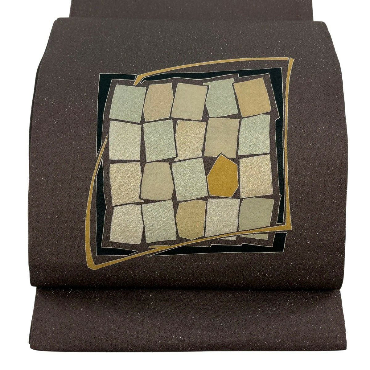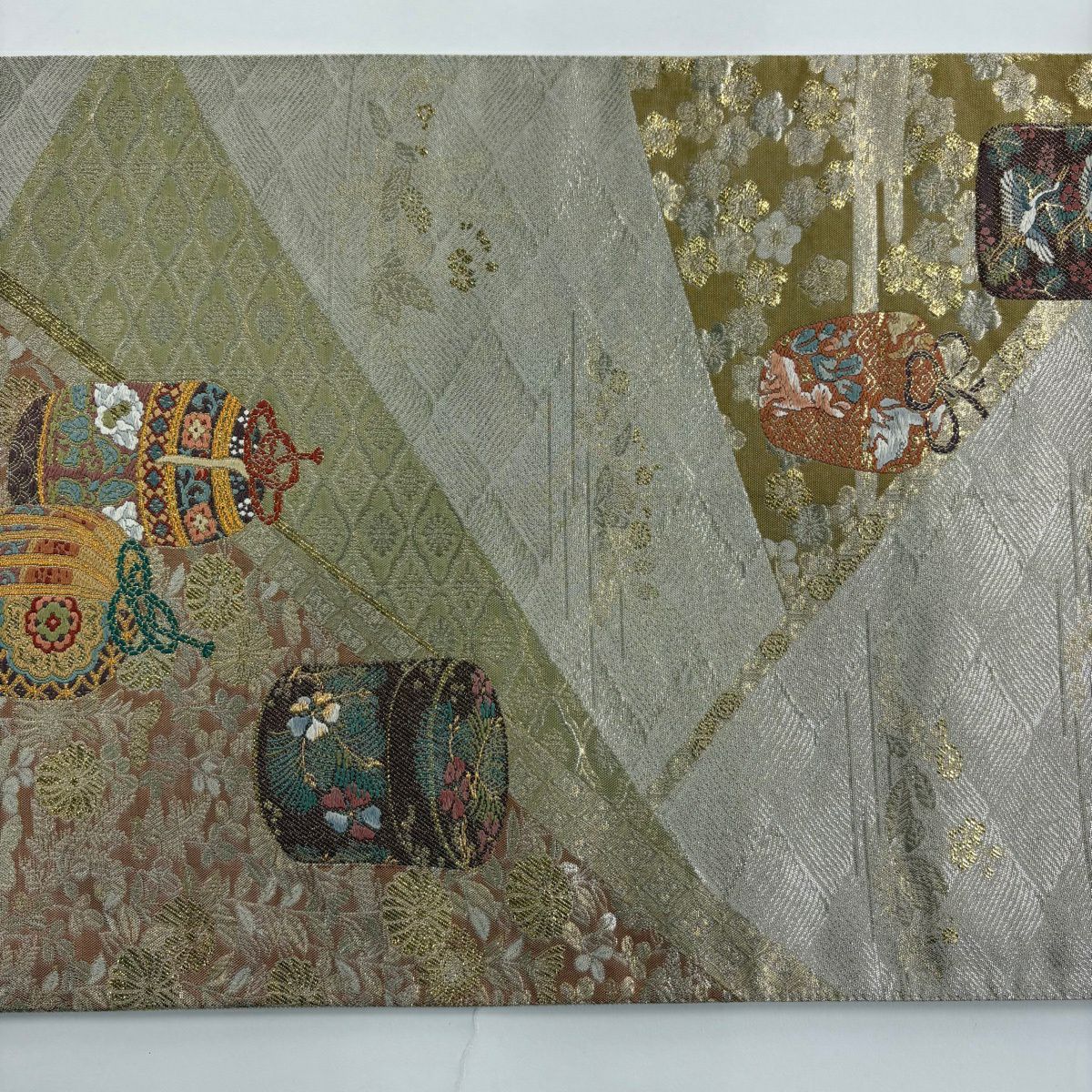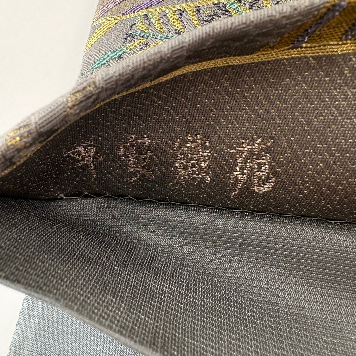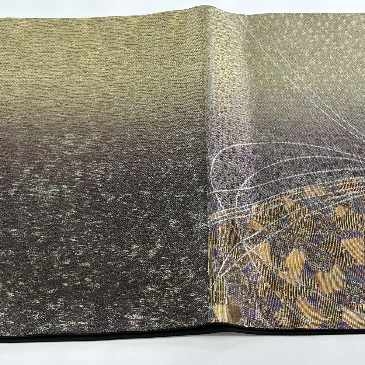 【美品】 袋帯 秀品 幾何学模様 金糸 銀彩 灰茶 全通 正絹
