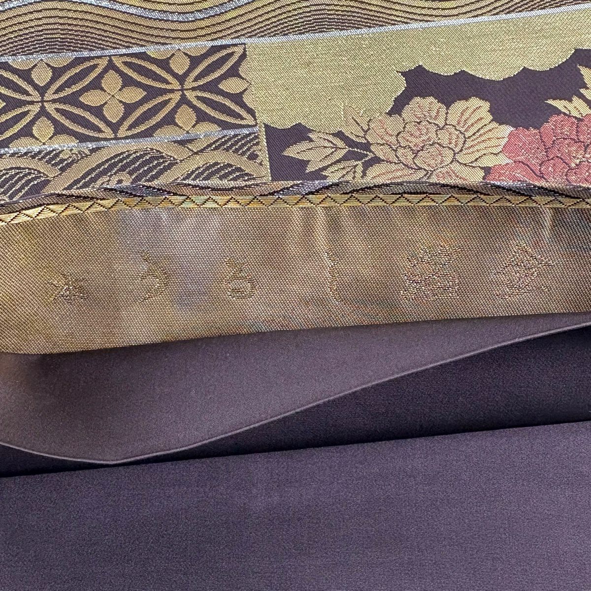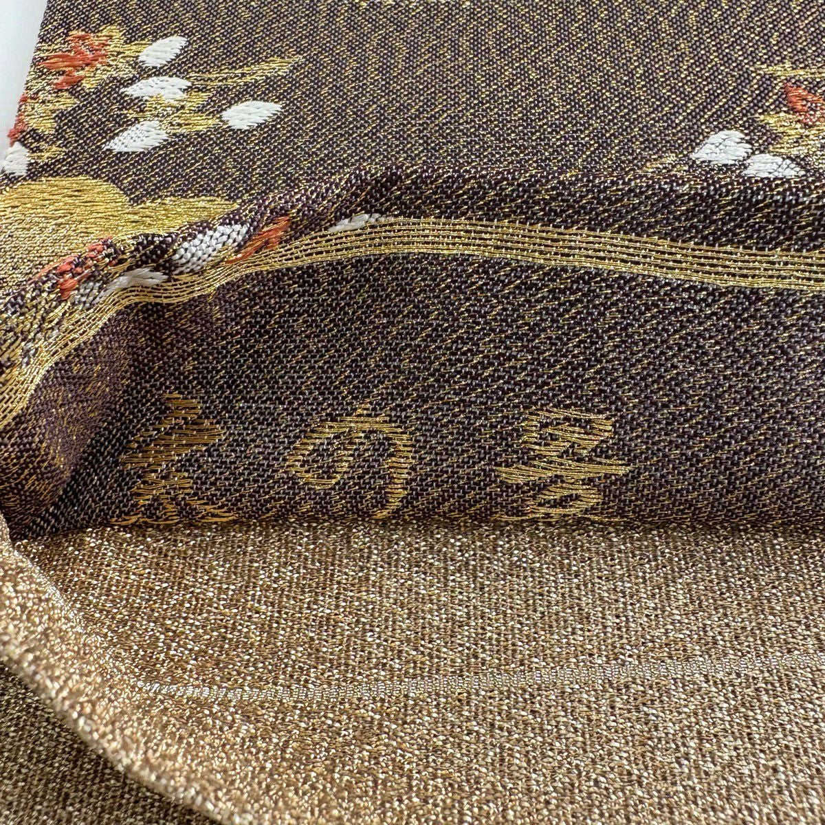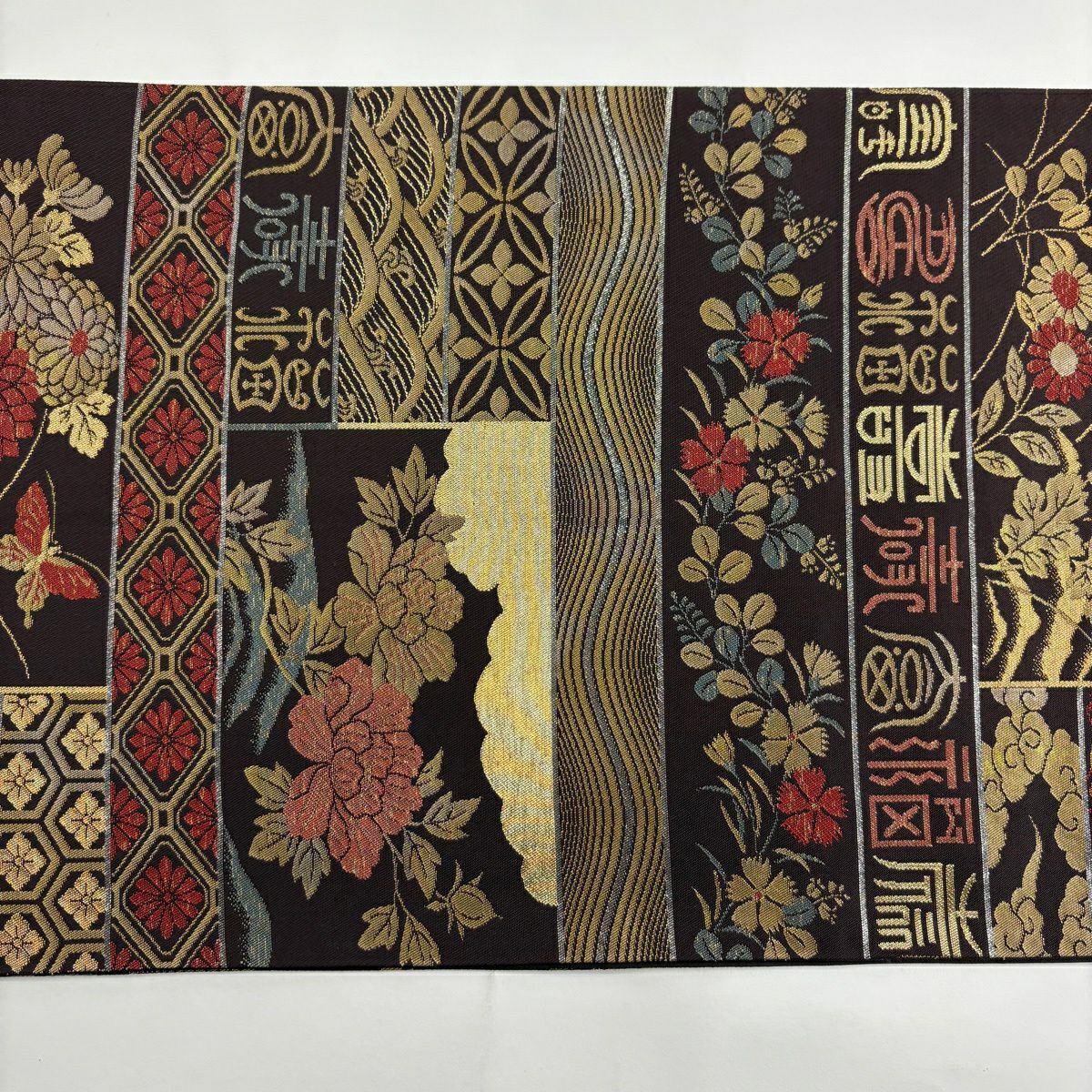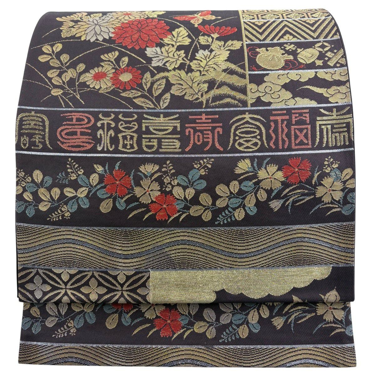 【美品】 袋帯 秀品 草花 文字 金糸 箔 焦茶色 六通 正絹