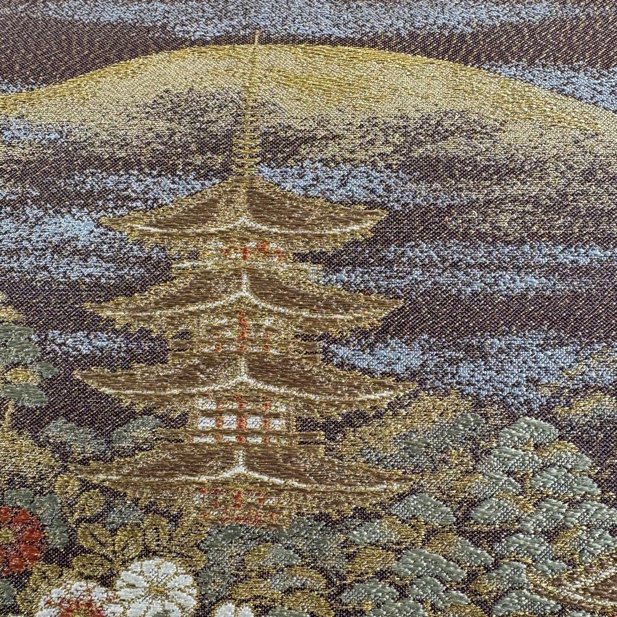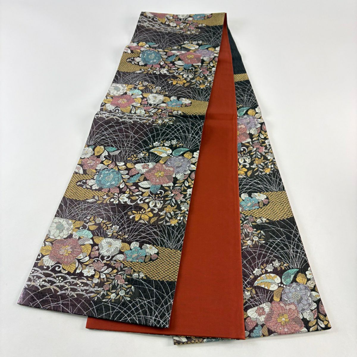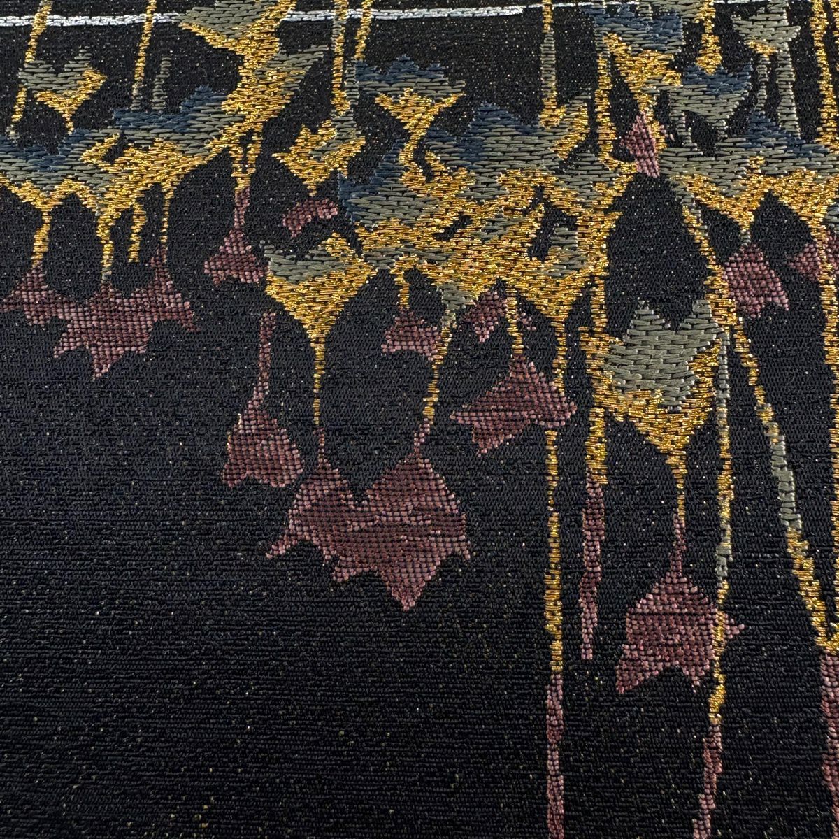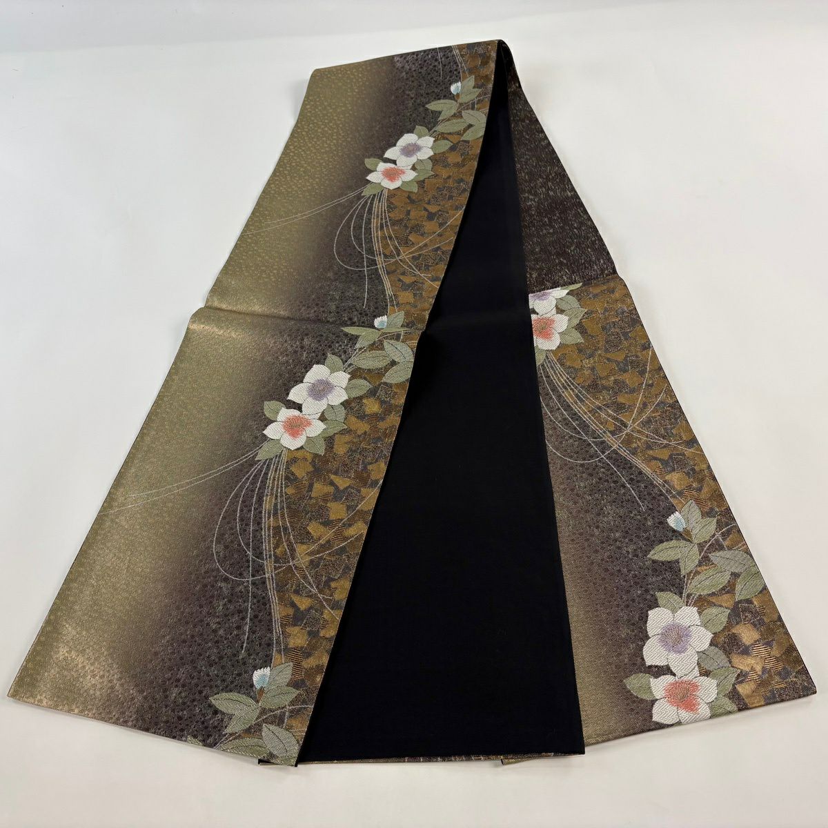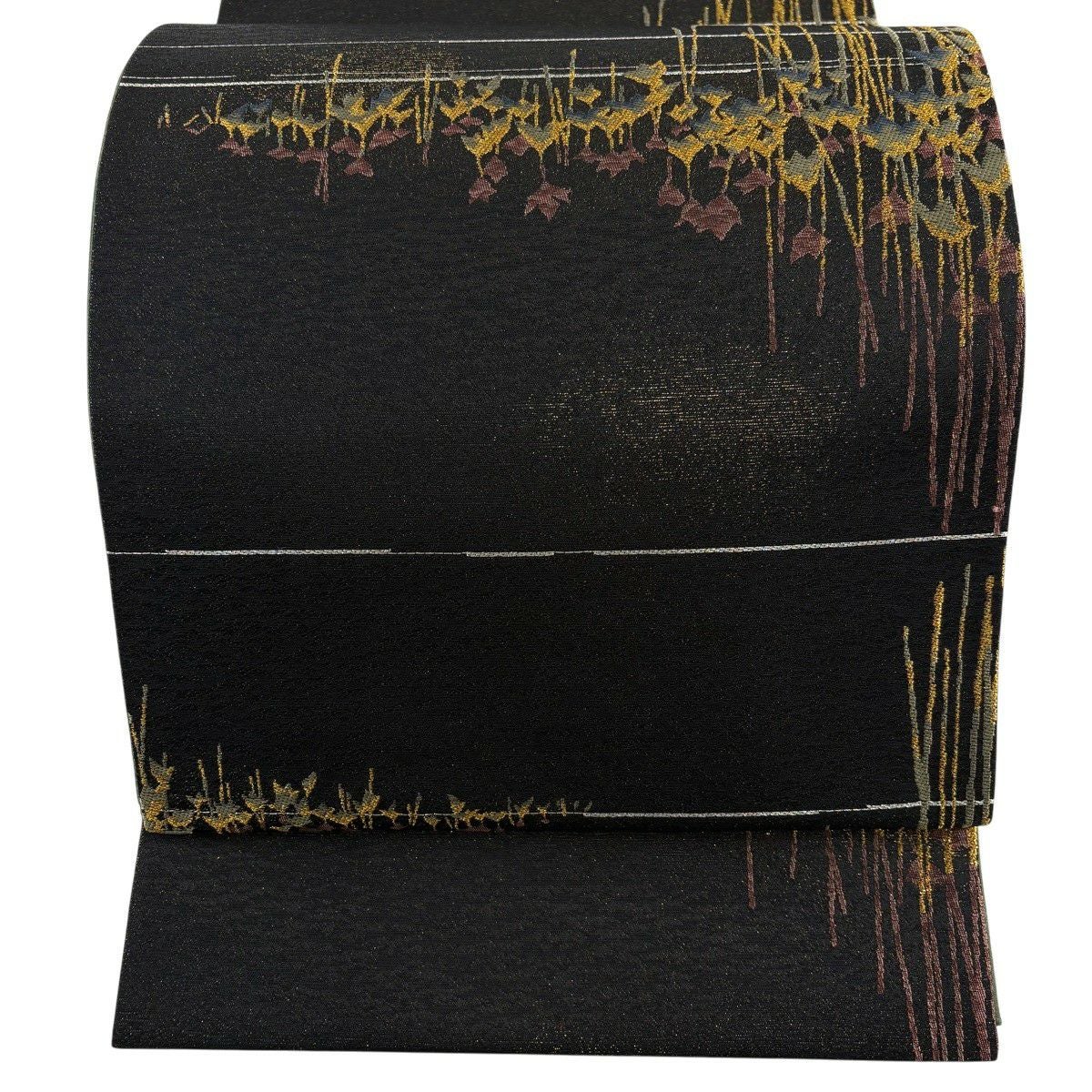 【美品】 袋帯 秀品 草花 文字 金糸 箔 焦茶色 六通 正絹