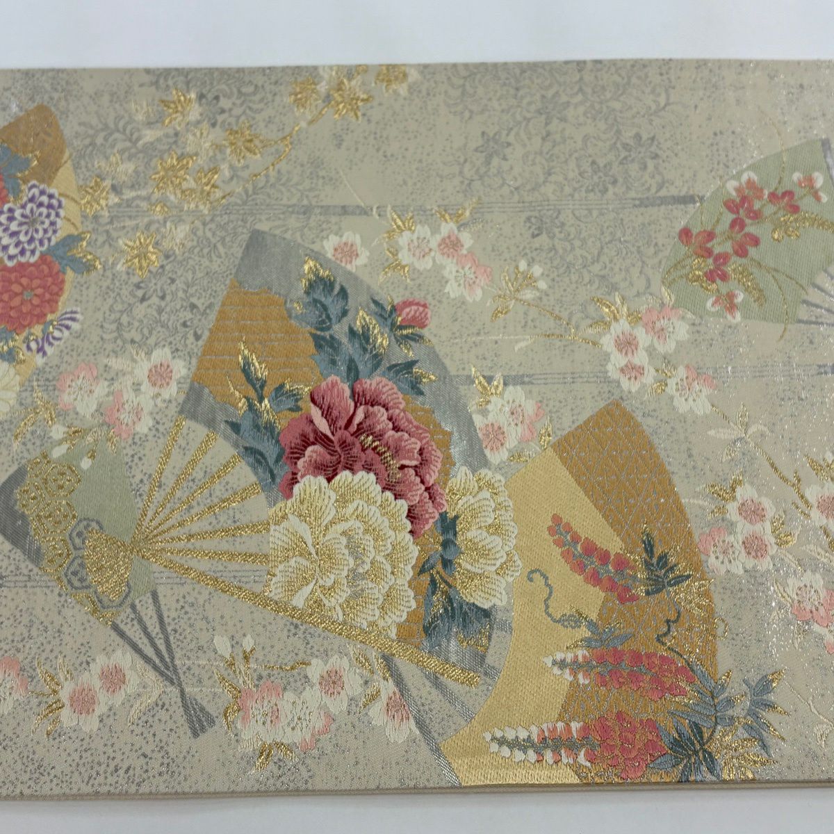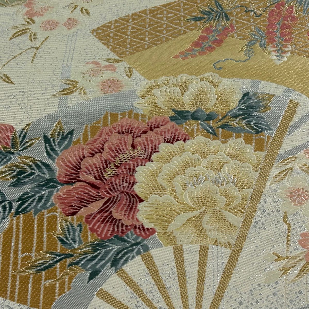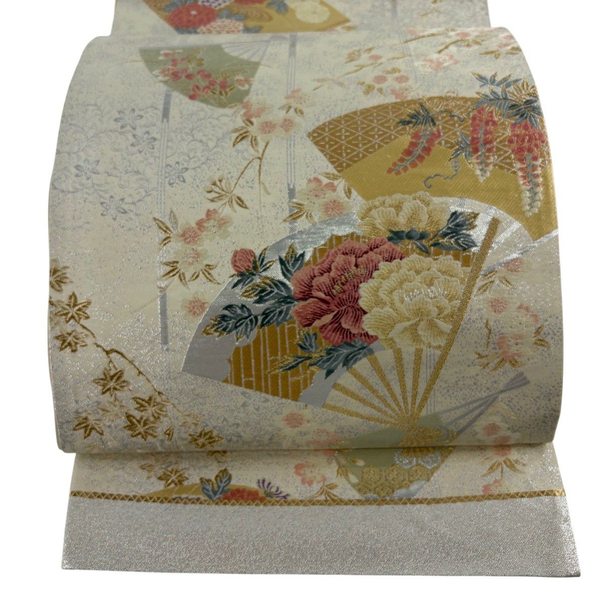 袋帯 秀品 証紙あり 扇 草花 箔 唐織 クリーム 六通 正絹