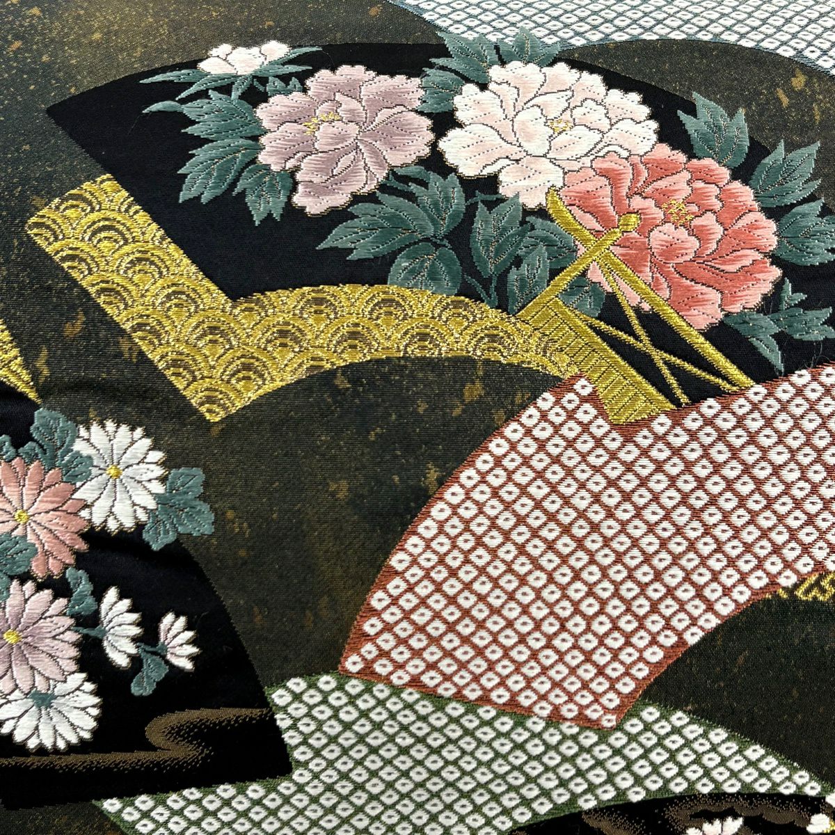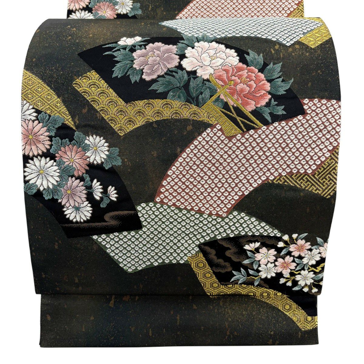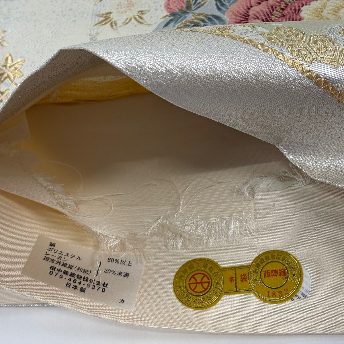 袋帯 秀品 証紙あり 扇 草花 箔 唐織 クリーム 六通 正絹
