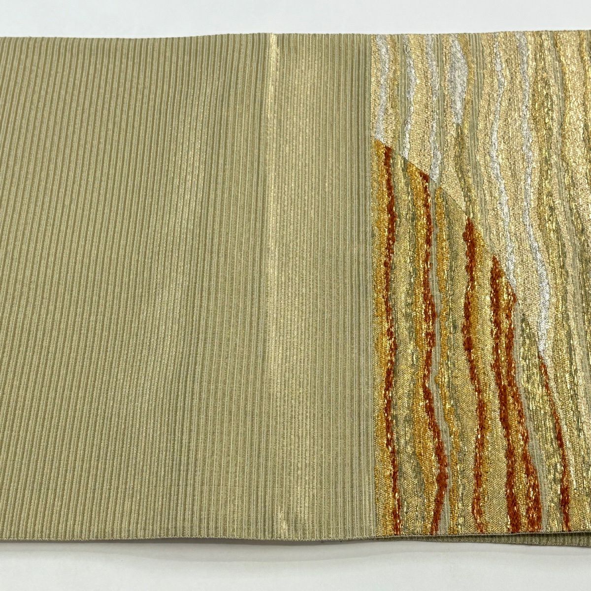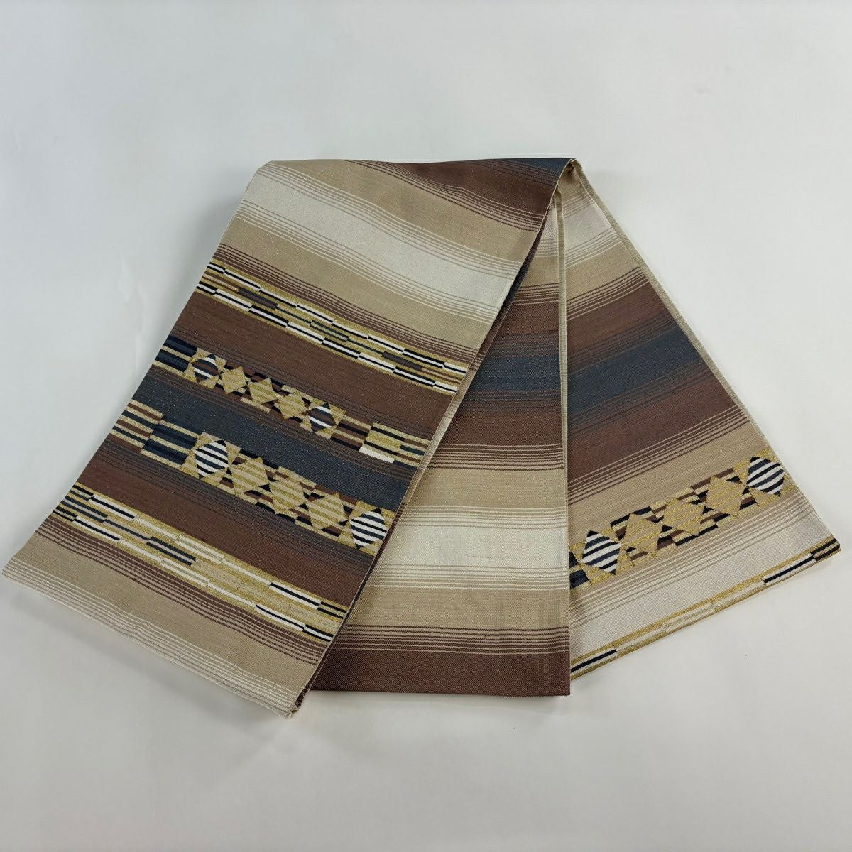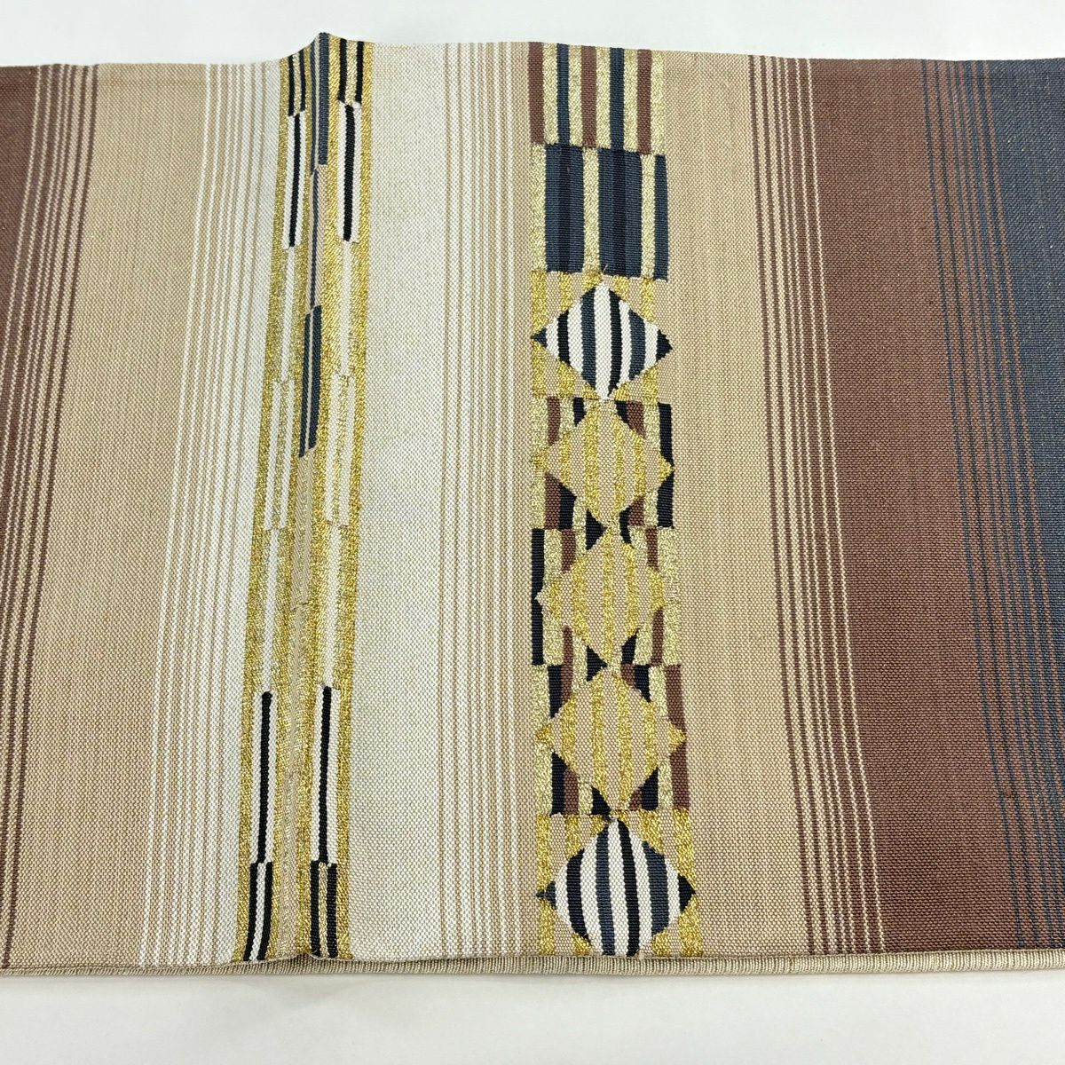 袋帯 秀品 縞 幾何学模様 箔 金銀彩 薄茶色 お太鼓柄 正絹