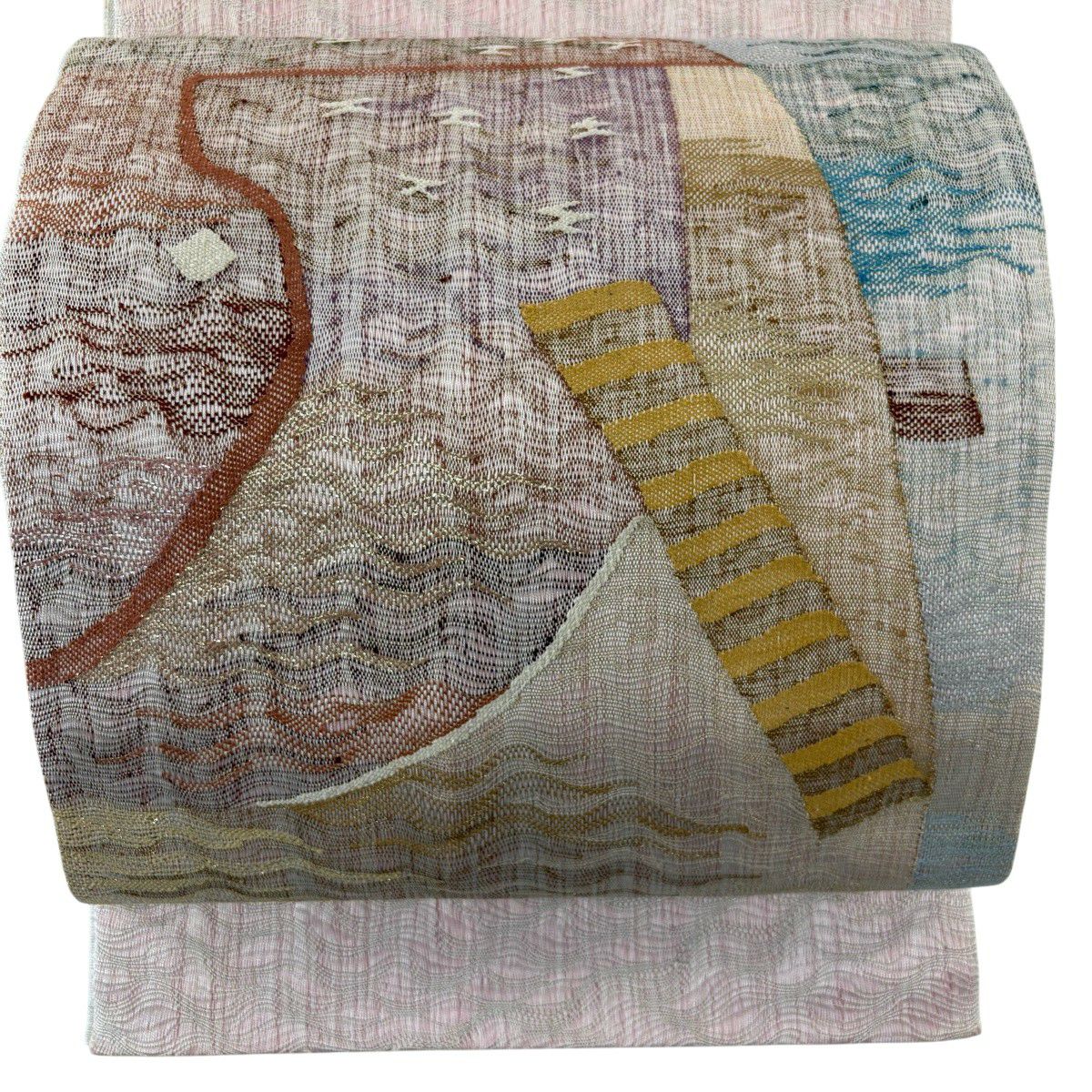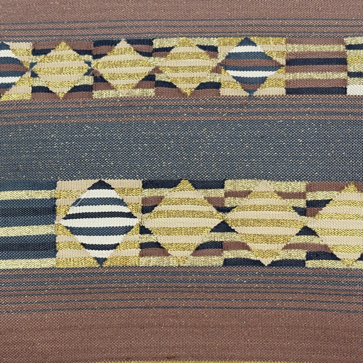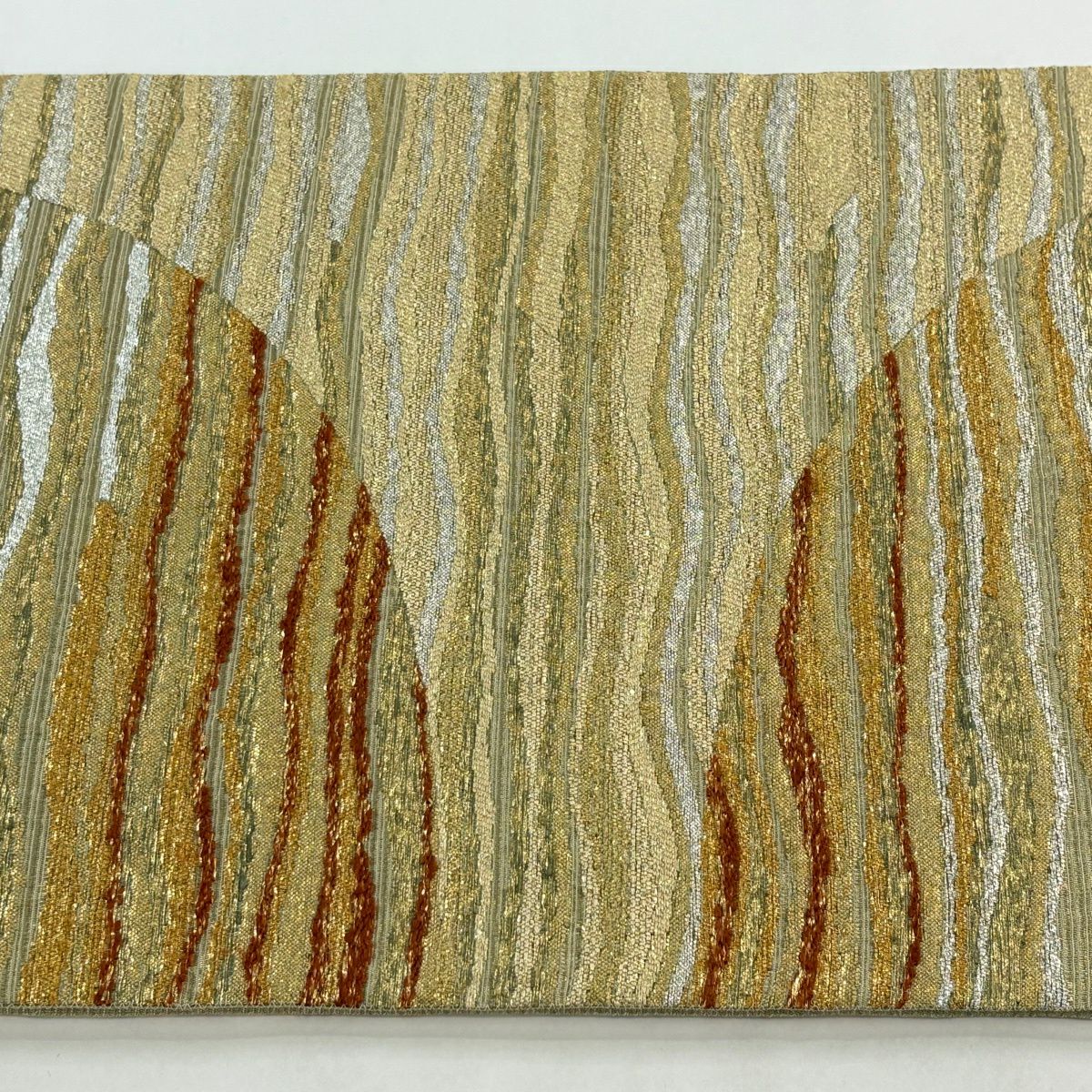 袋帯 秀品 縞 幾何学模様 箔 金銀彩 薄茶色 お太鼓柄 正絹