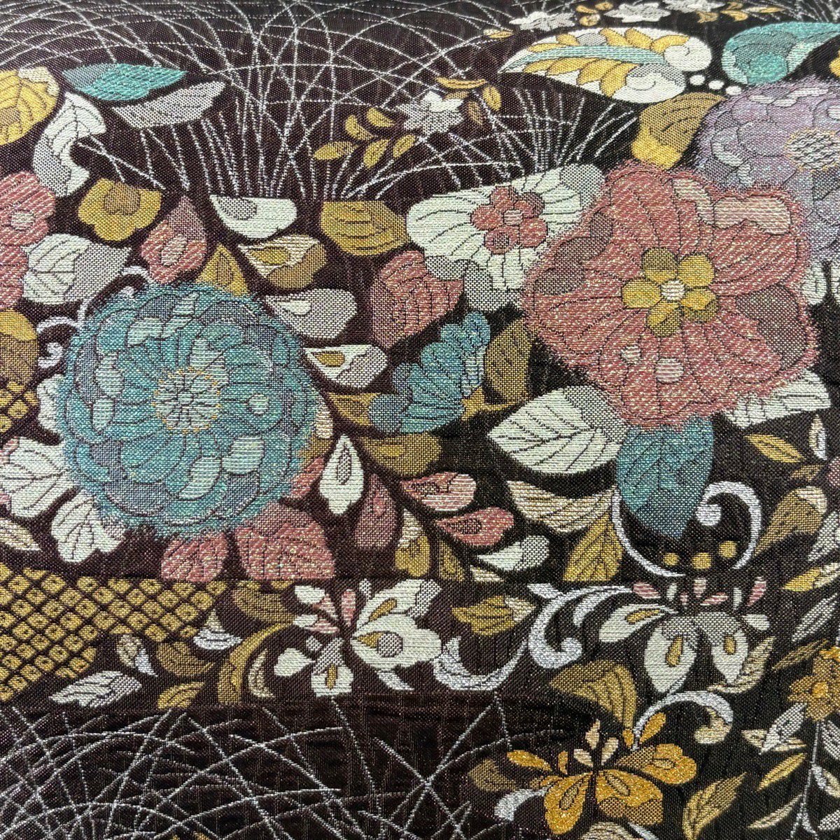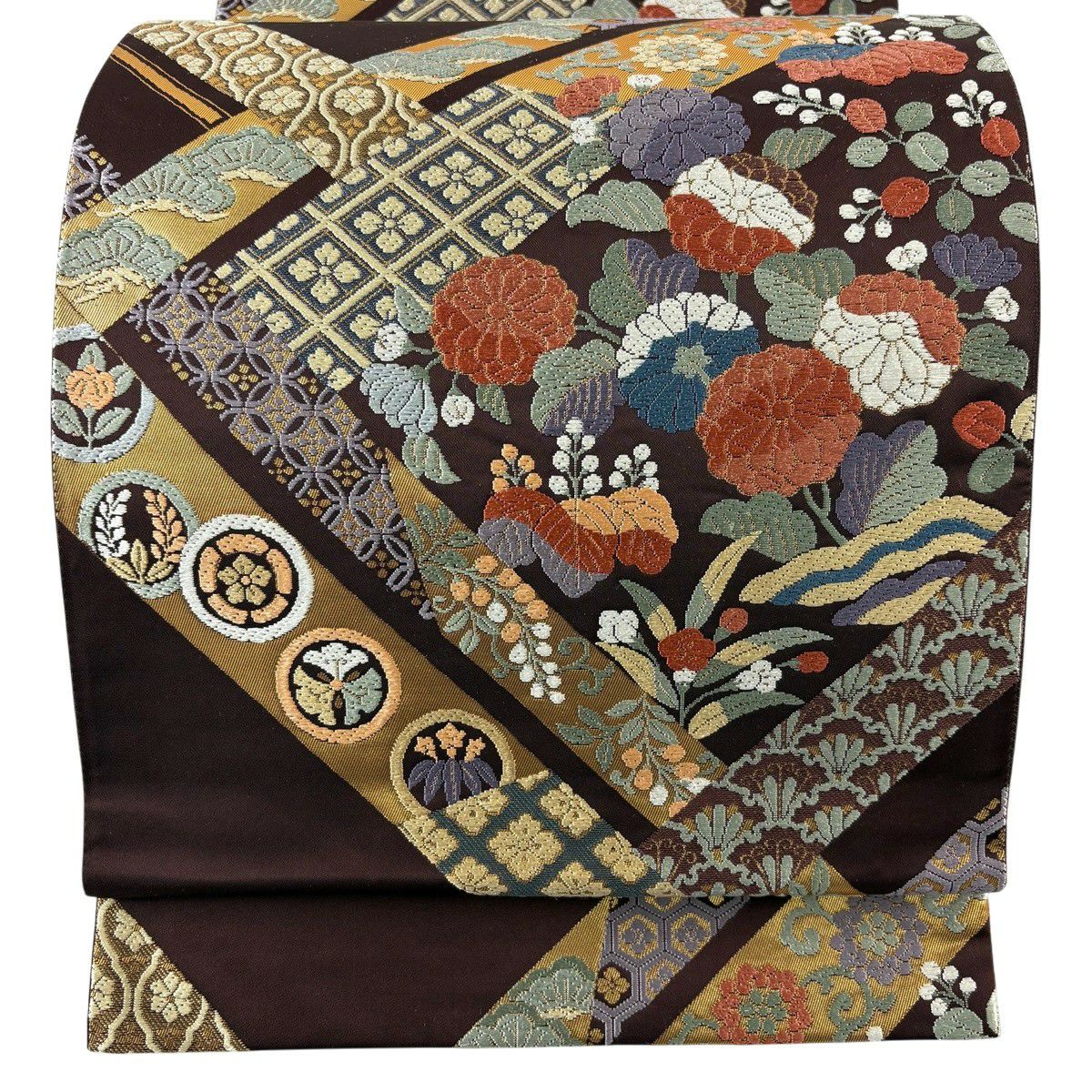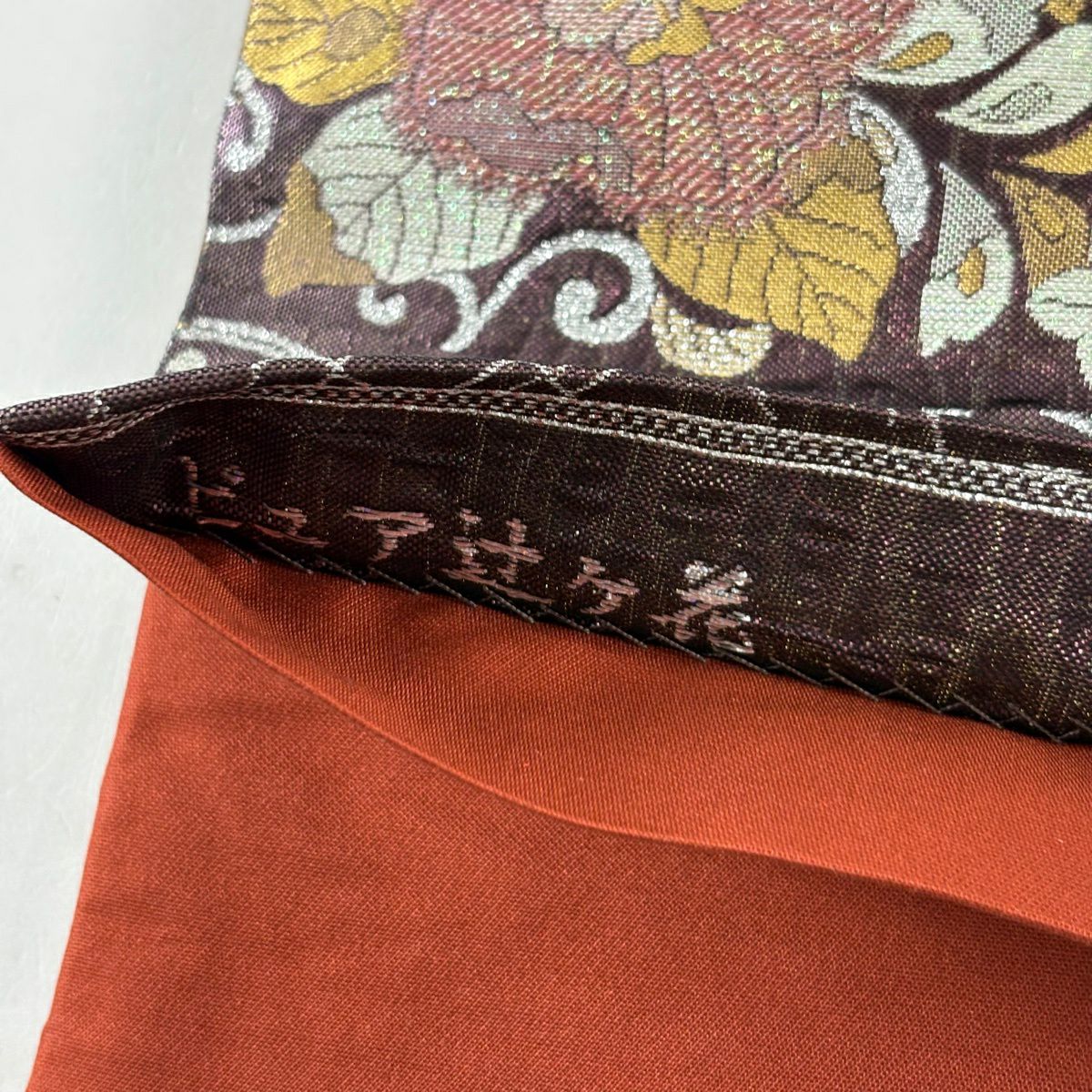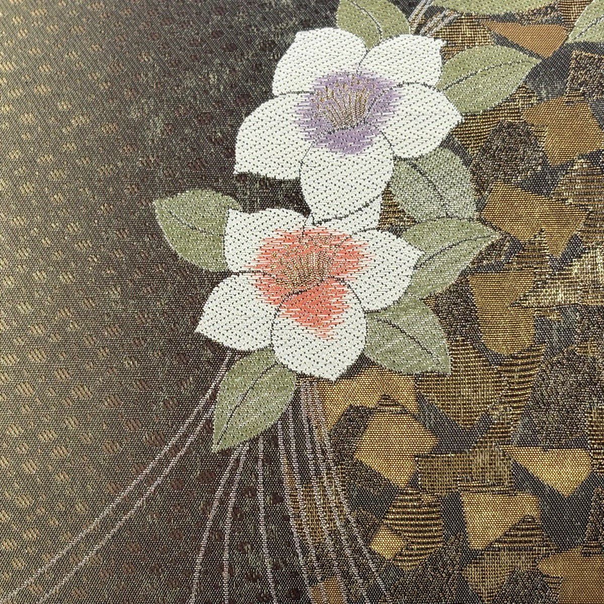 【美品】 袋帯 秀品 草花 花菱 唐織 箔 焦茶色 六通 正絹