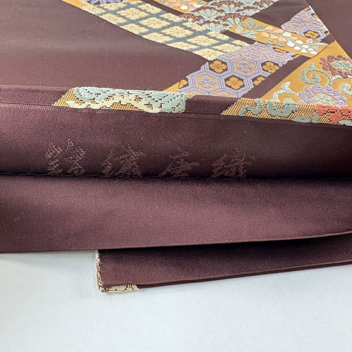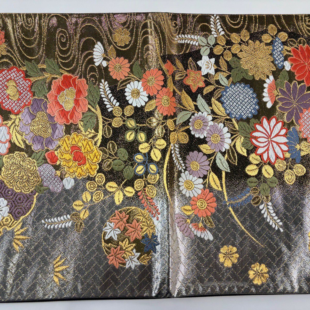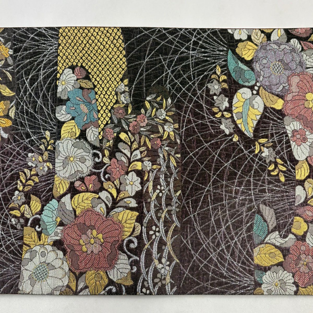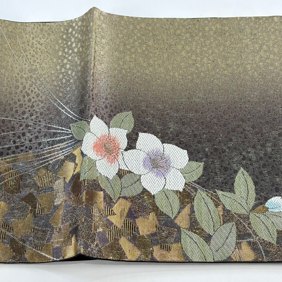 【美品】 袋帯 秀品 草花 花菱 唐織 箔 焦茶色 六通 正絹