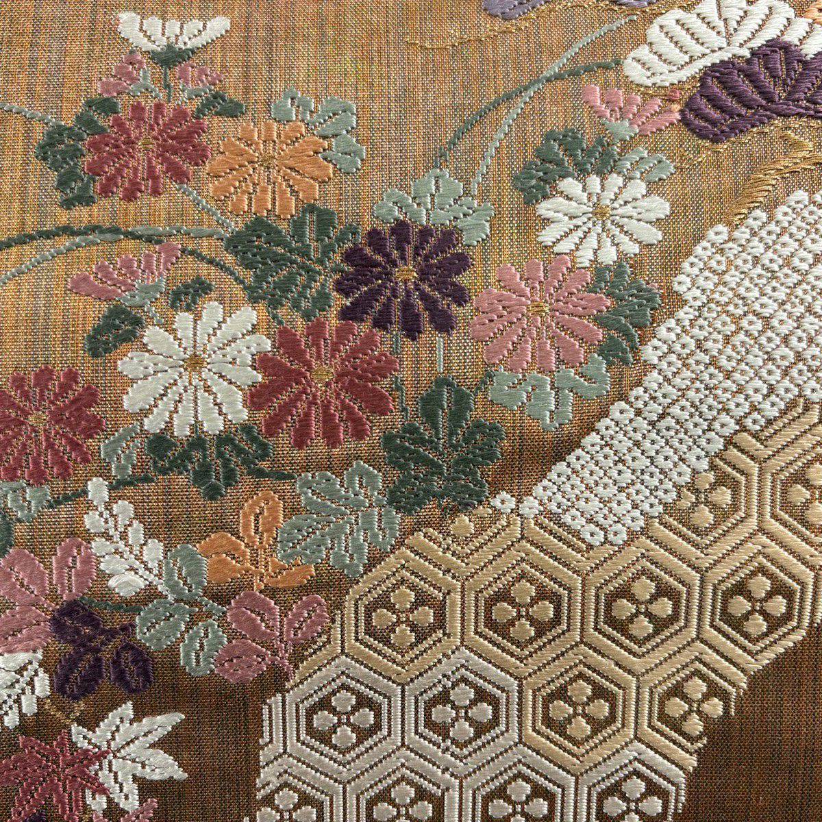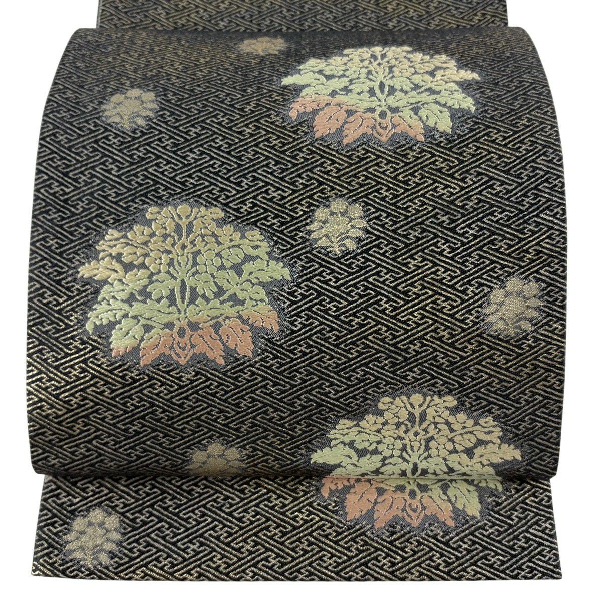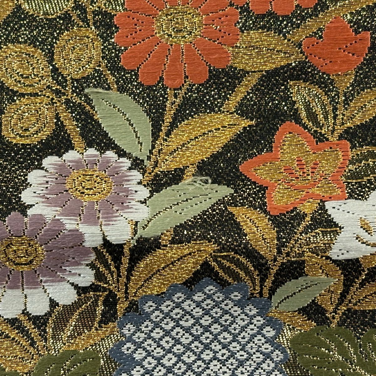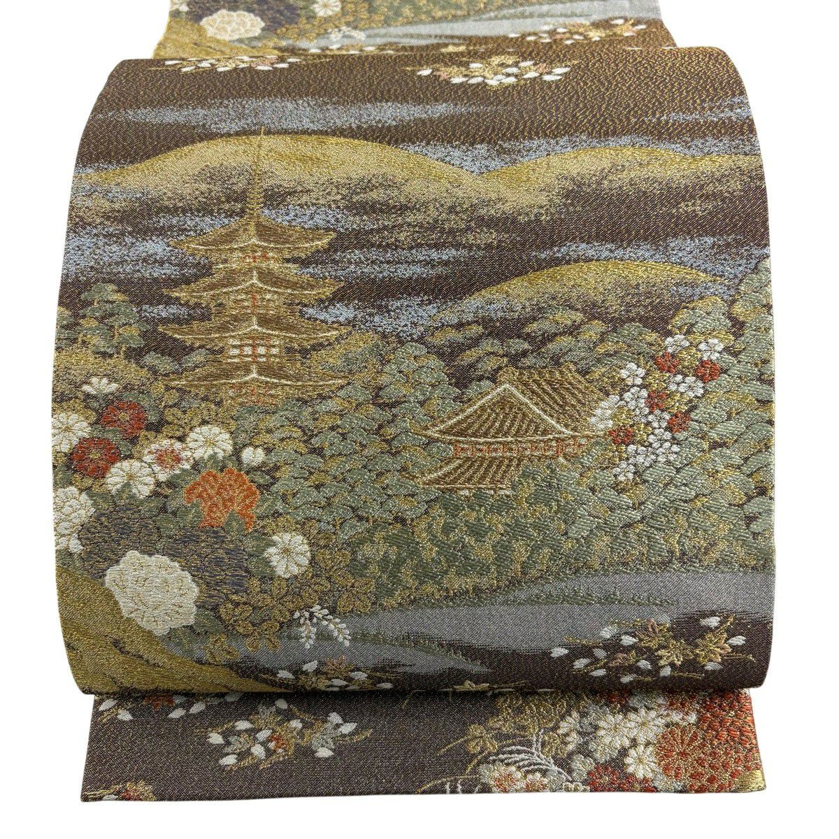 【美品】 袋帯 秀品 草花 花菱 唐織 箔 焦茶色 六通 正絹