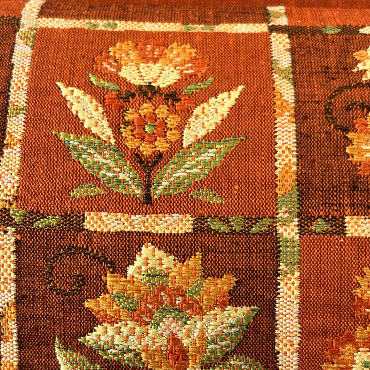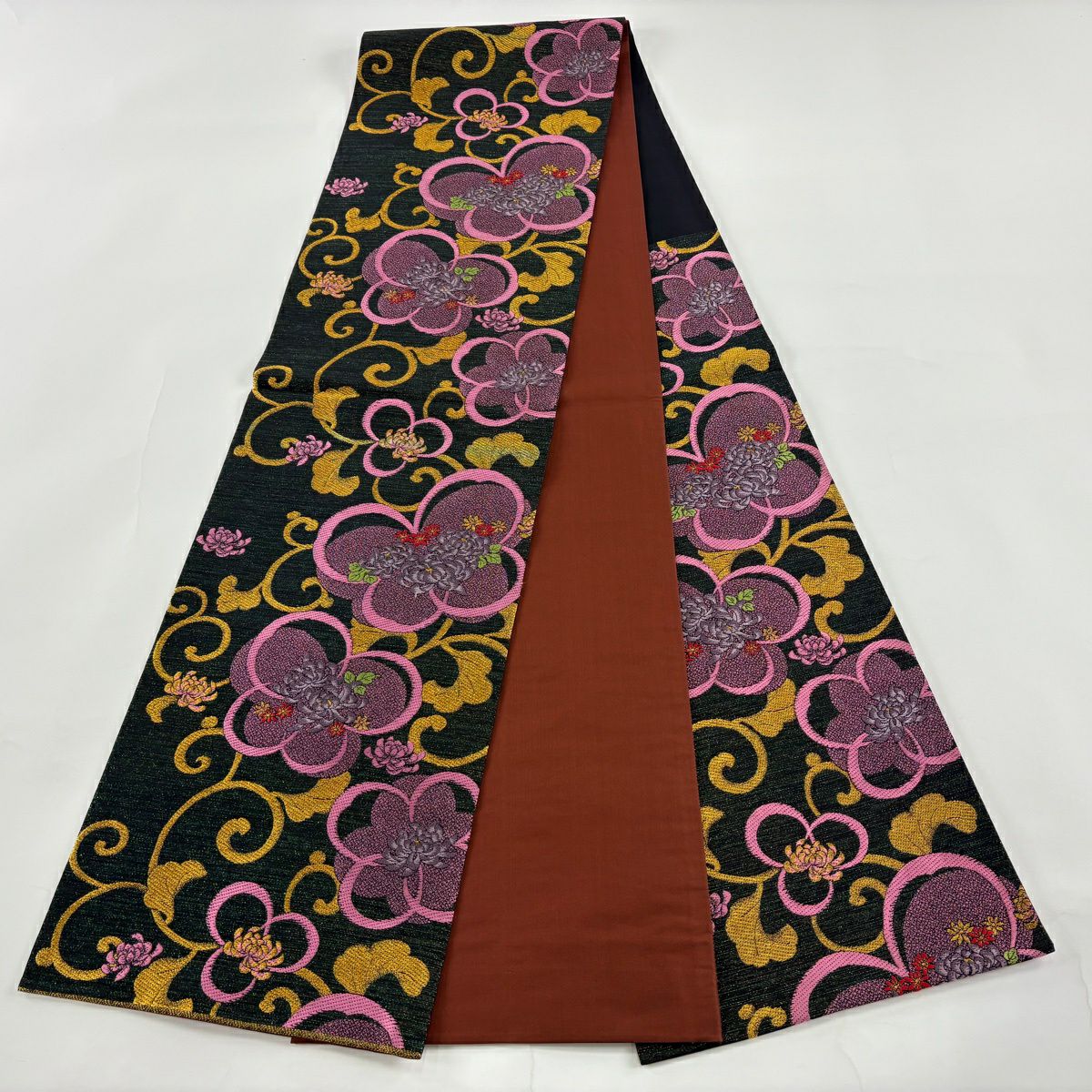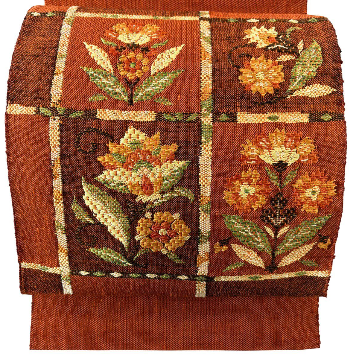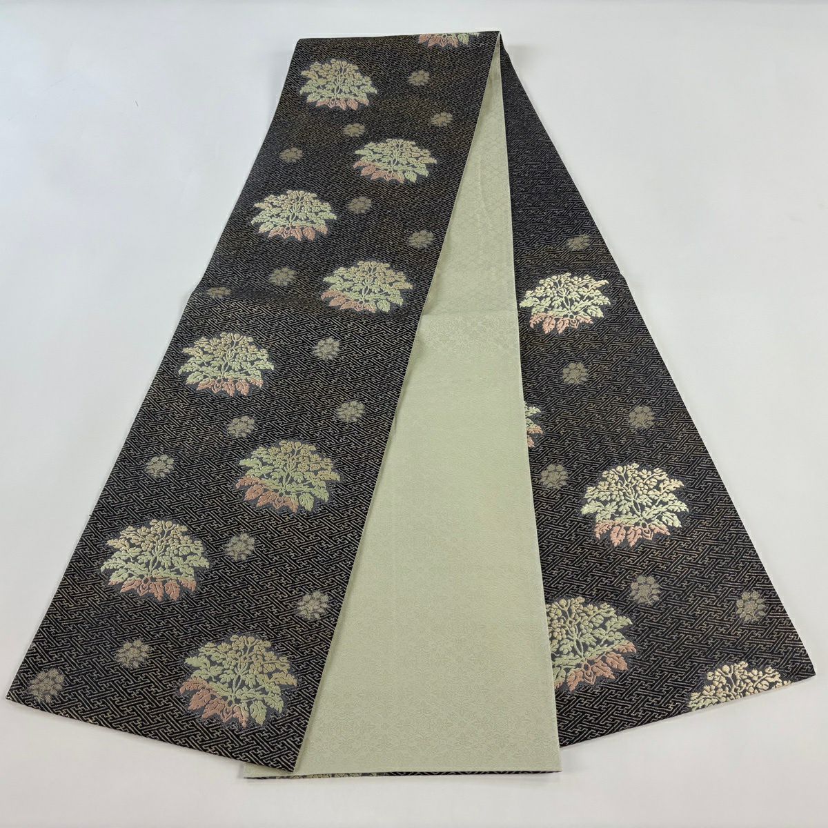 【美品】 袋帯 秀品 草花 花菱 唐織 箔 焦茶色 六通 正絹