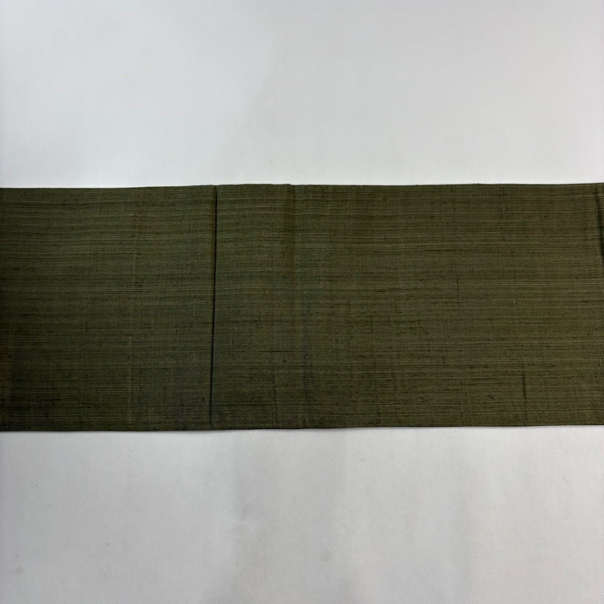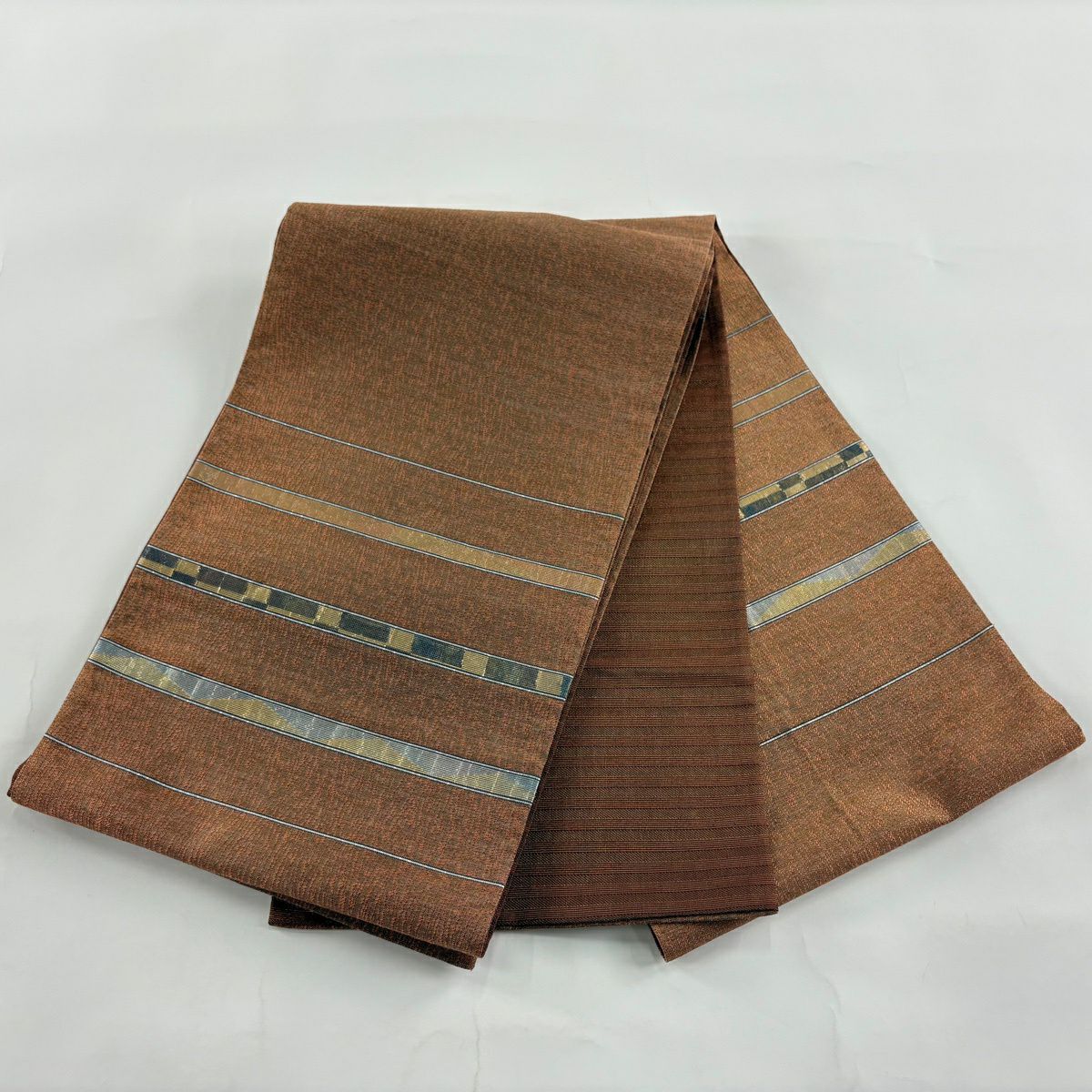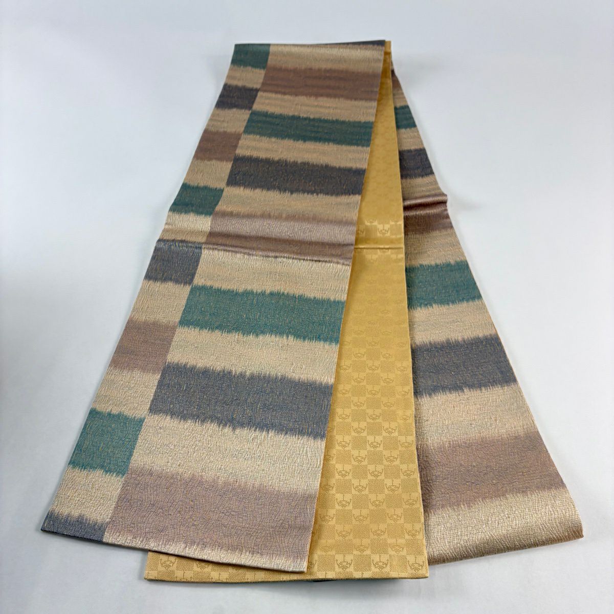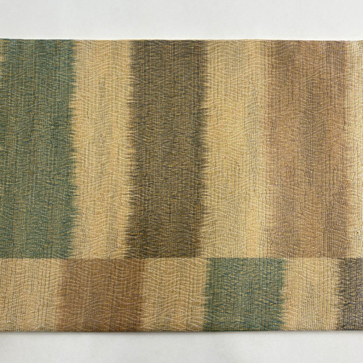 【美品】 袋帯 秀品 紬地 縞 幾何学模様 茶緑色 全通 正絹