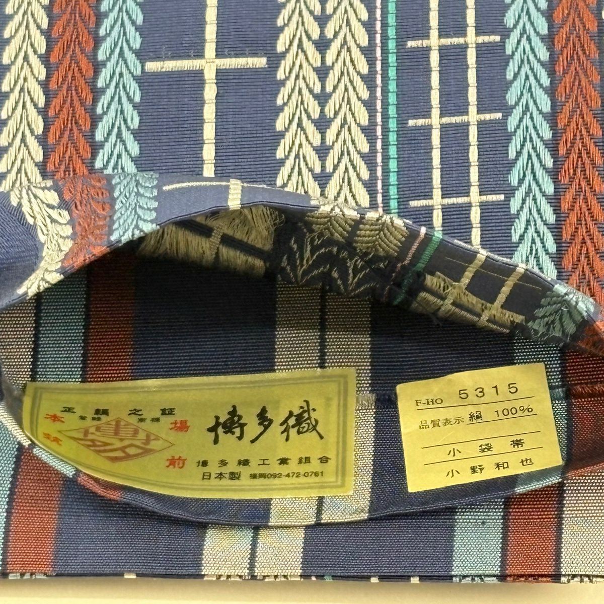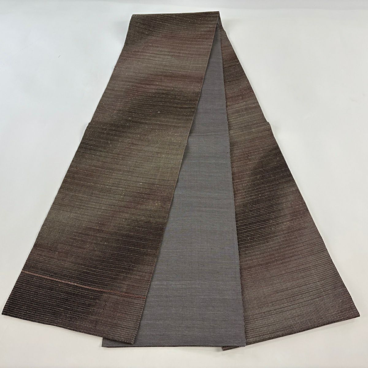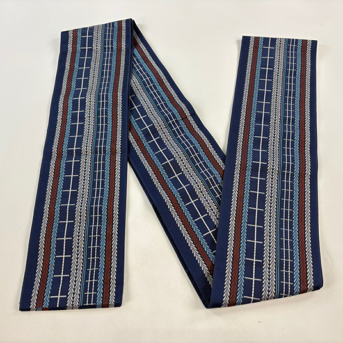 【美品】 袋帯 秀品 紬地 縞 幾何学模様 茶緑色 全通 正絹