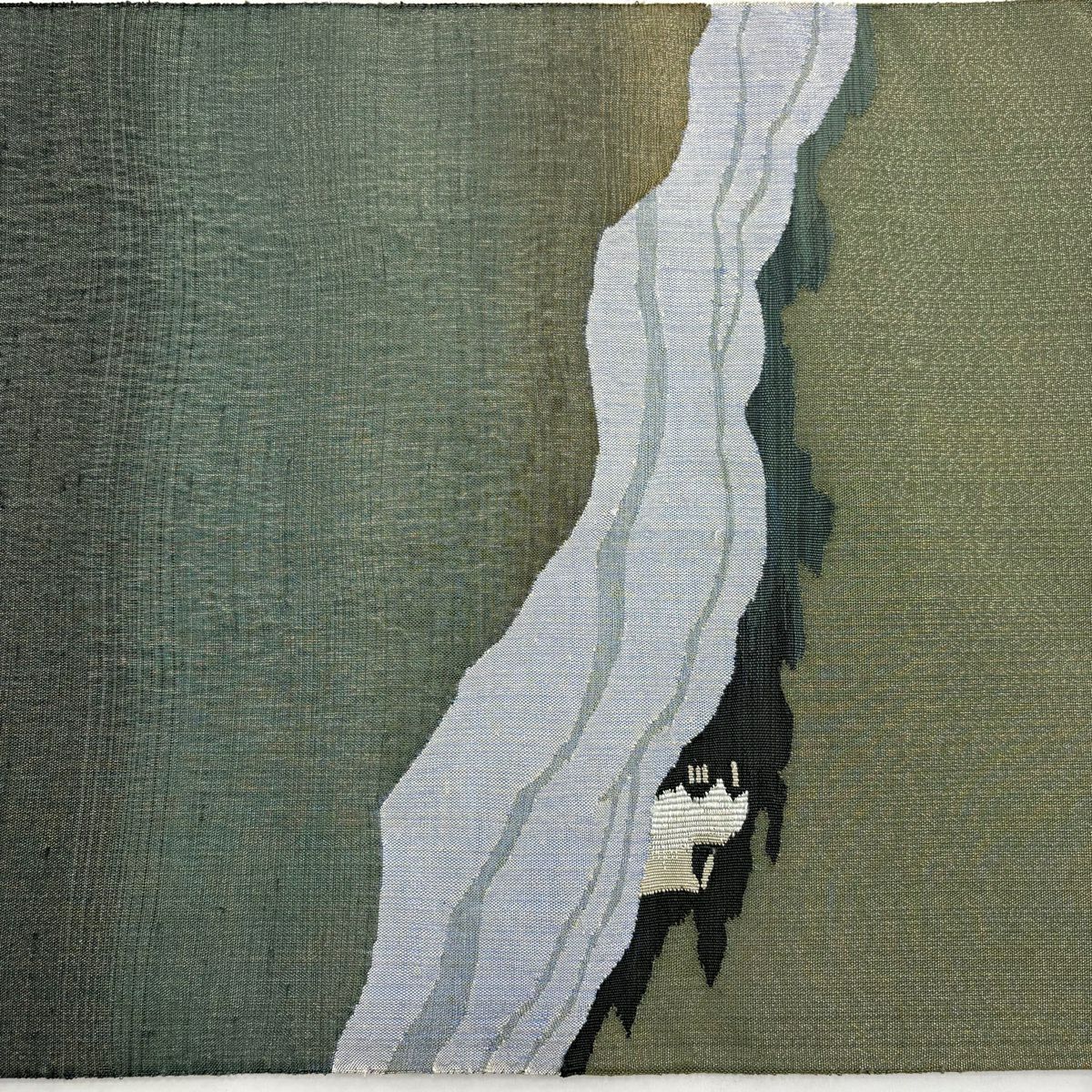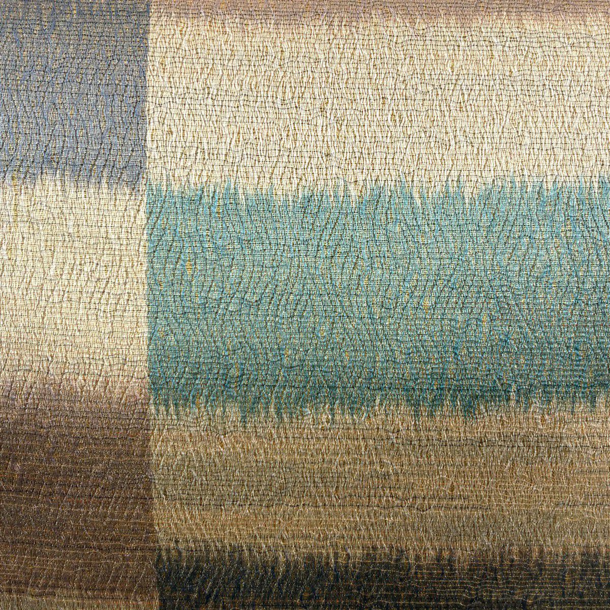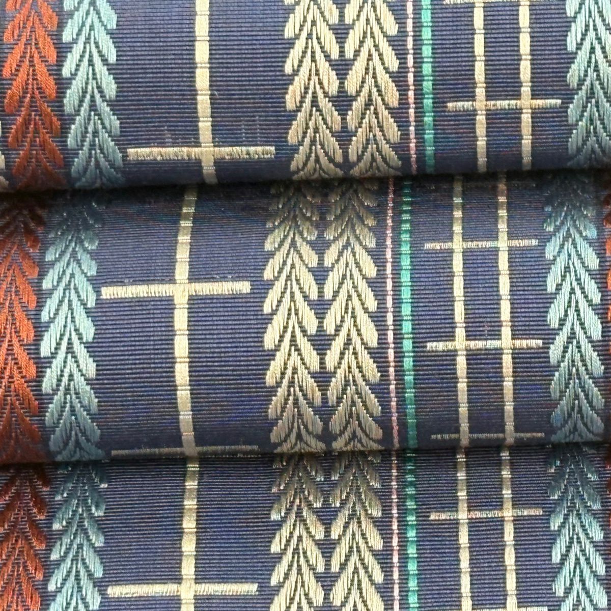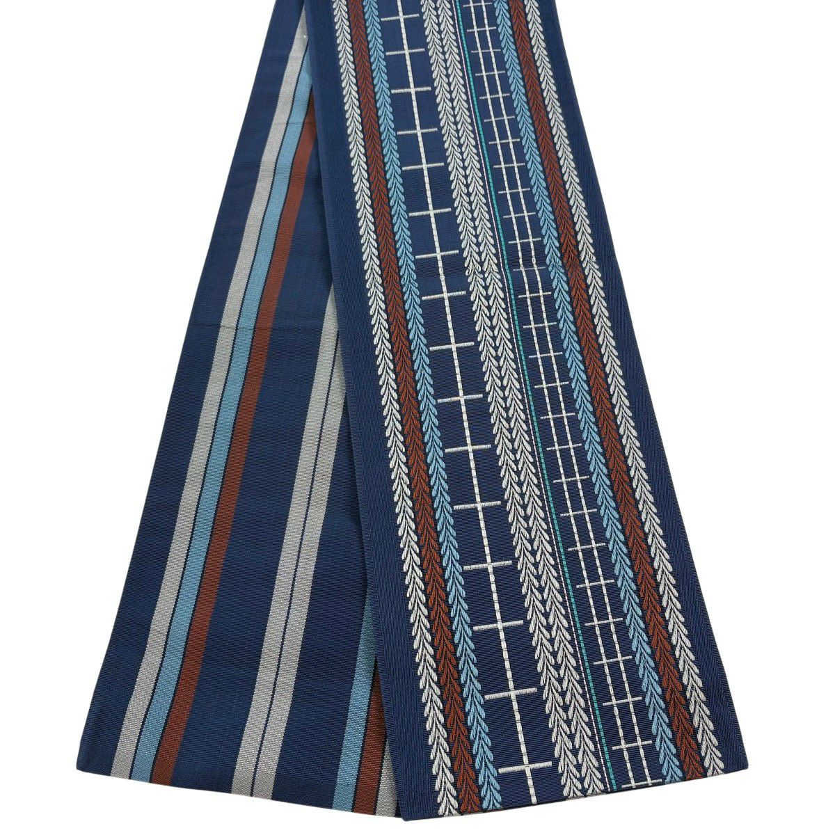 【美品】 袋帯 秀品 紬地 縞 幾何学模様 茶緑色 全通 正絹
