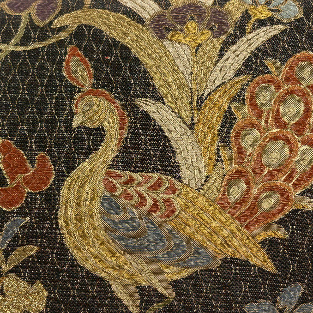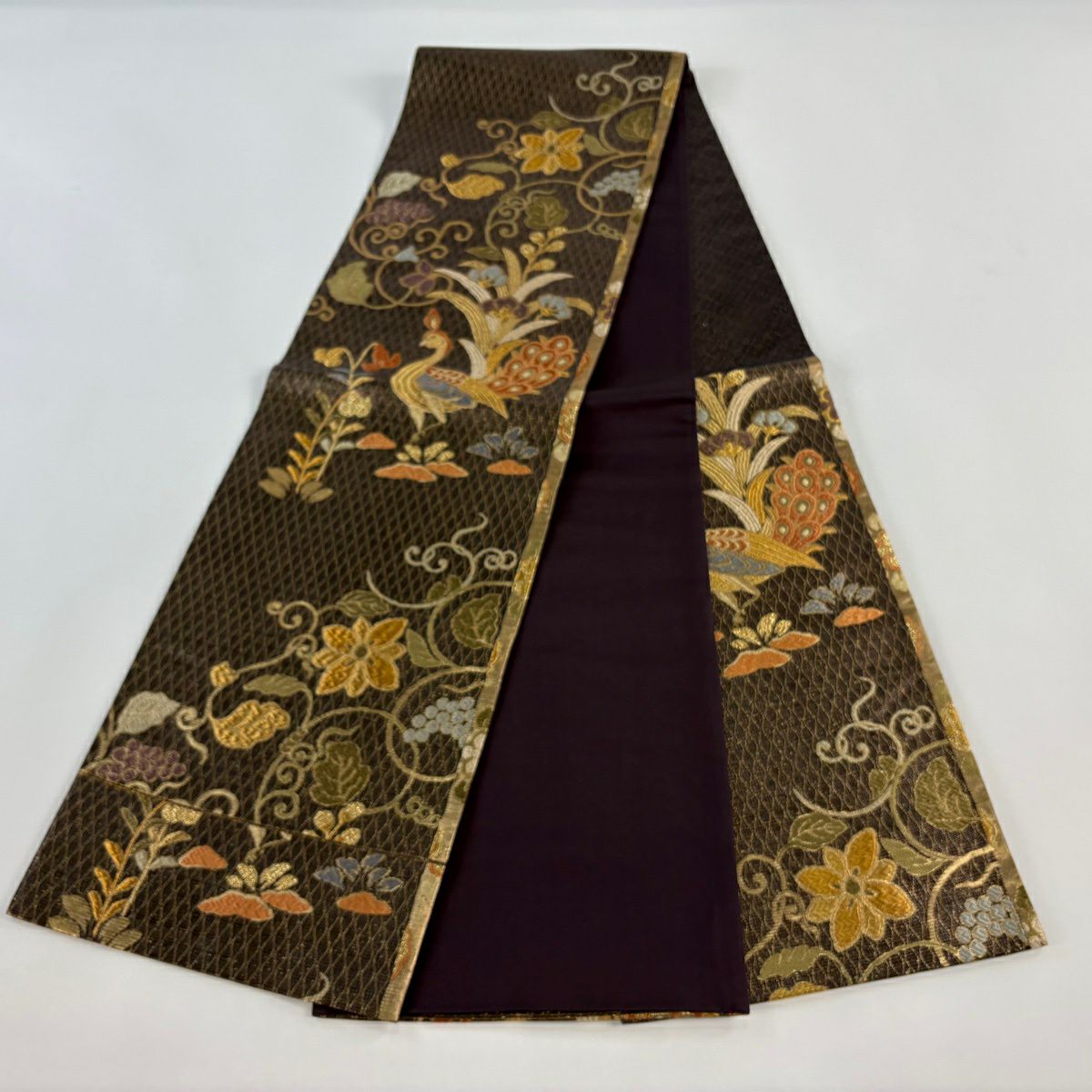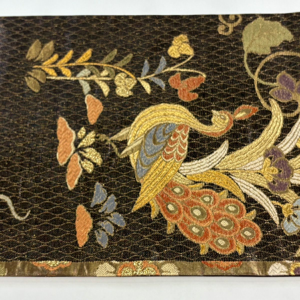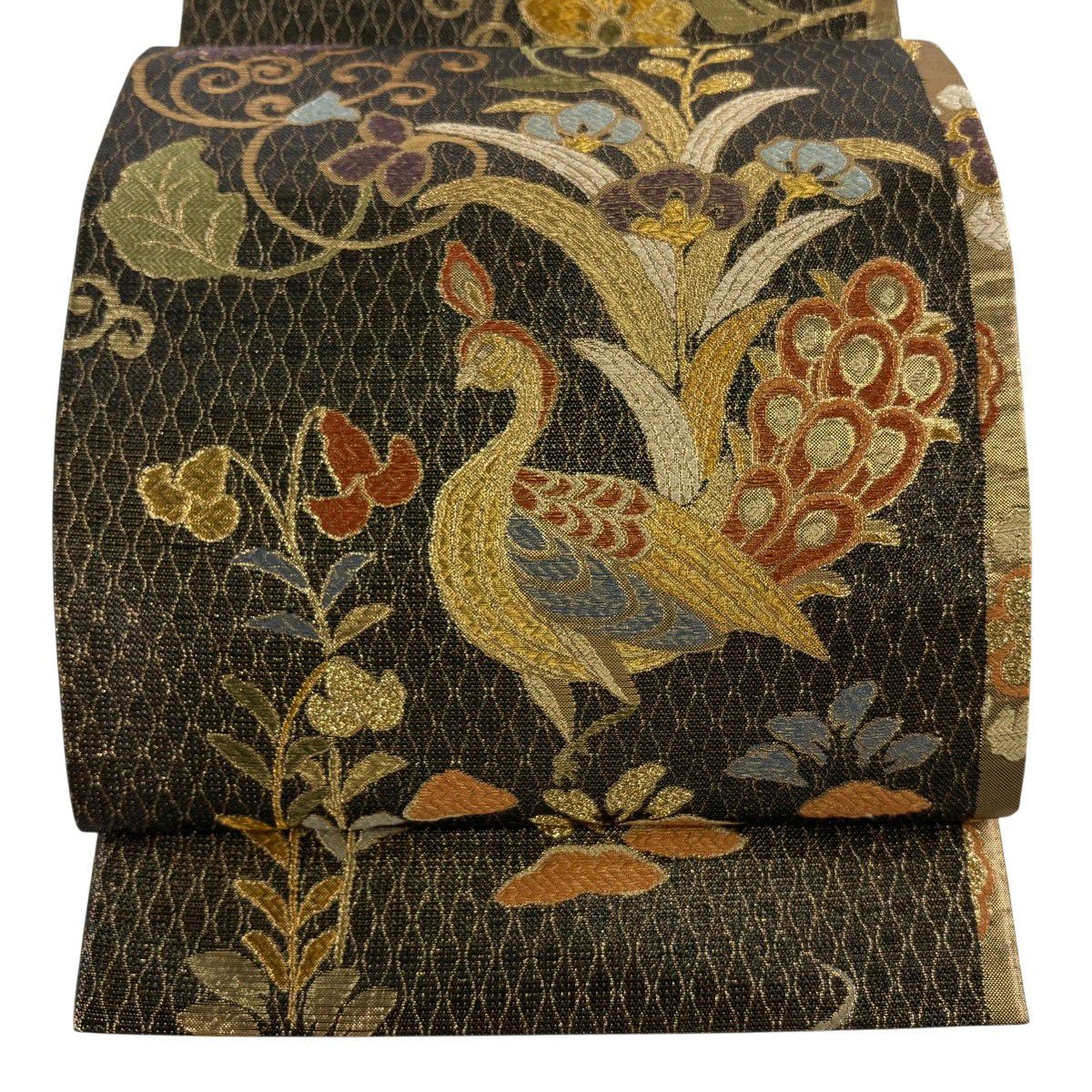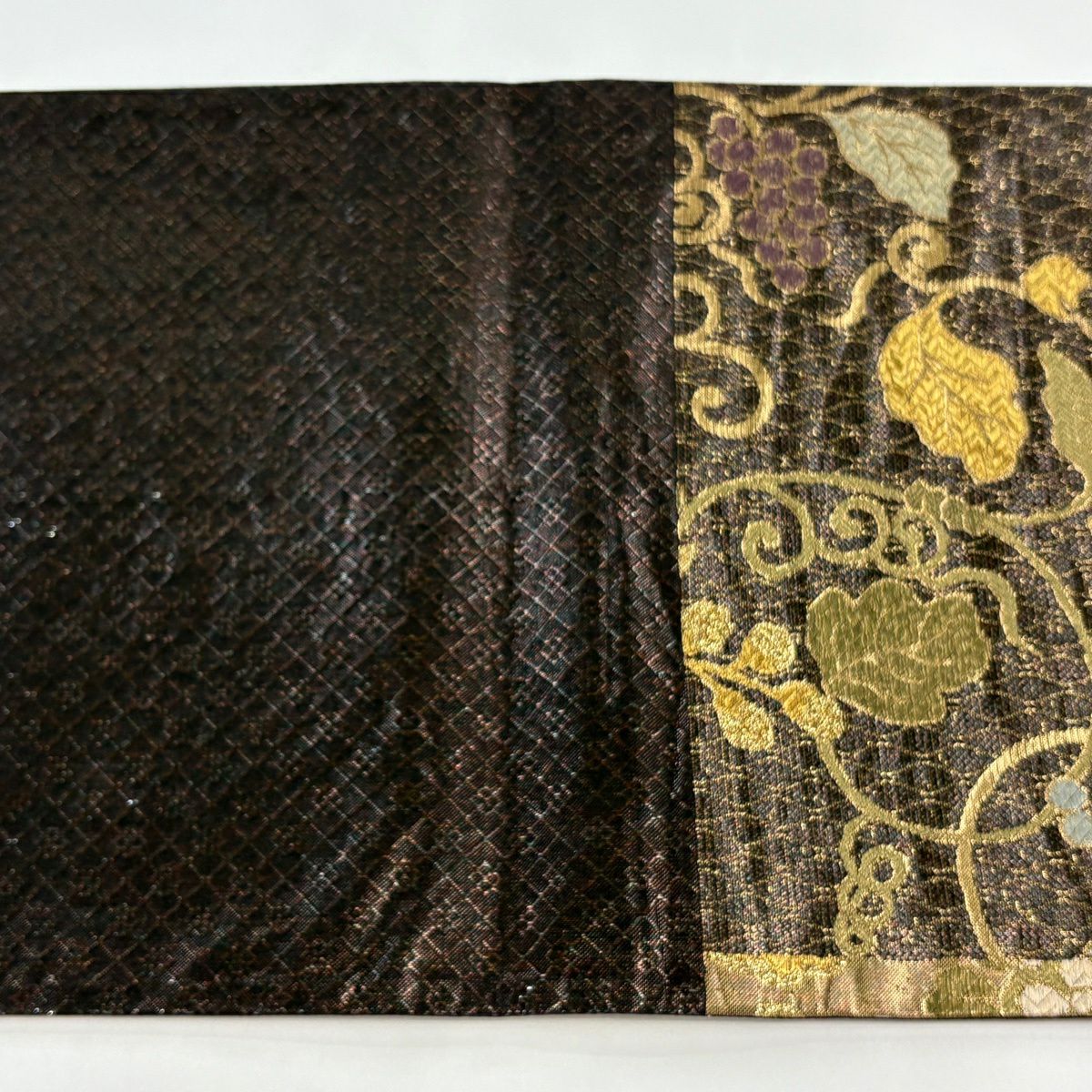【美品】 袋帯 秀品 孔雀 葡萄 金糸 箔 焦茶色 六通 正絹