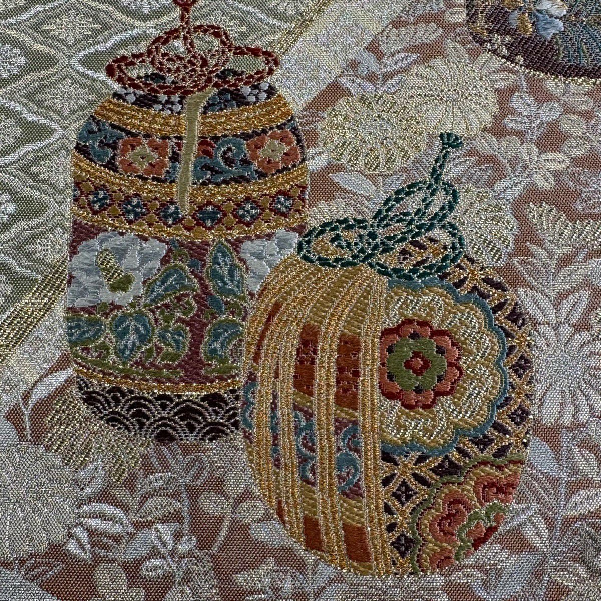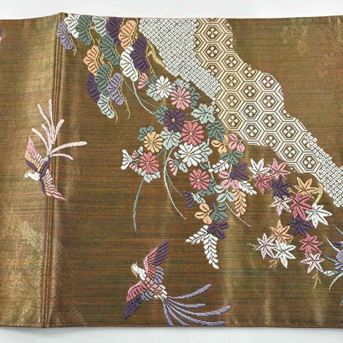 【美品】 袋帯 秀品 花鳥 亀甲 唐織 箔 薄茶色 六通 正絹