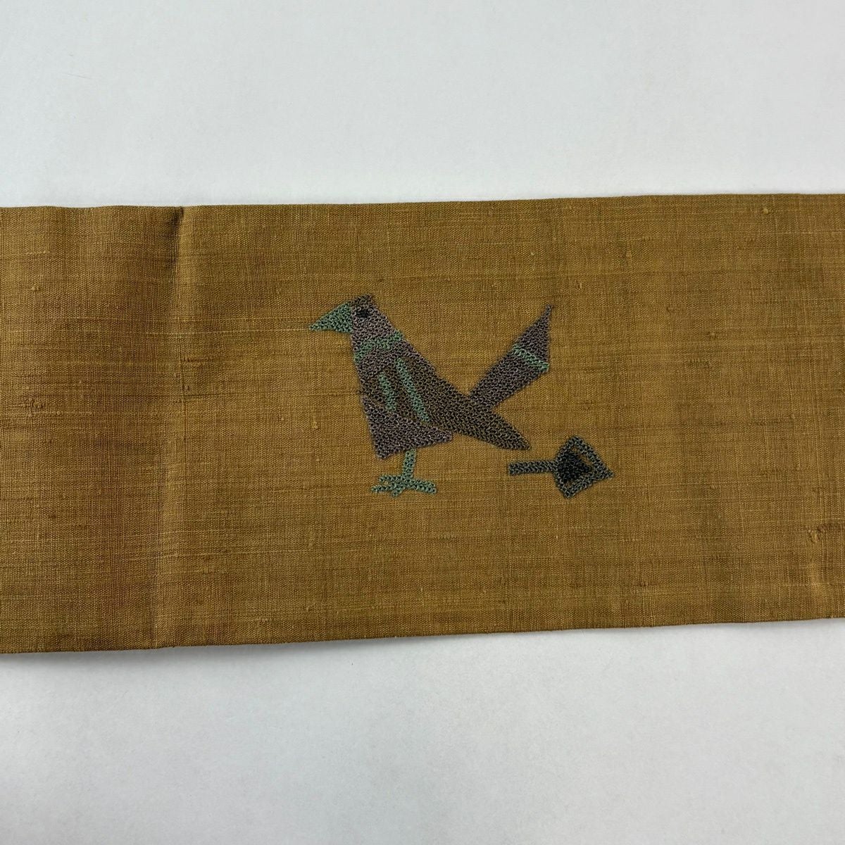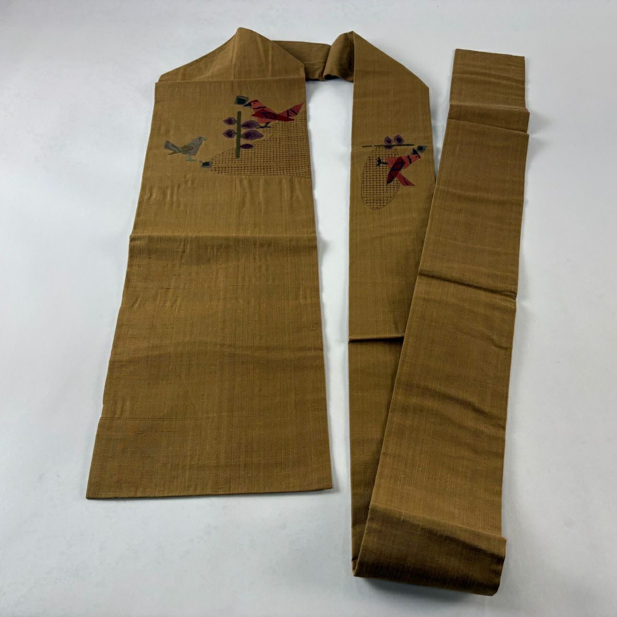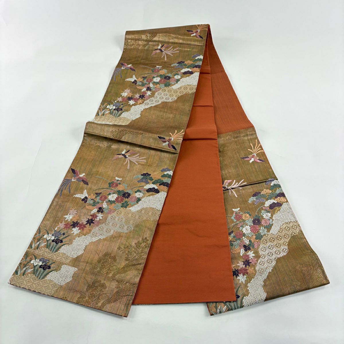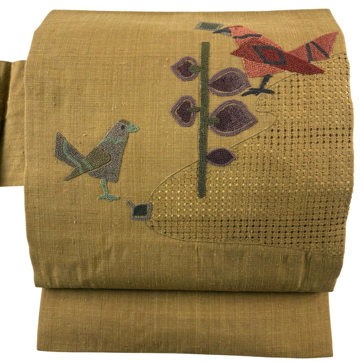 【美品】 名古屋帯 秀品 紬地 鳥 草花 刺繍 山吹茶色 正絹