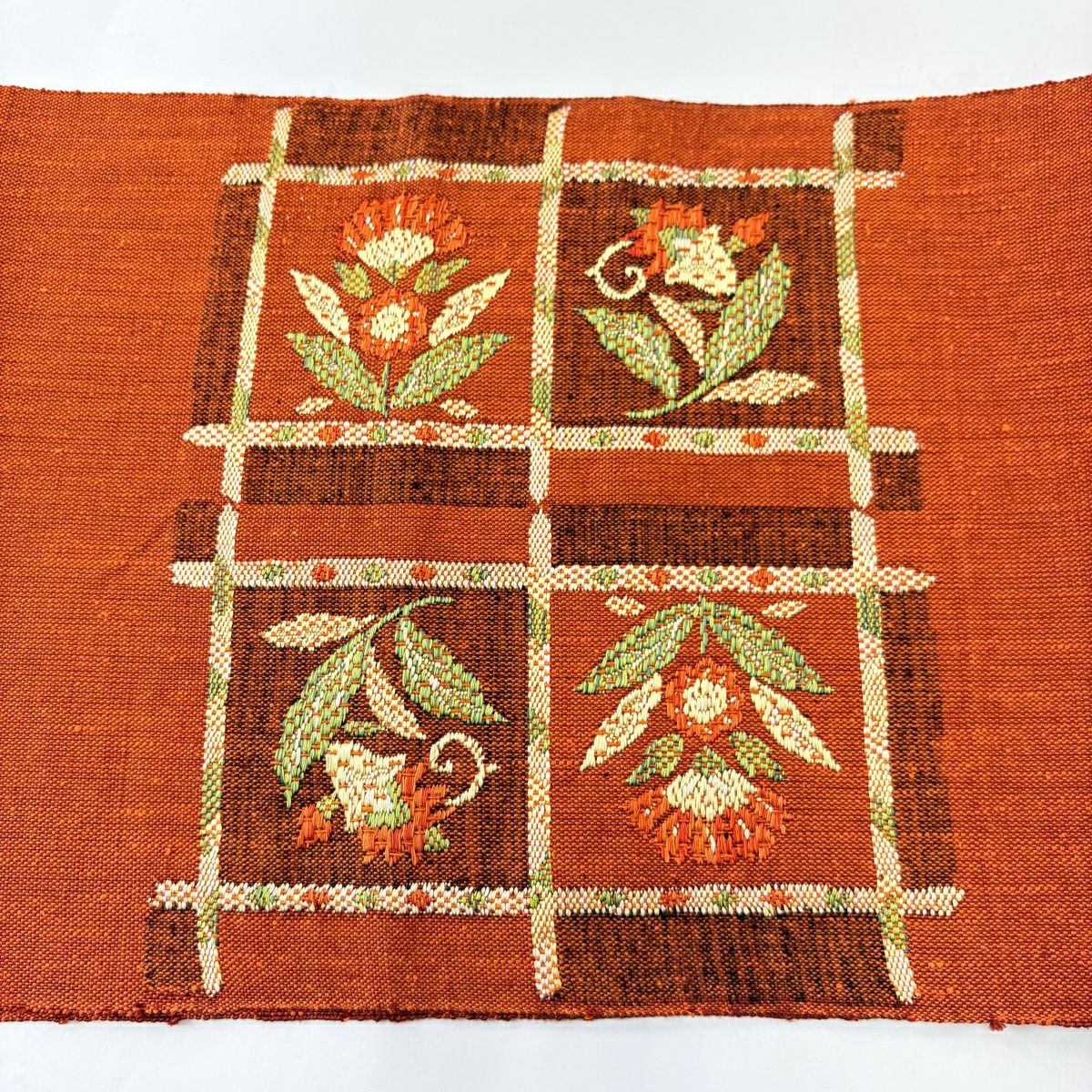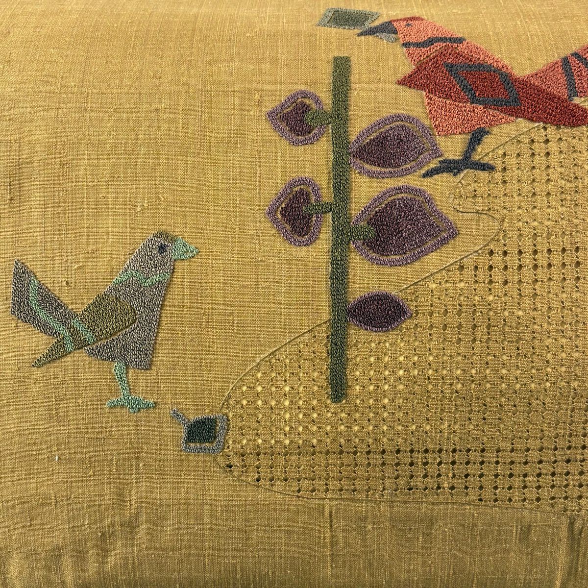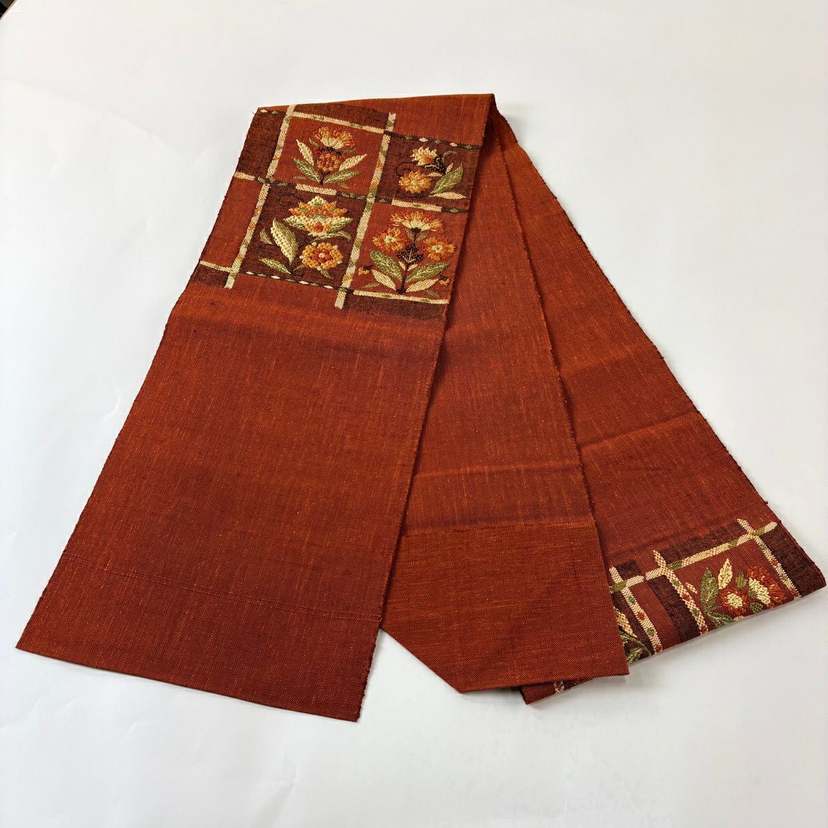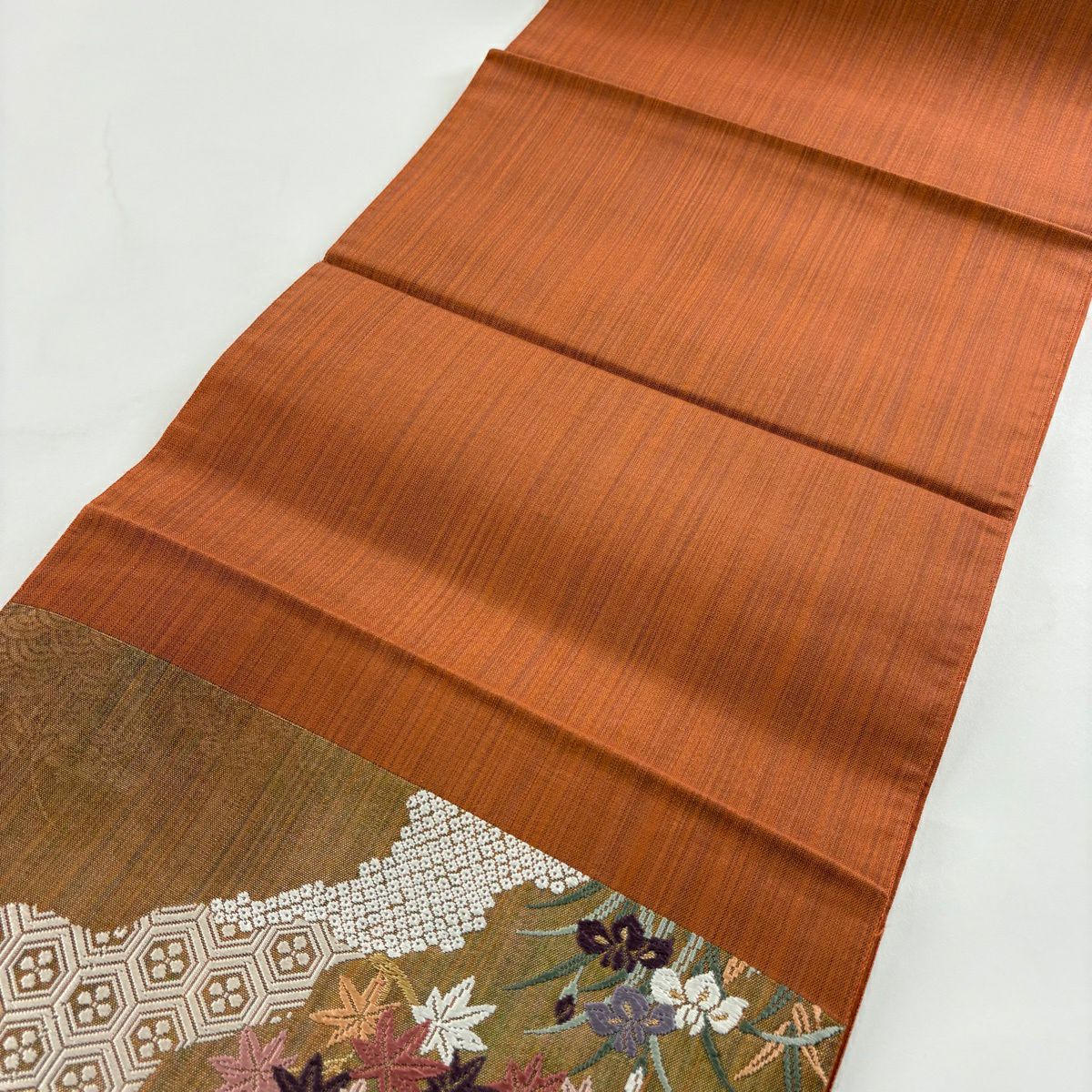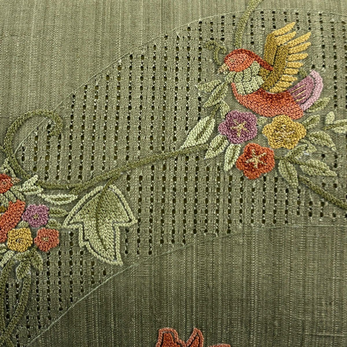 【美品】 名古屋帯 秀品 紬地 鳥 草花 刺繍 山吹茶色 正絹