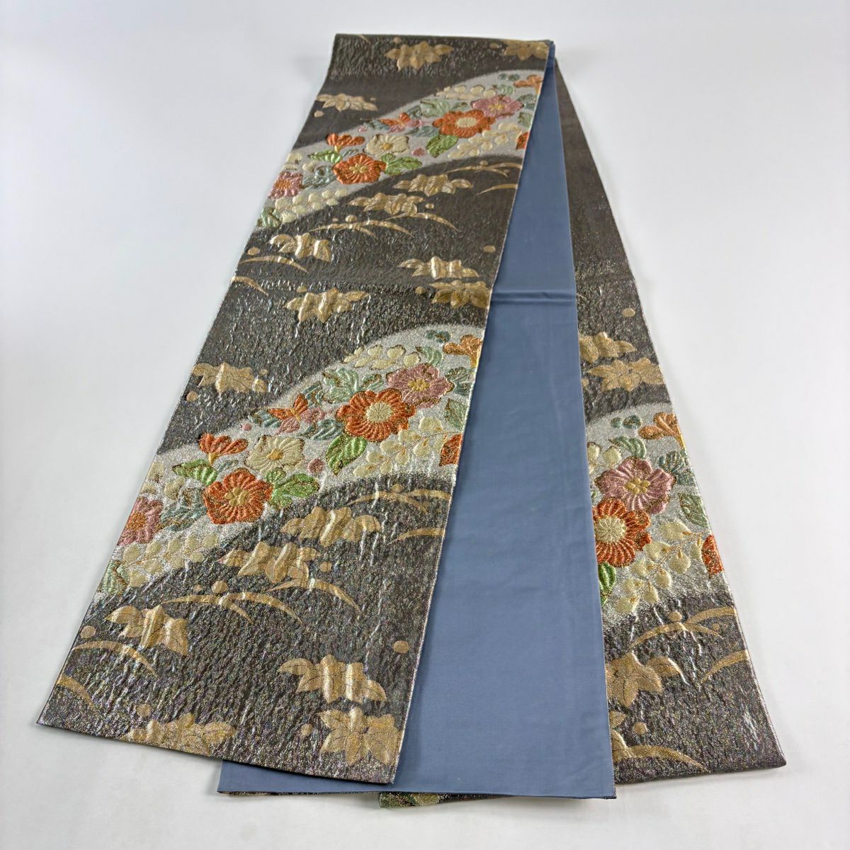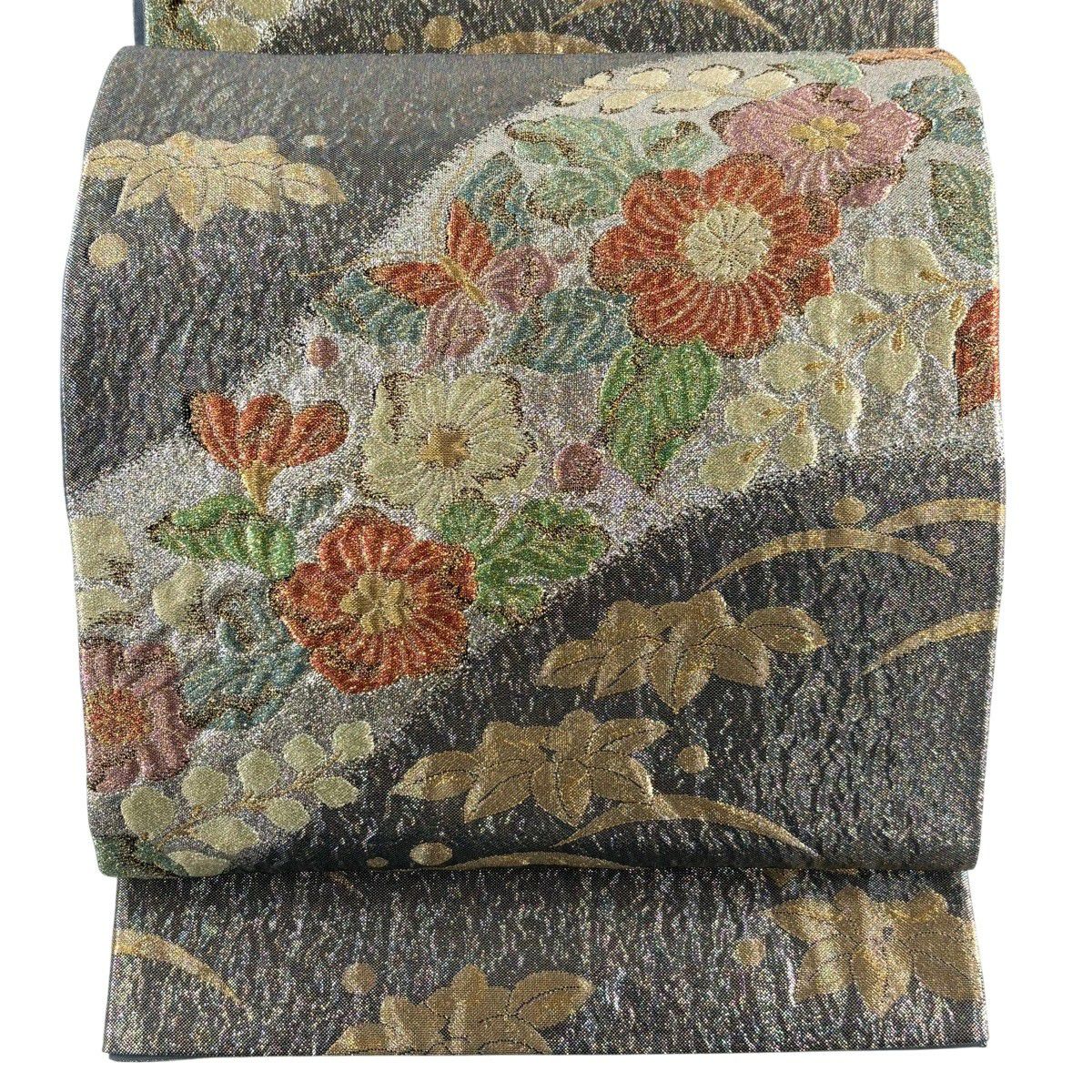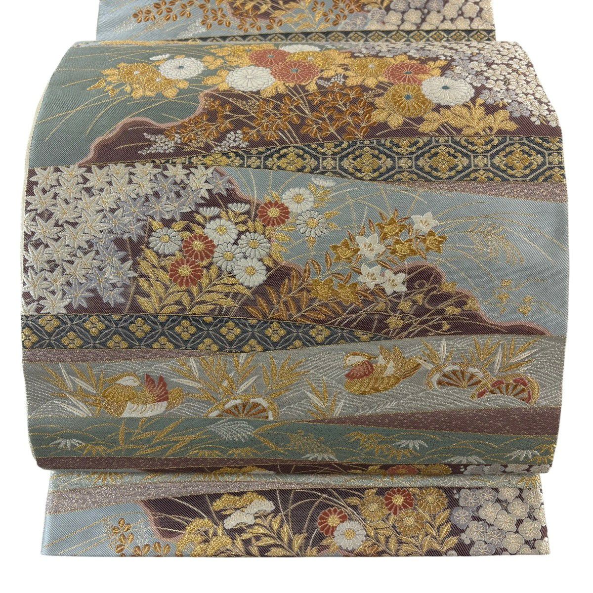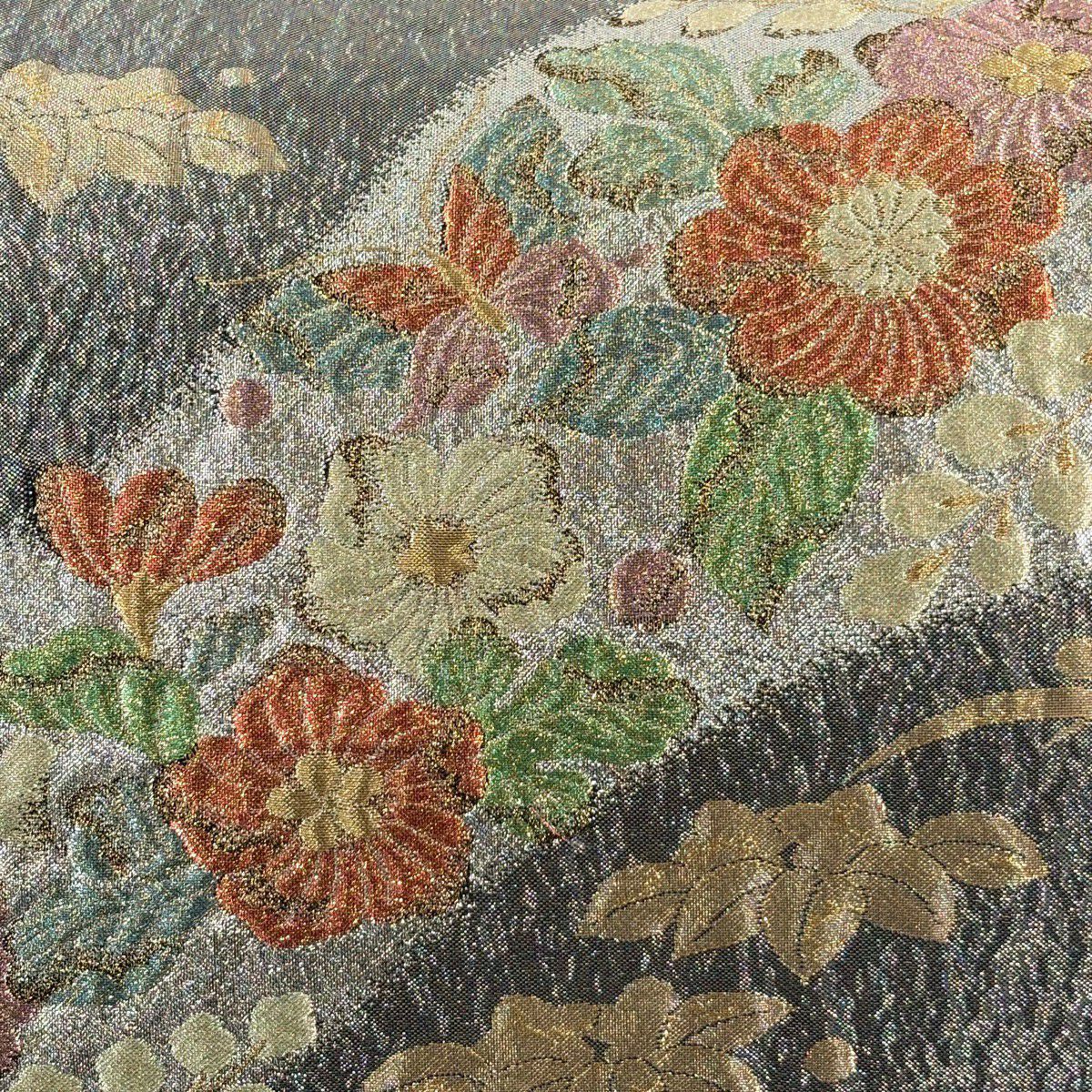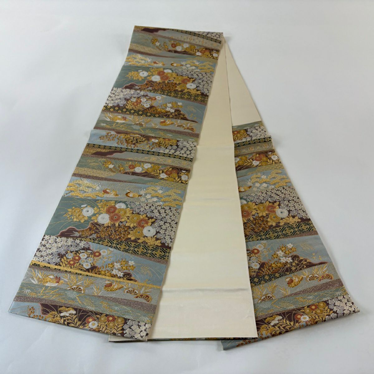 【美品】 袋帯 秀品 秋草 鴛鴦 金銀糸 箔 灰色 六通 正絹