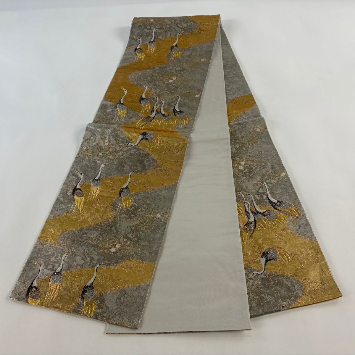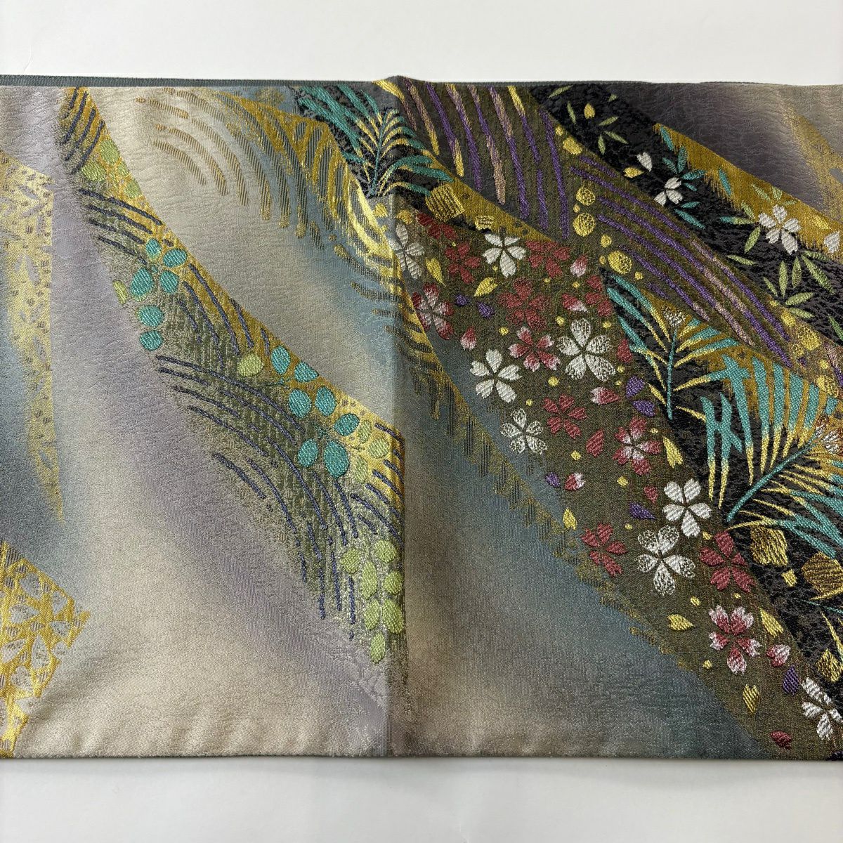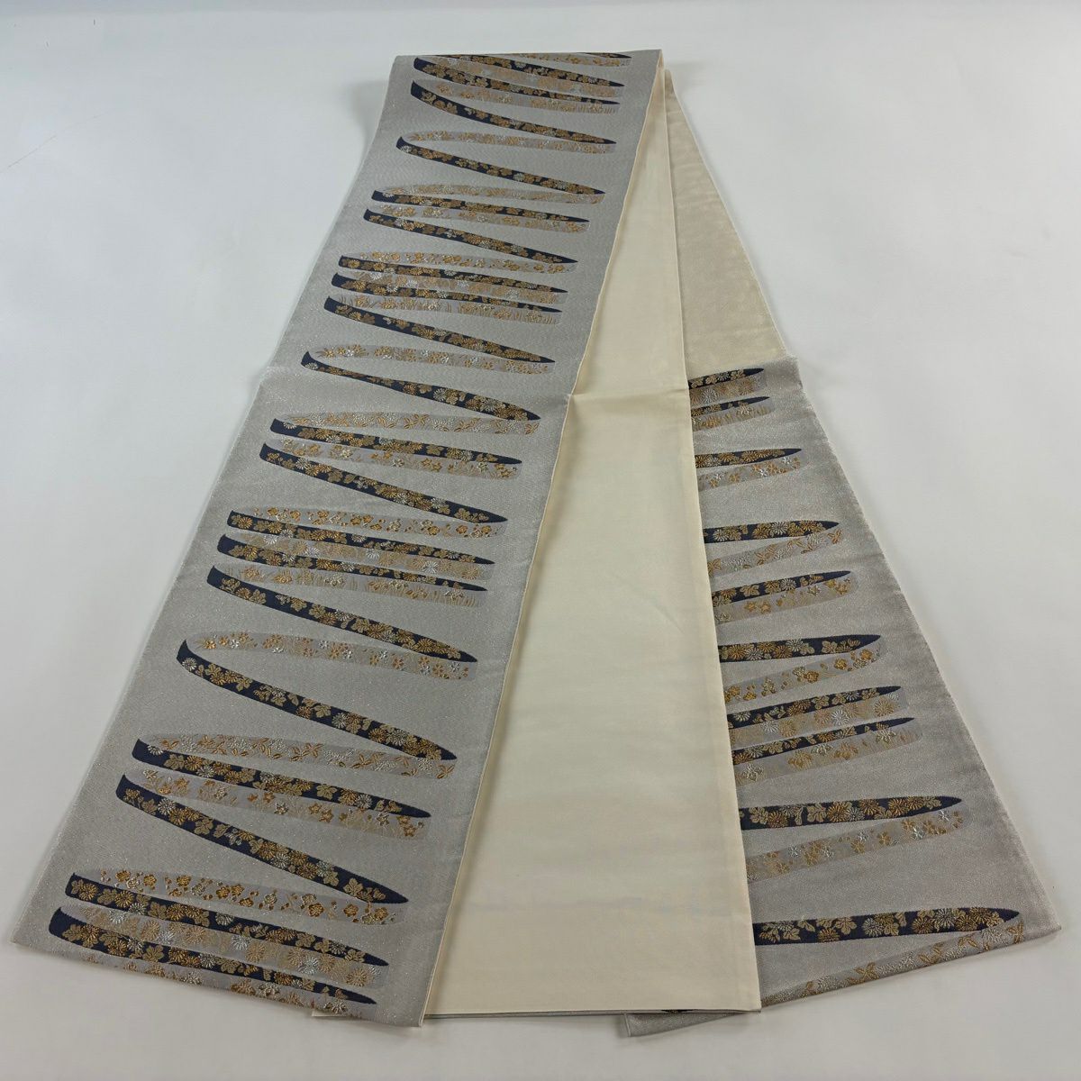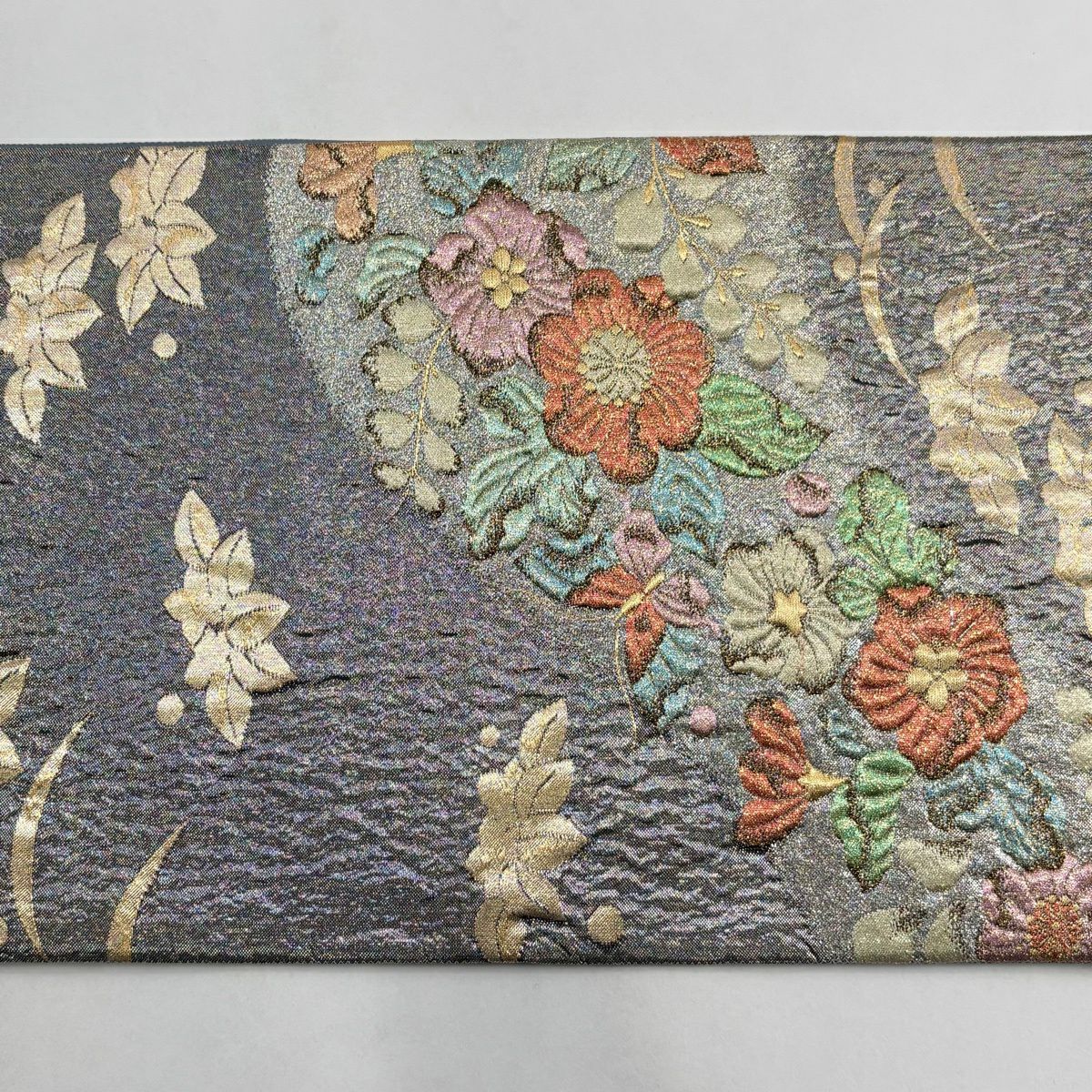 【美品】 袋帯 秀品 秋草 鴛鴦 金銀糸 箔 灰色 六通 正絹