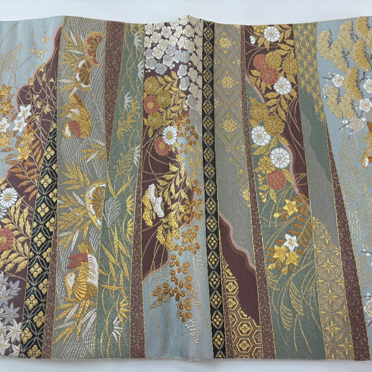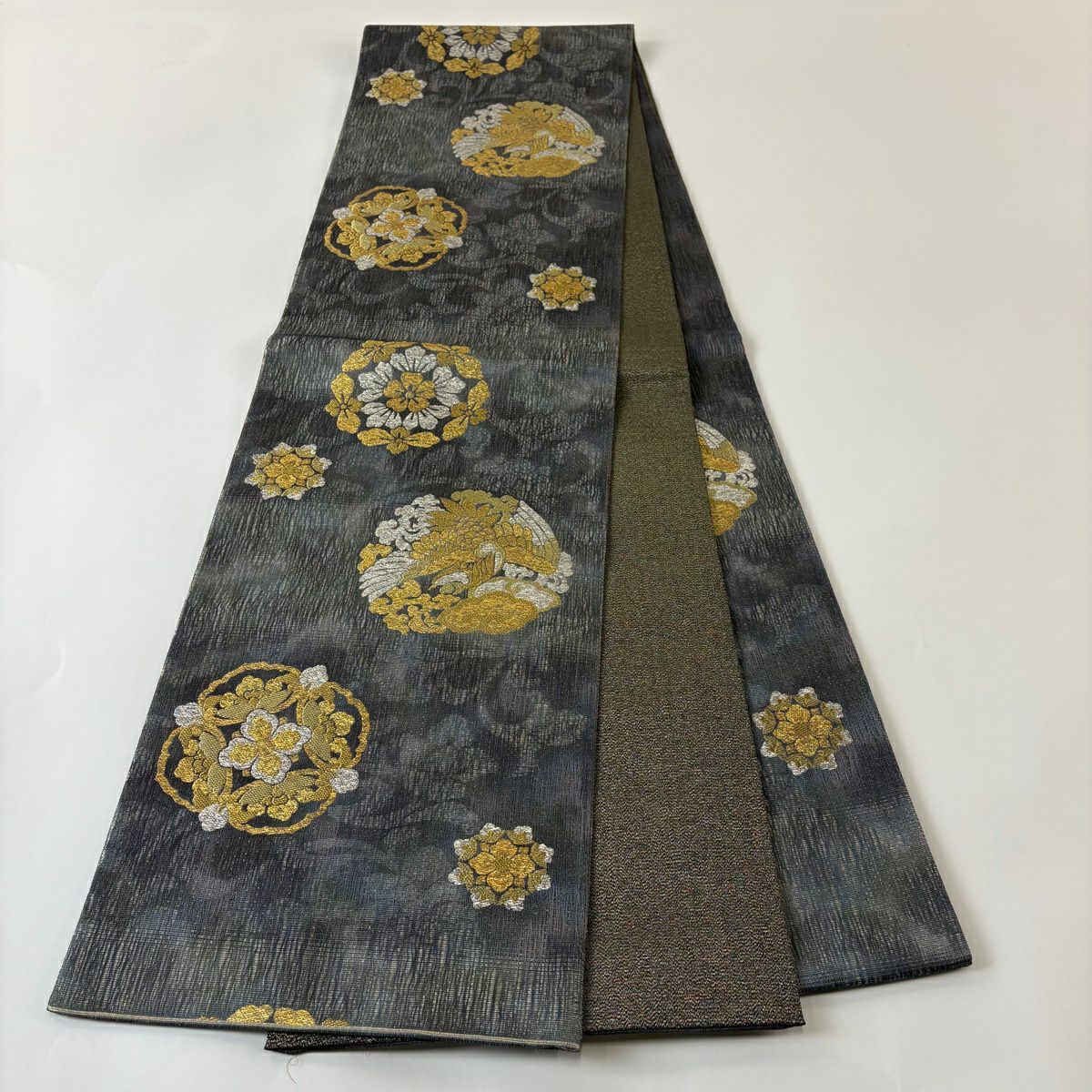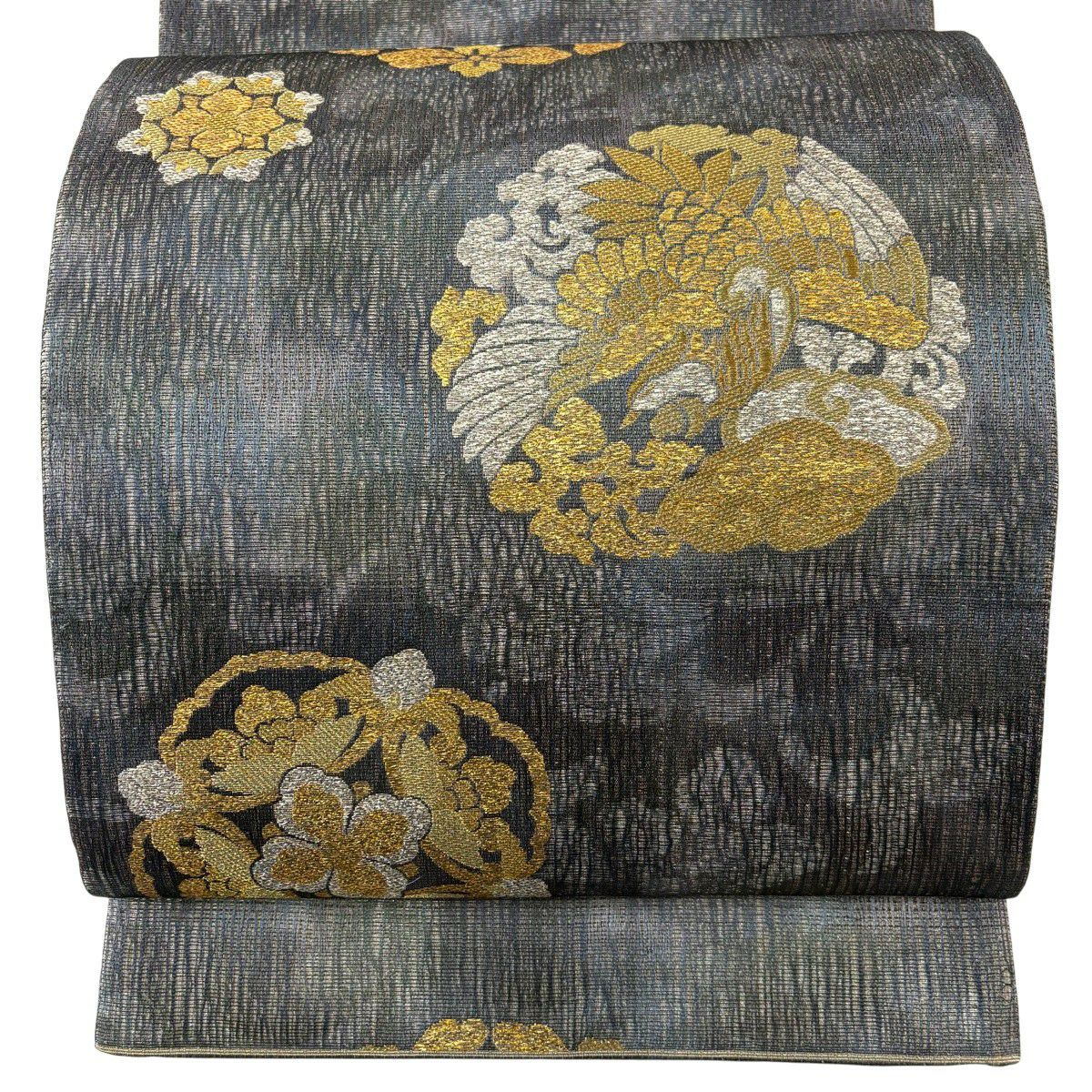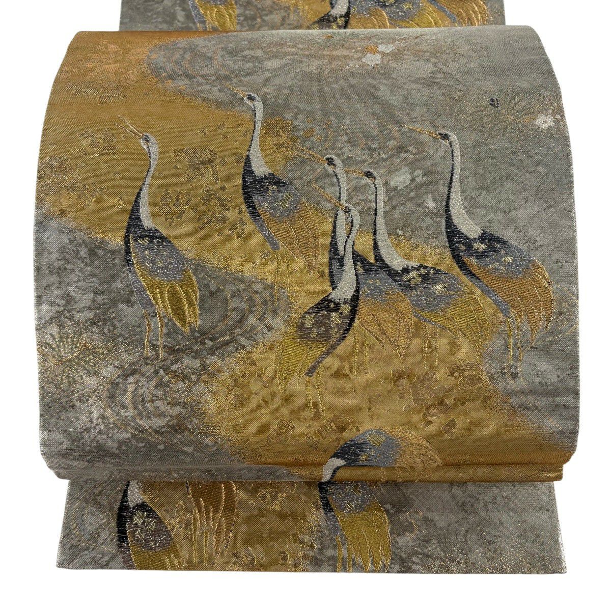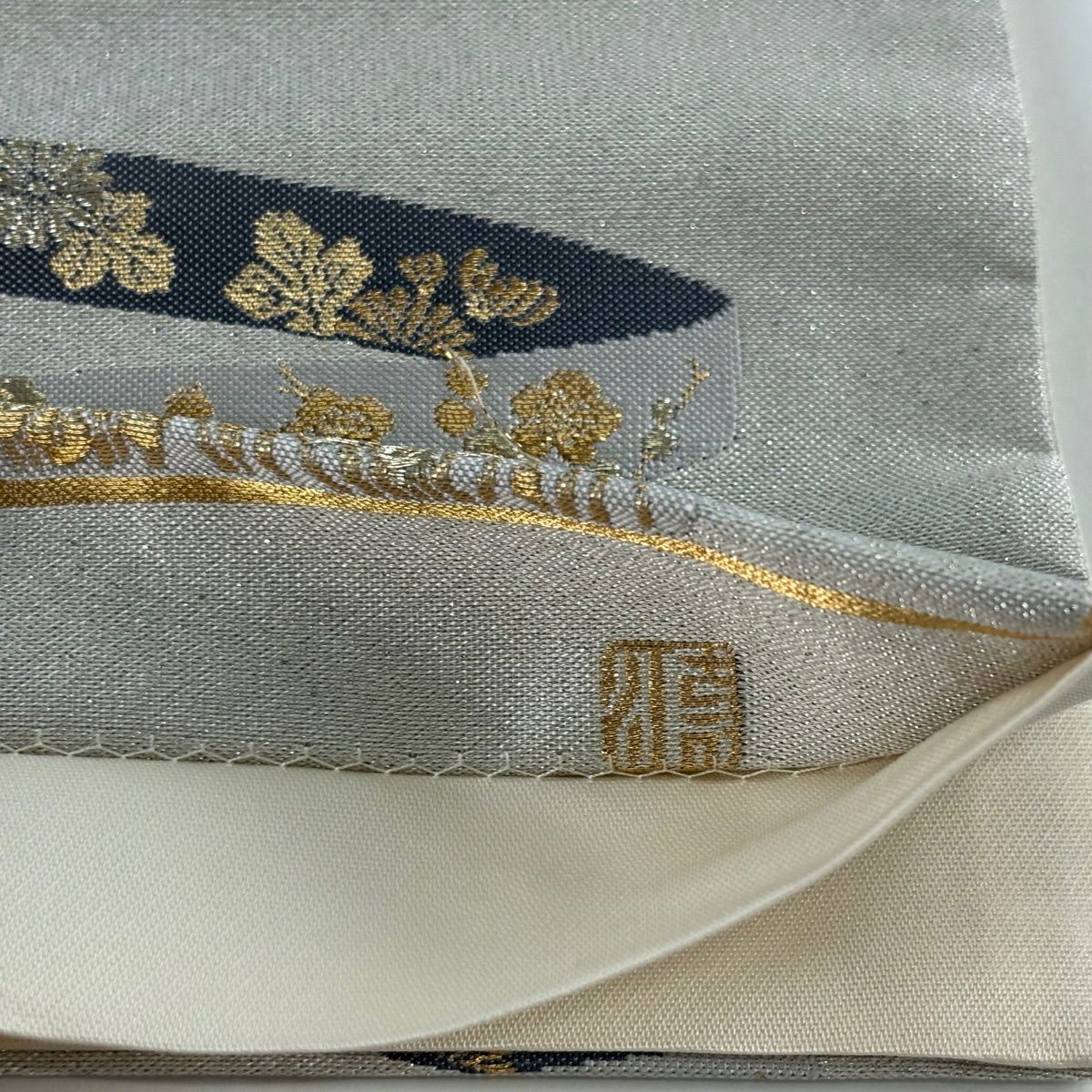 【美品】 袋帯 秀品 秋草 鴛鴦 金銀糸 箔 灰色 六通 正絹