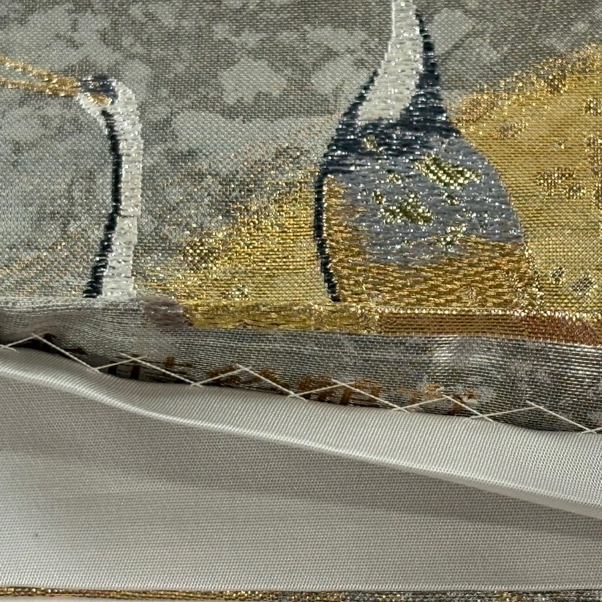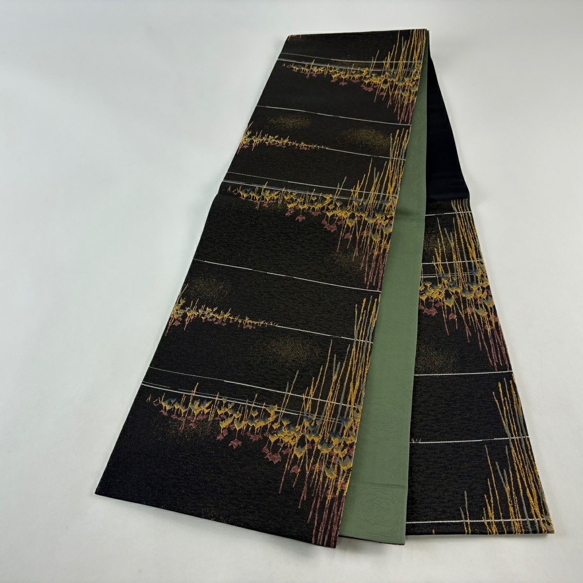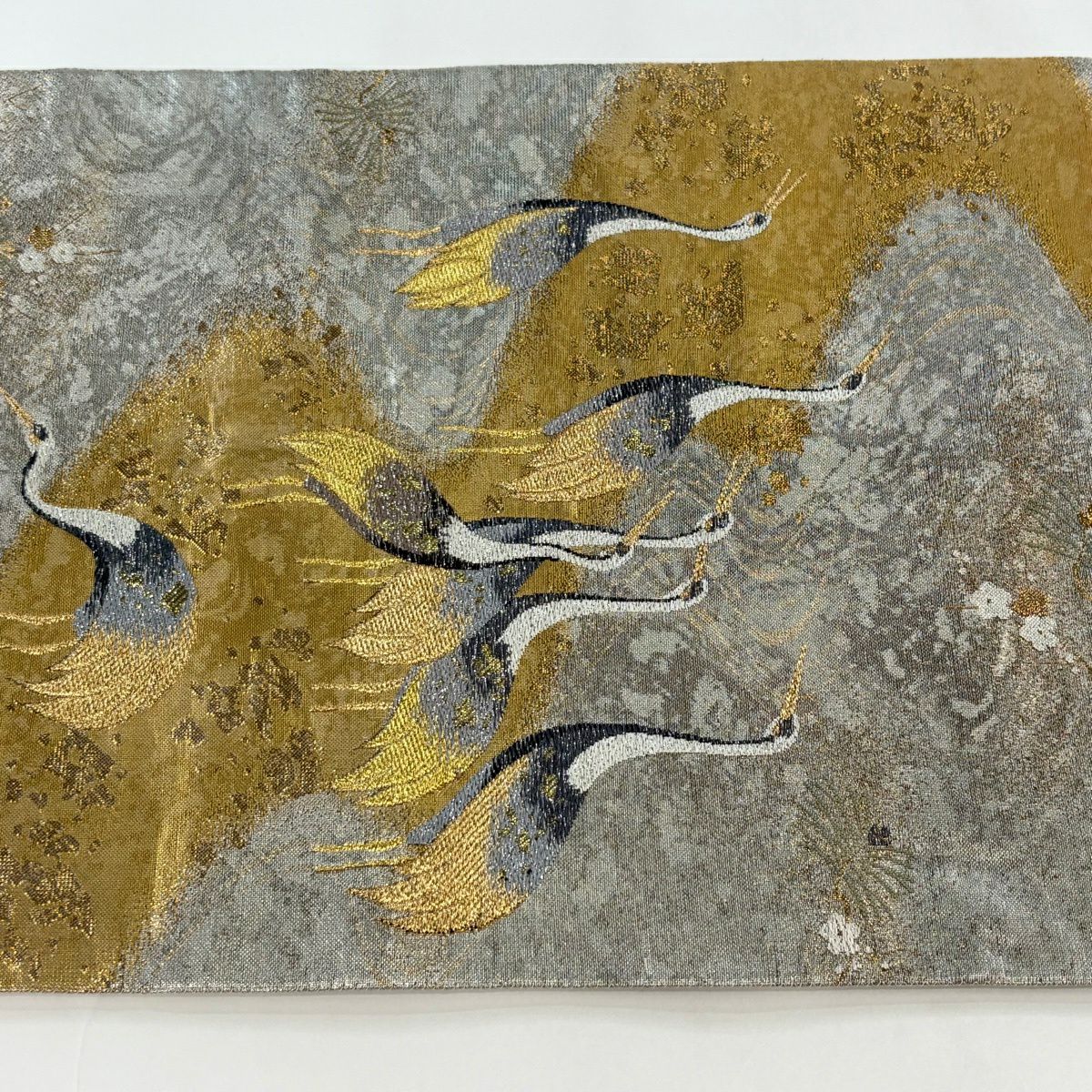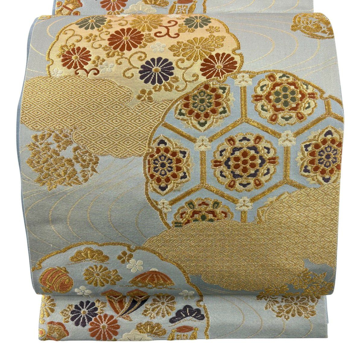 【美品】 袋帯 秀品 秋草 鴛鴦 金銀糸 箔 灰色 六通 正絹