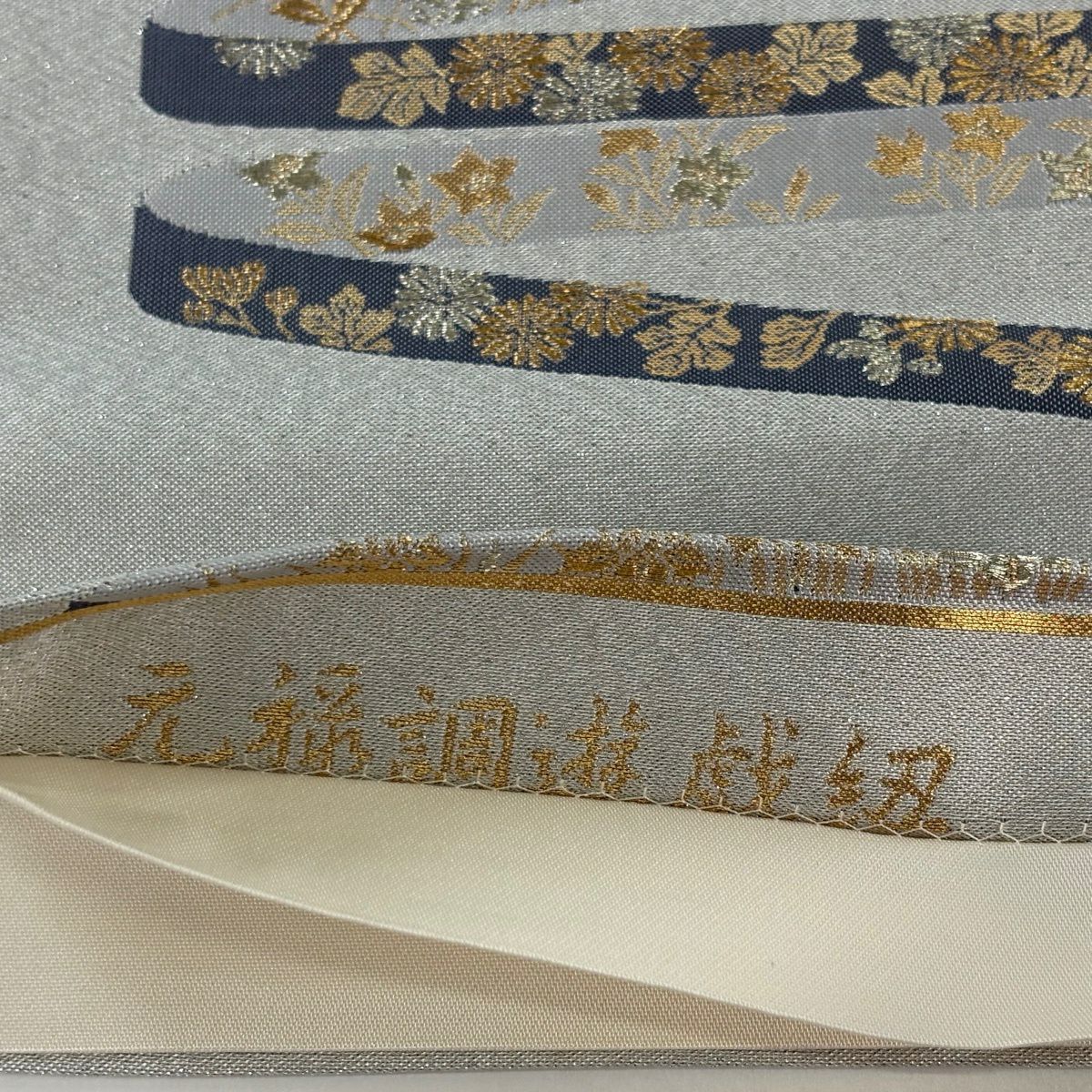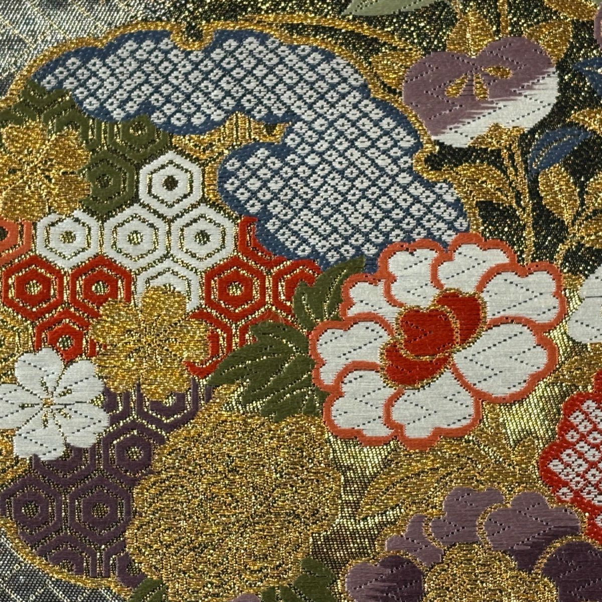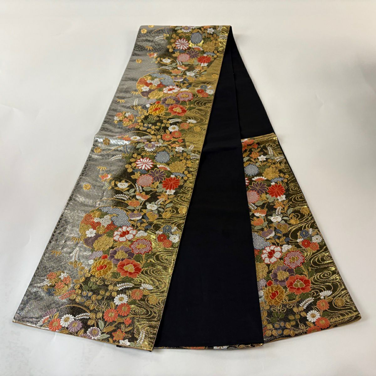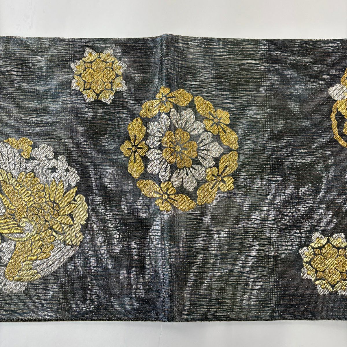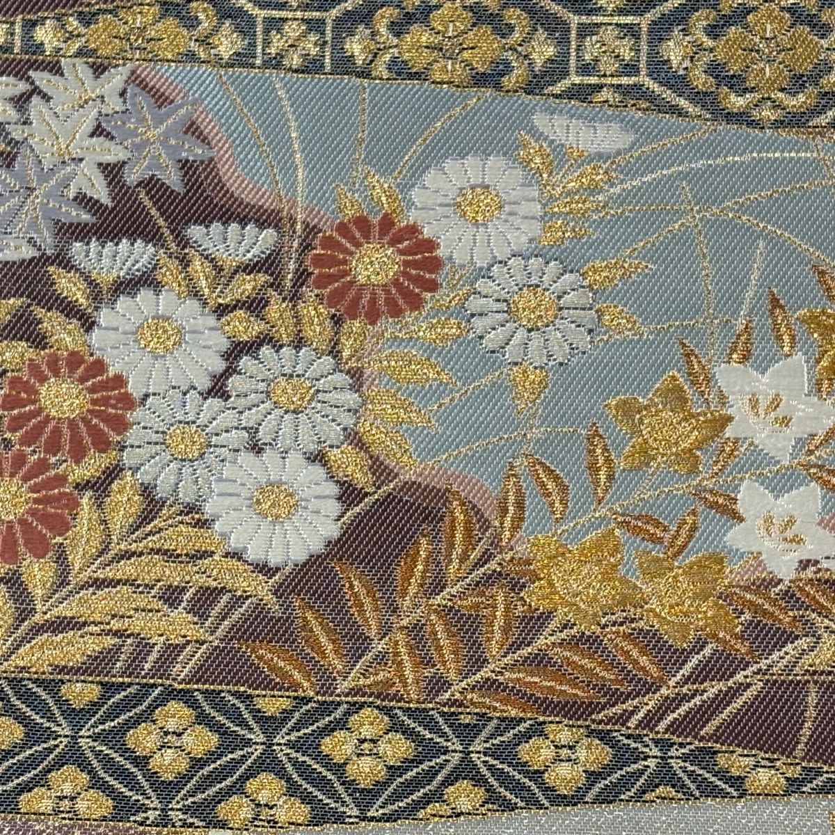 【美品】 袋帯 秀品 秋草 鴛鴦 金銀糸 箔 灰色 六通 正絹
