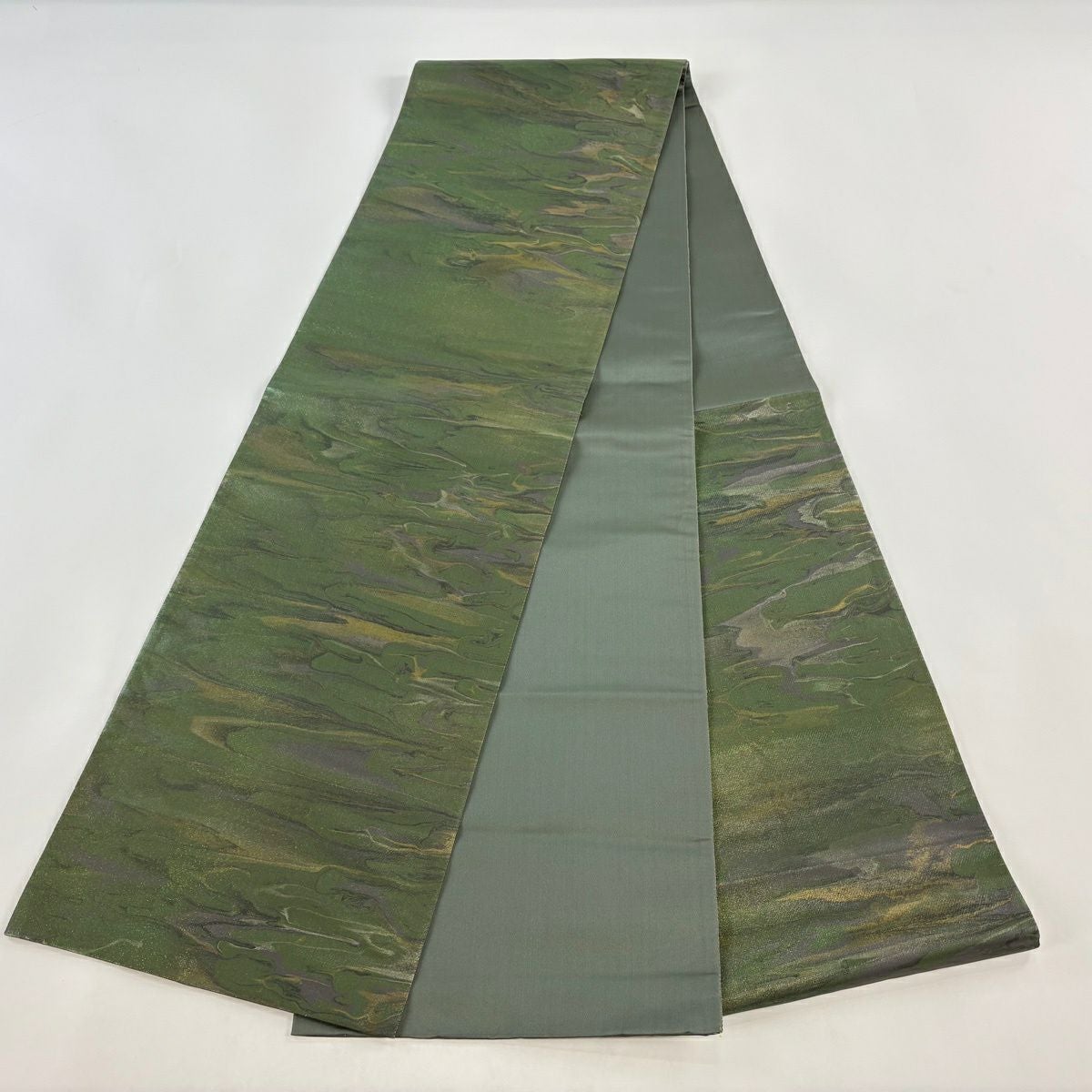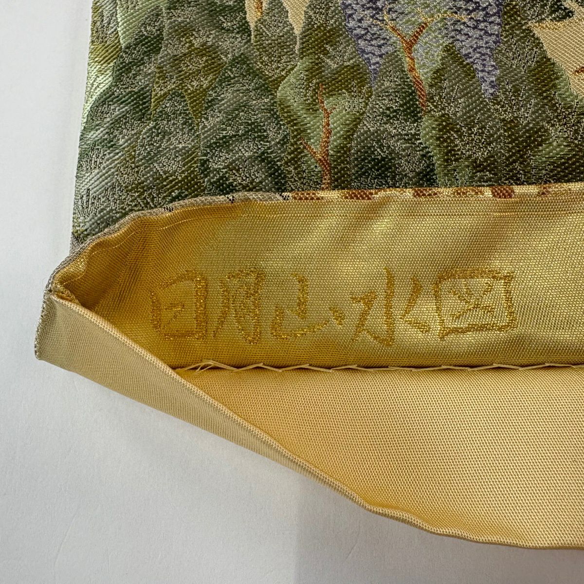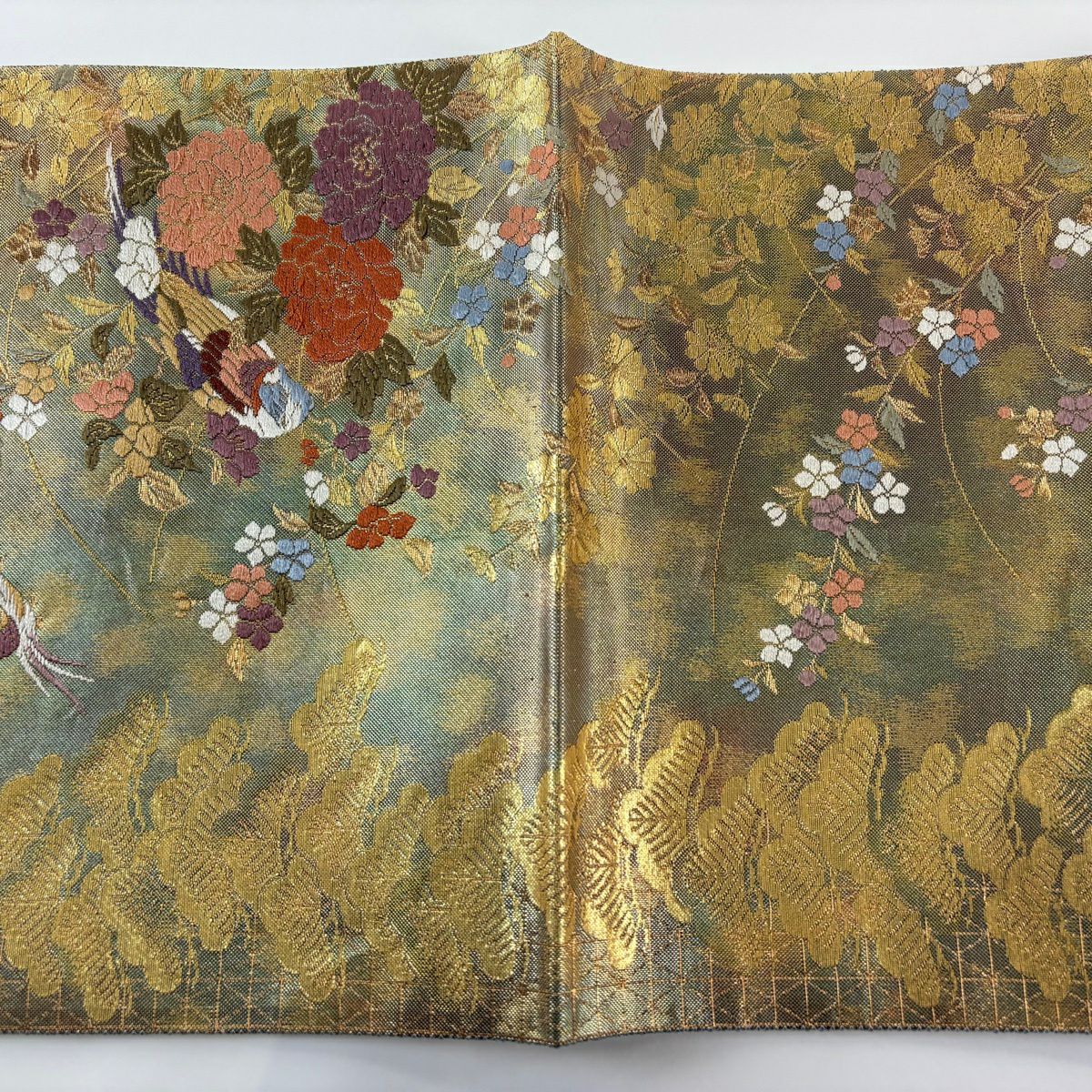 【美品】 袋帯 秀品 草花 鳥 金銀糸 箔 茶緑色 六通 正絹