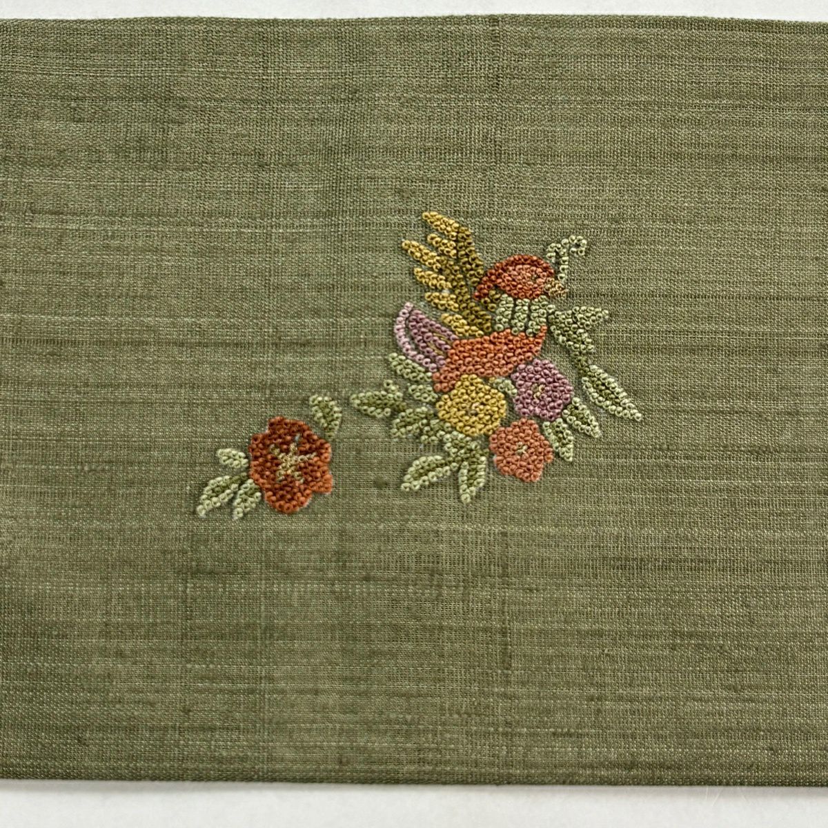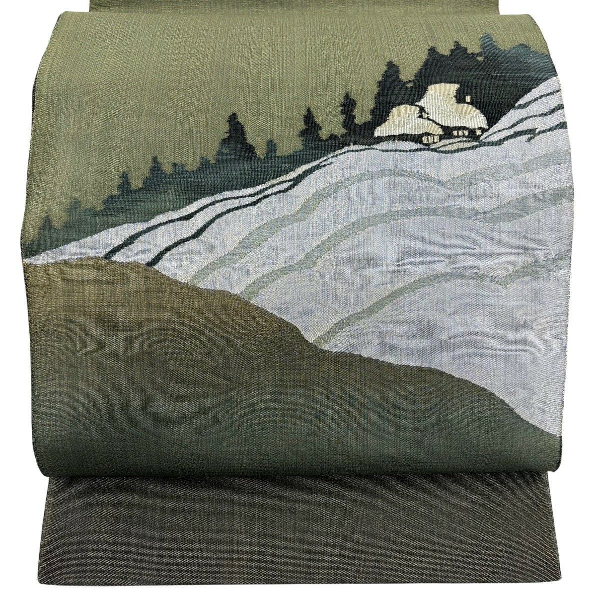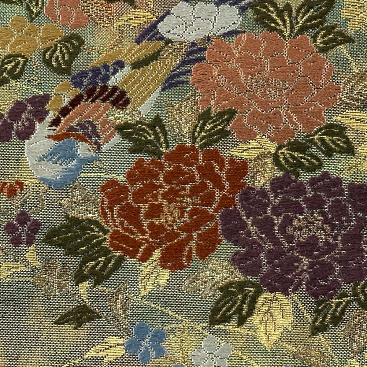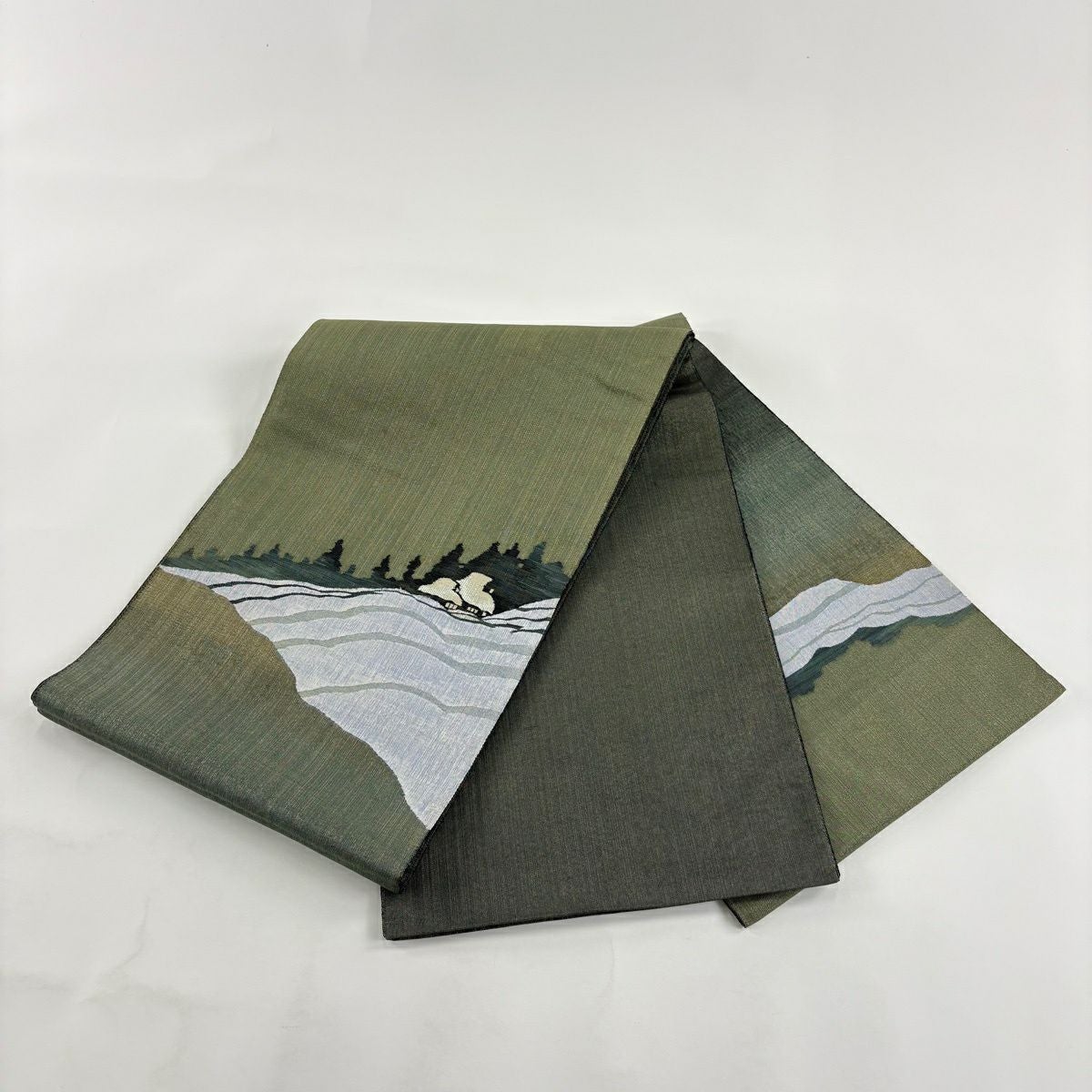 【美品】 袋帯 秀品 草花 鳥 金銀糸 箔 茶緑色 六通 正絹