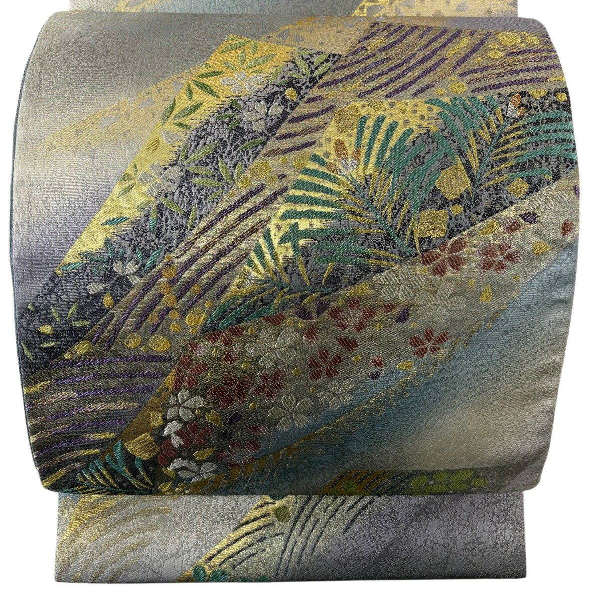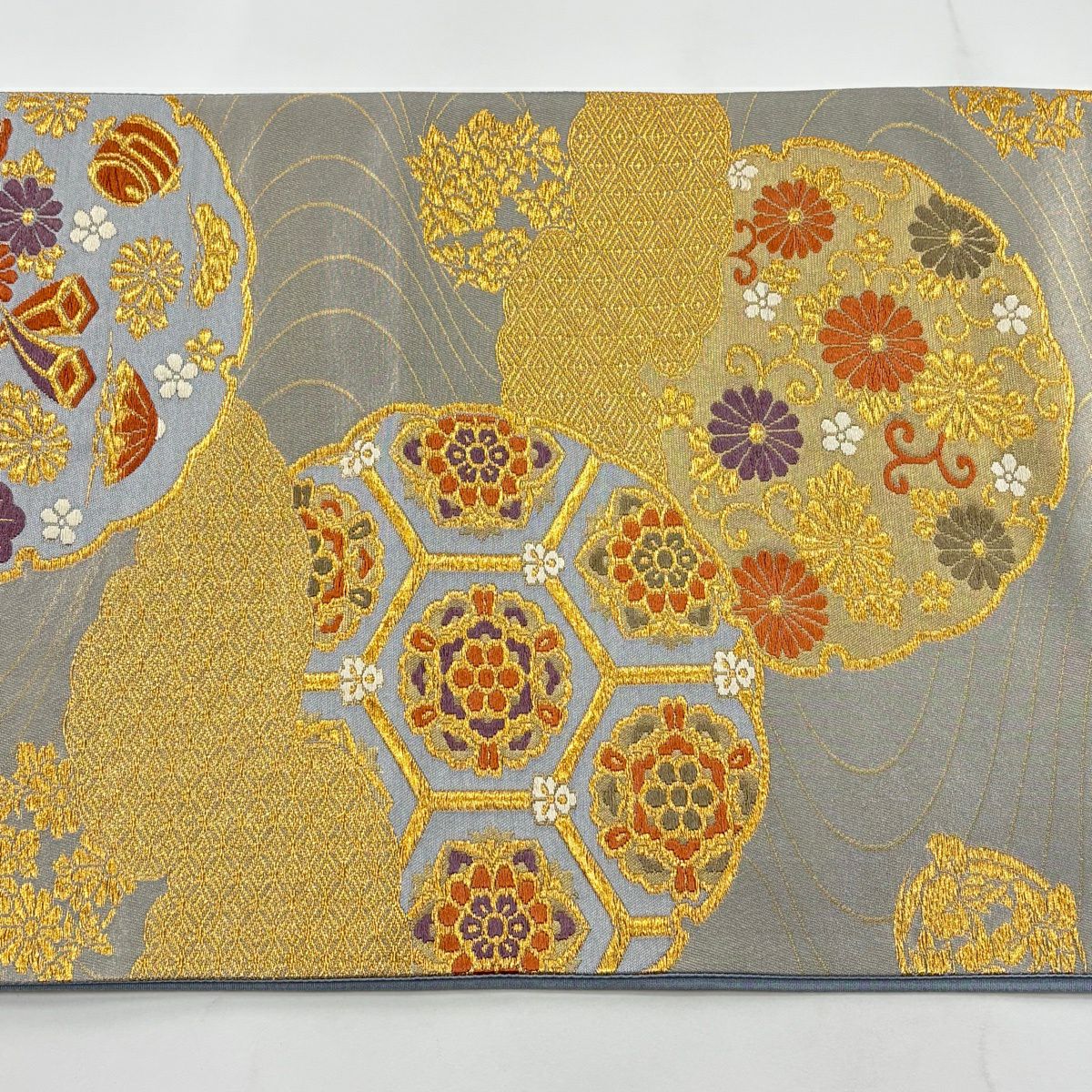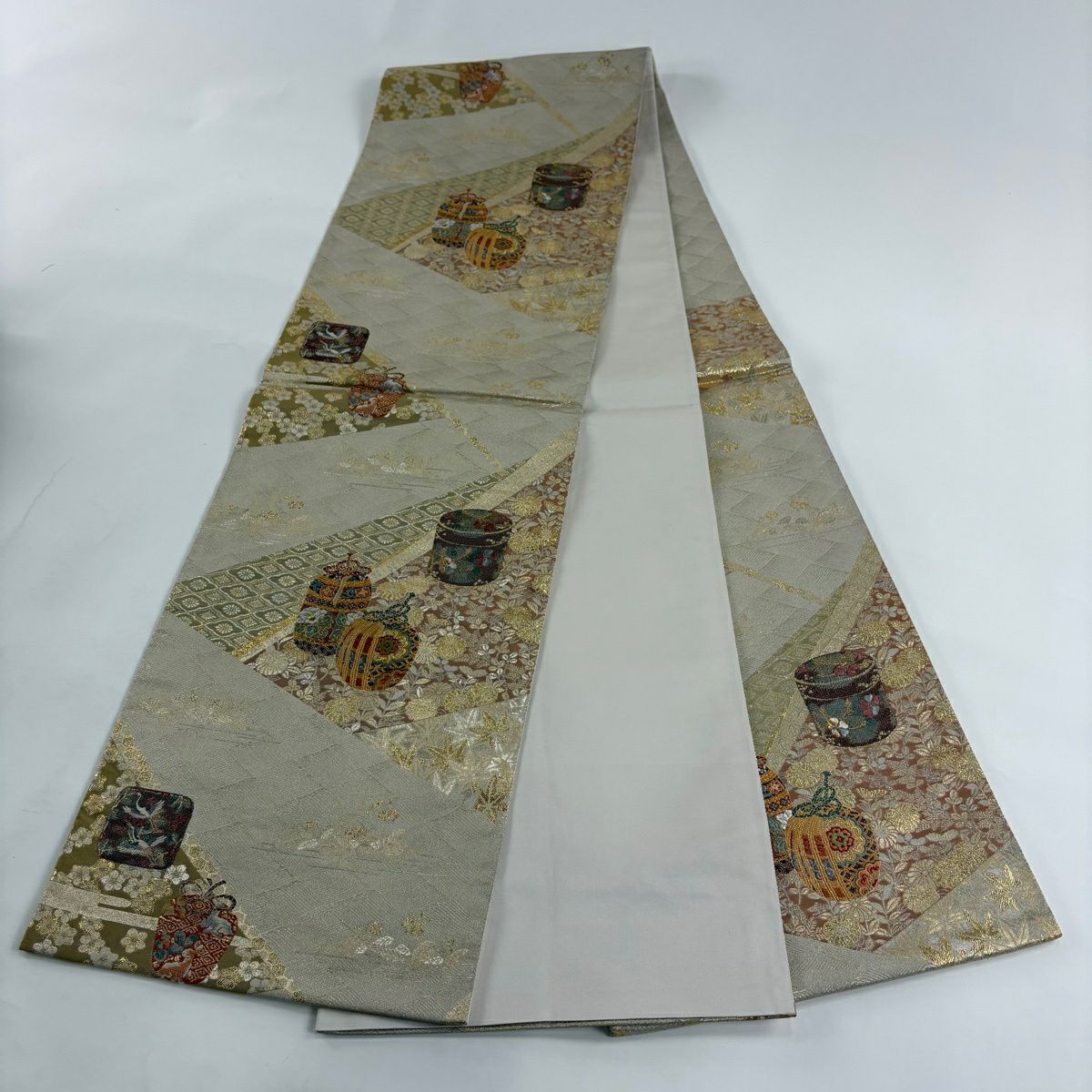 【美品】 袋帯 秀品 幾何学模様 金銀彩 箔 灰色 六通 正絹