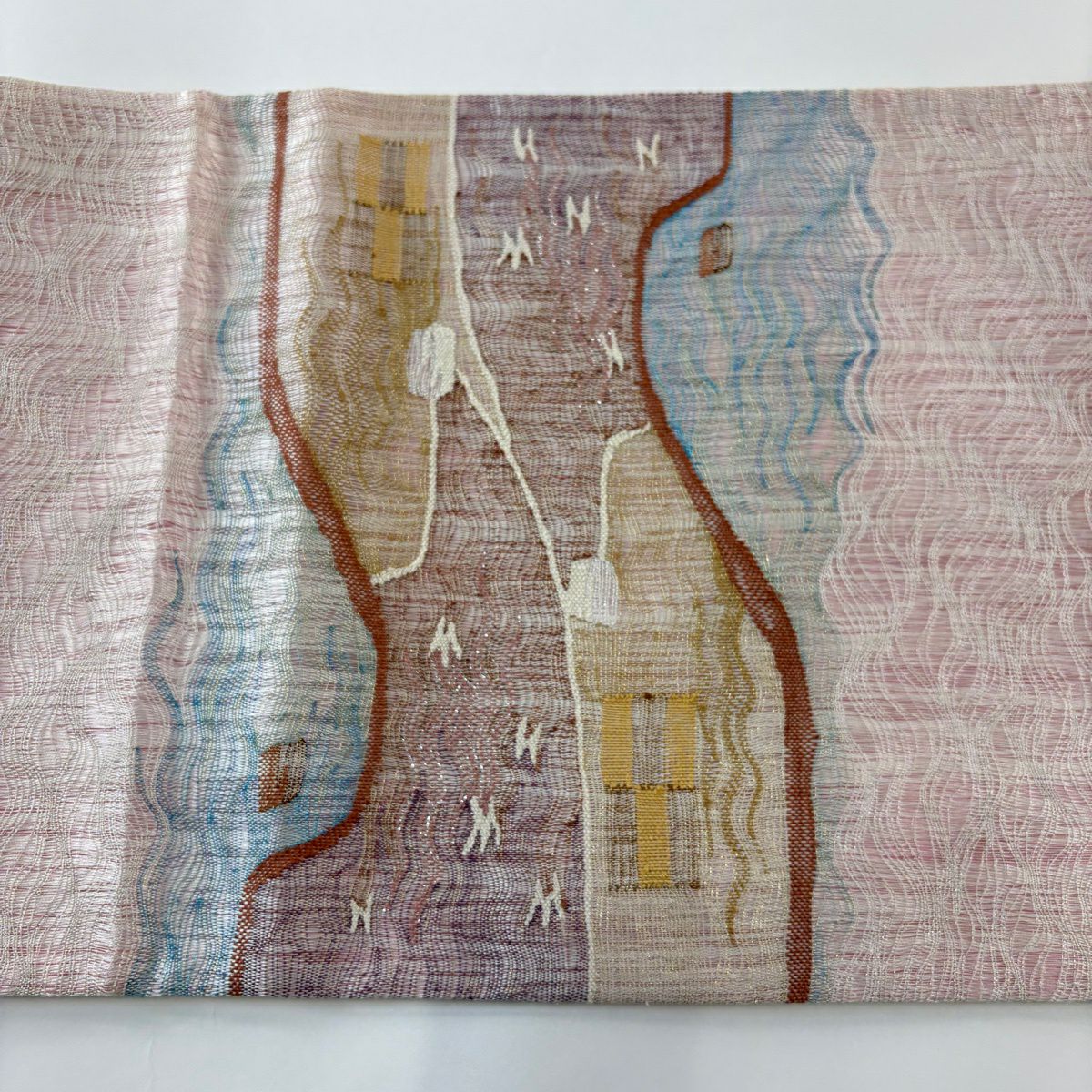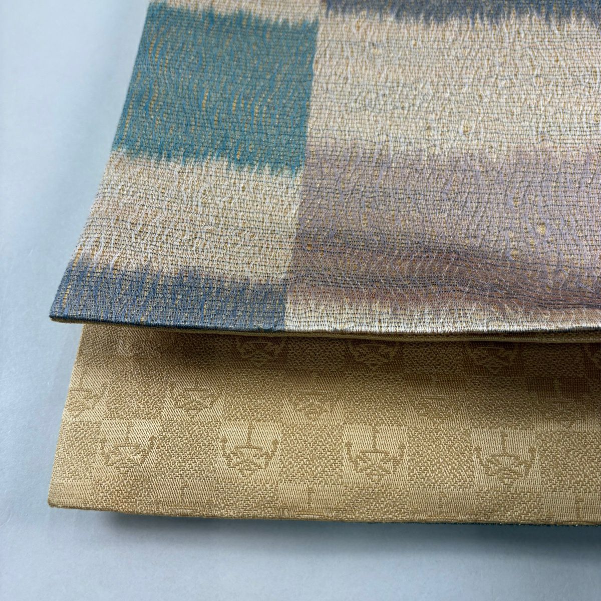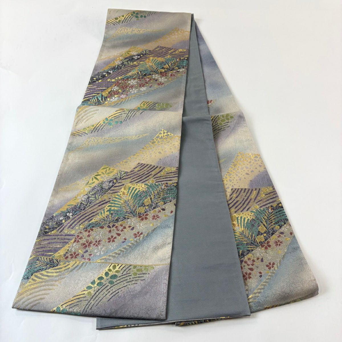 【美品】 開き名古屋帯 秀品 幾何学 金銀彩 銀糸 灰紫 正絹