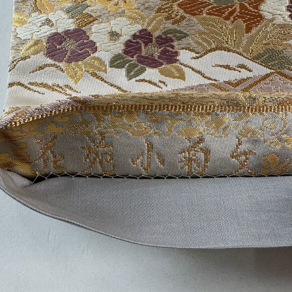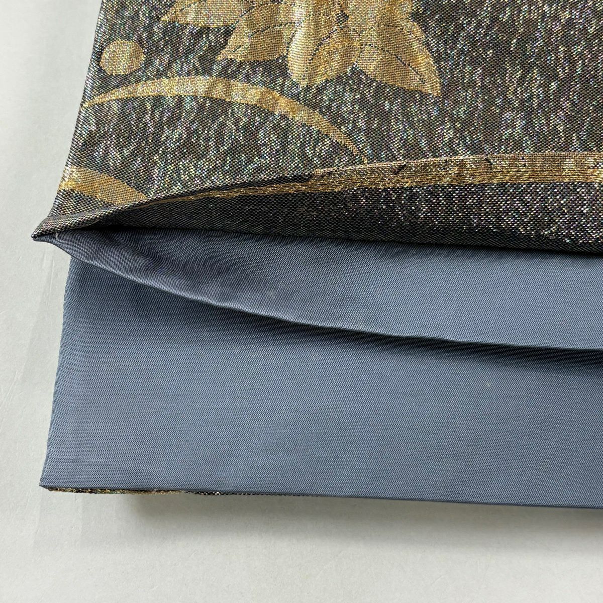 【美品】 袋帯 秀品 お仕覆 草花 箔 金糸 灰茶 六通 正絹