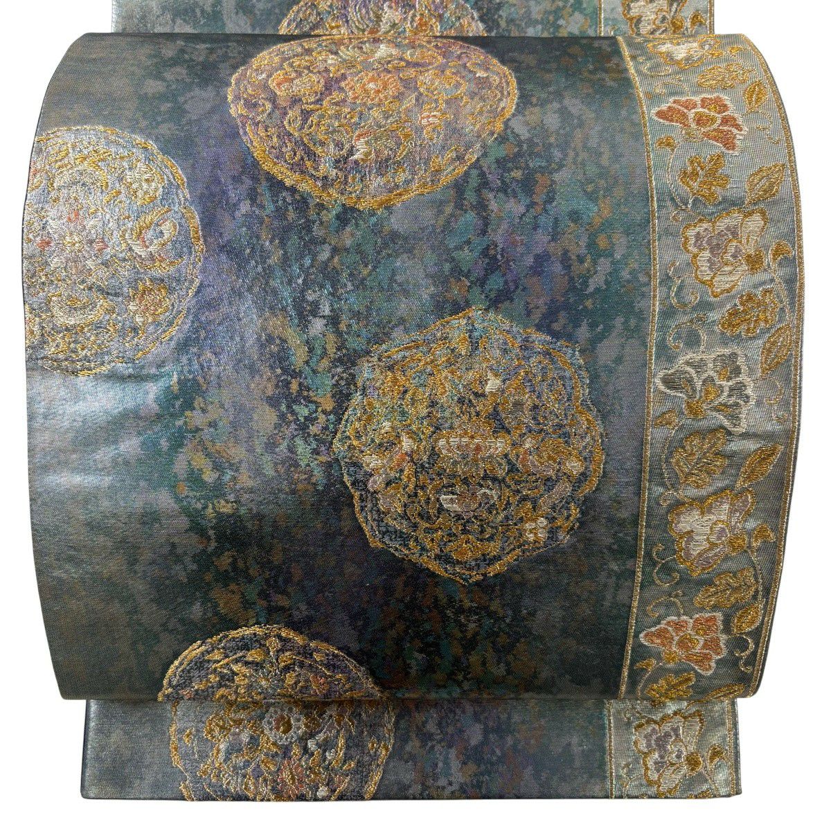 【美品】 袋帯 秀品 雪輪 草花 金糸 唐織 銀色 六通 正絹