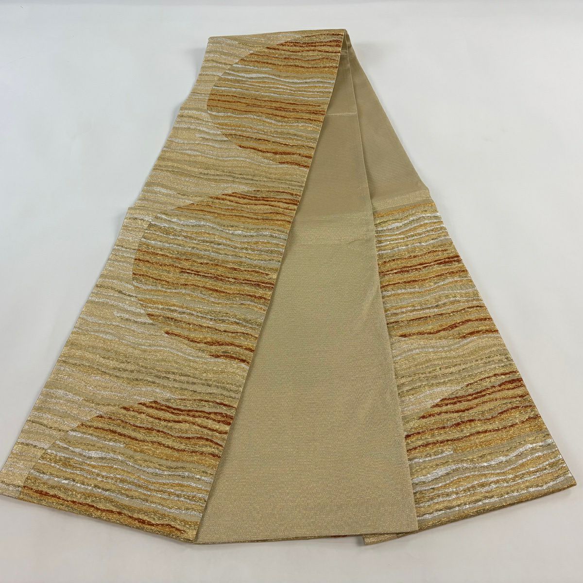 【美品】 袋帯 秀品 段縞 箔 金糸 ベージュ 全通 正絹