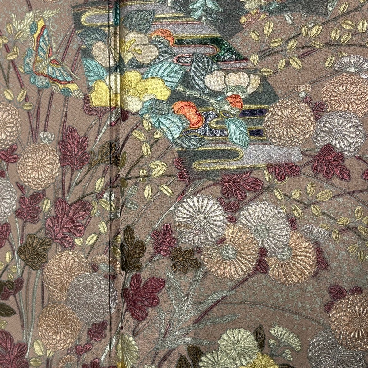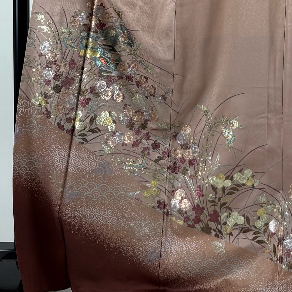 50%OFF 振袖 身丈172cm 裄丈67.5cm L 袷 御所車 松竹梅 金通し 金彩 茶色 正絹 秀品 K50